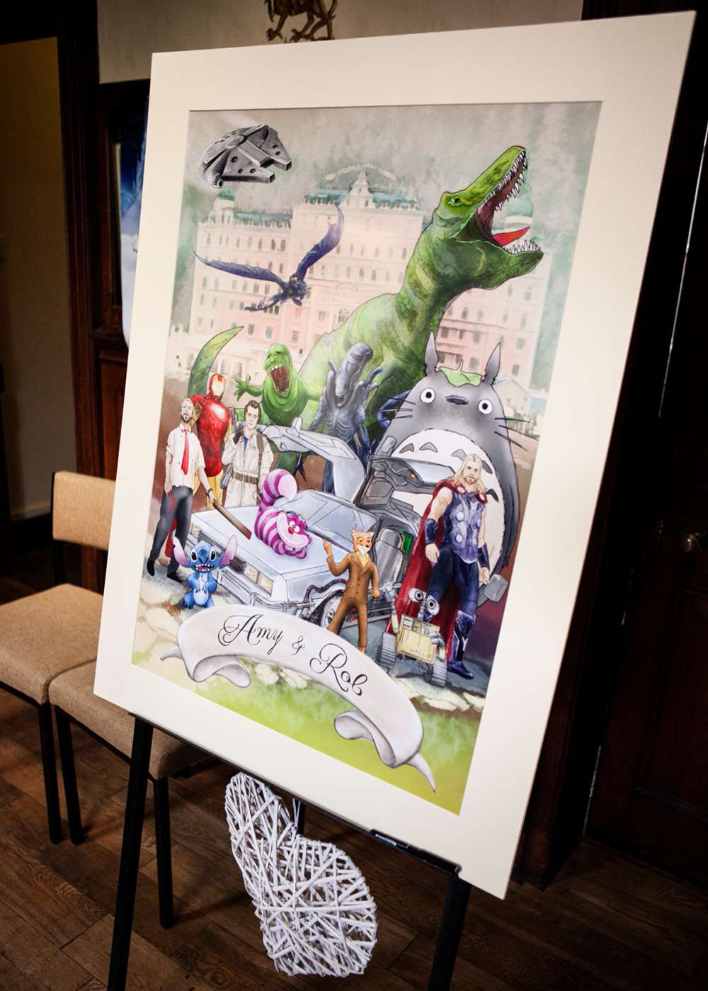 “Our wedding was casual, fun and a little bit vintage, with a dash of film references thrown in for good measure”, said Amy. “We also both love the 1950s so there was some influence from there as well, particularly in my outfit. We are both big film fans so we wanted to embrace our love of cinema by including our favourite characters in the wedding invites to give a hint at what the day had in store.”