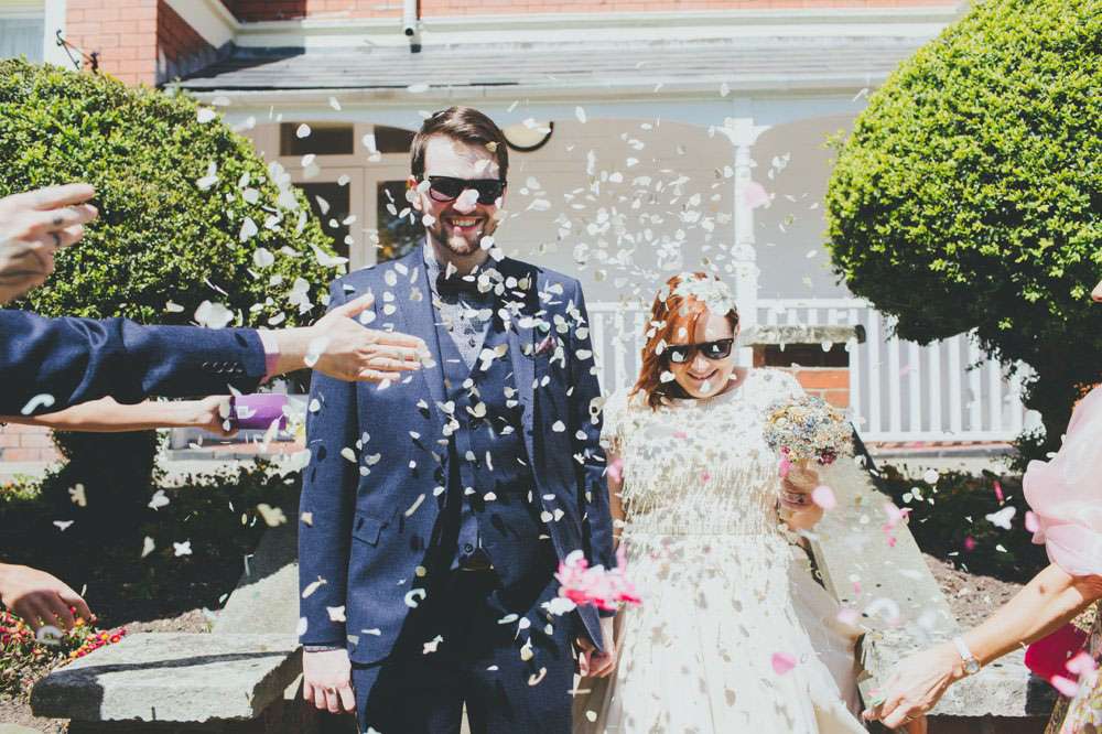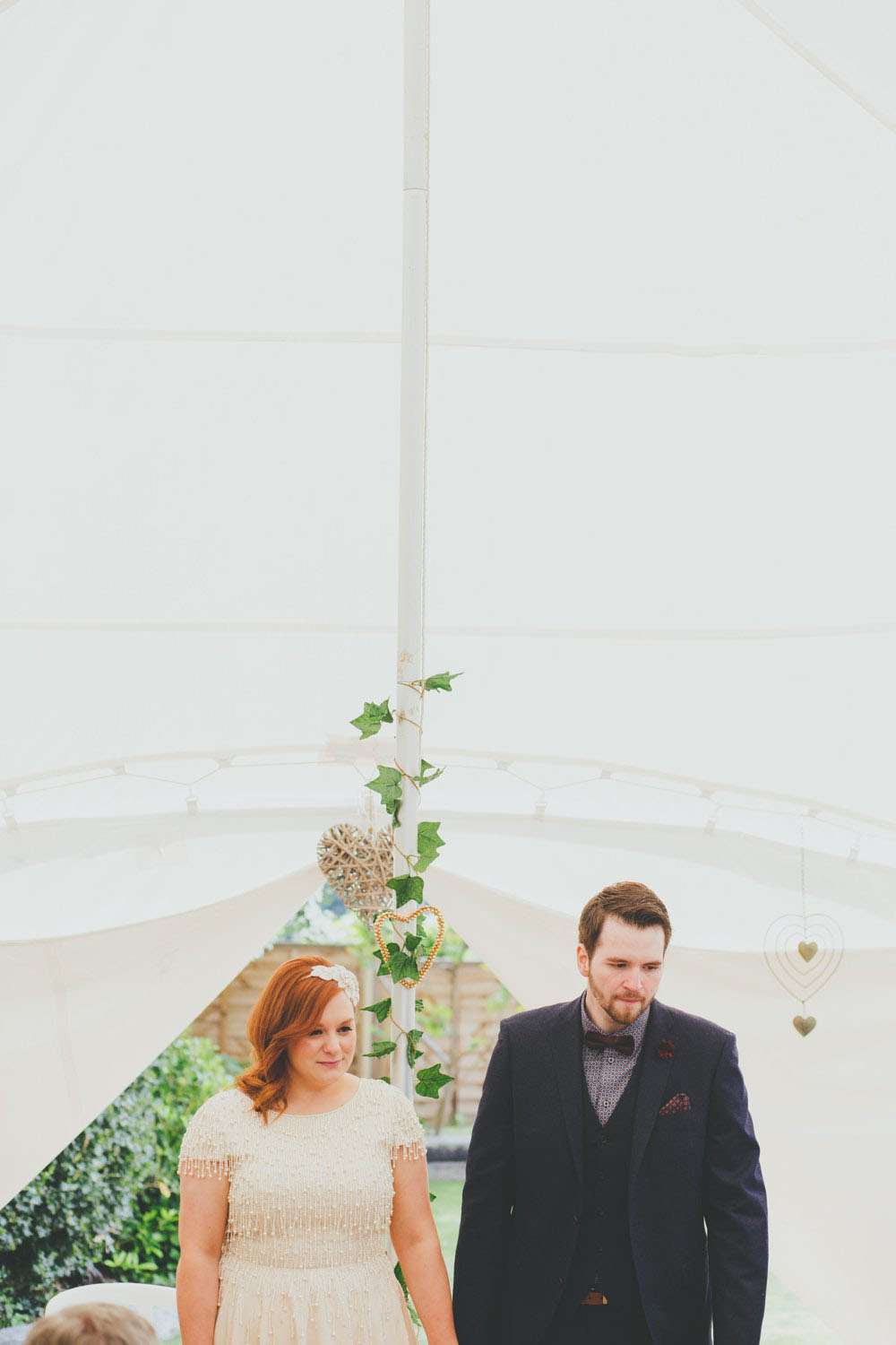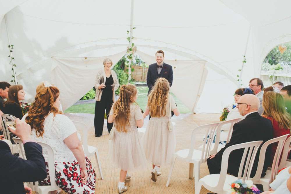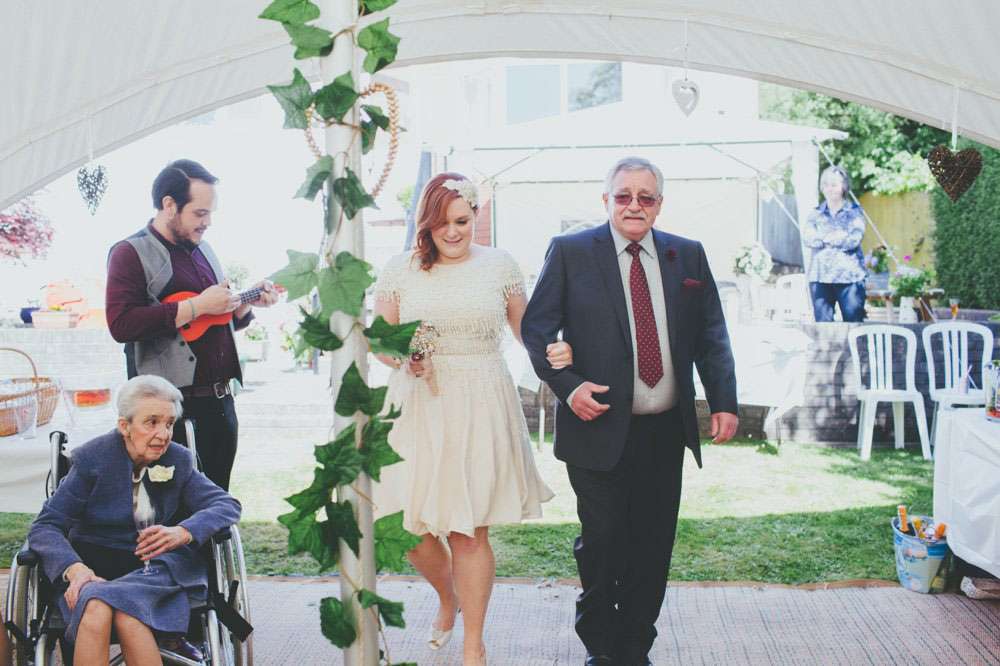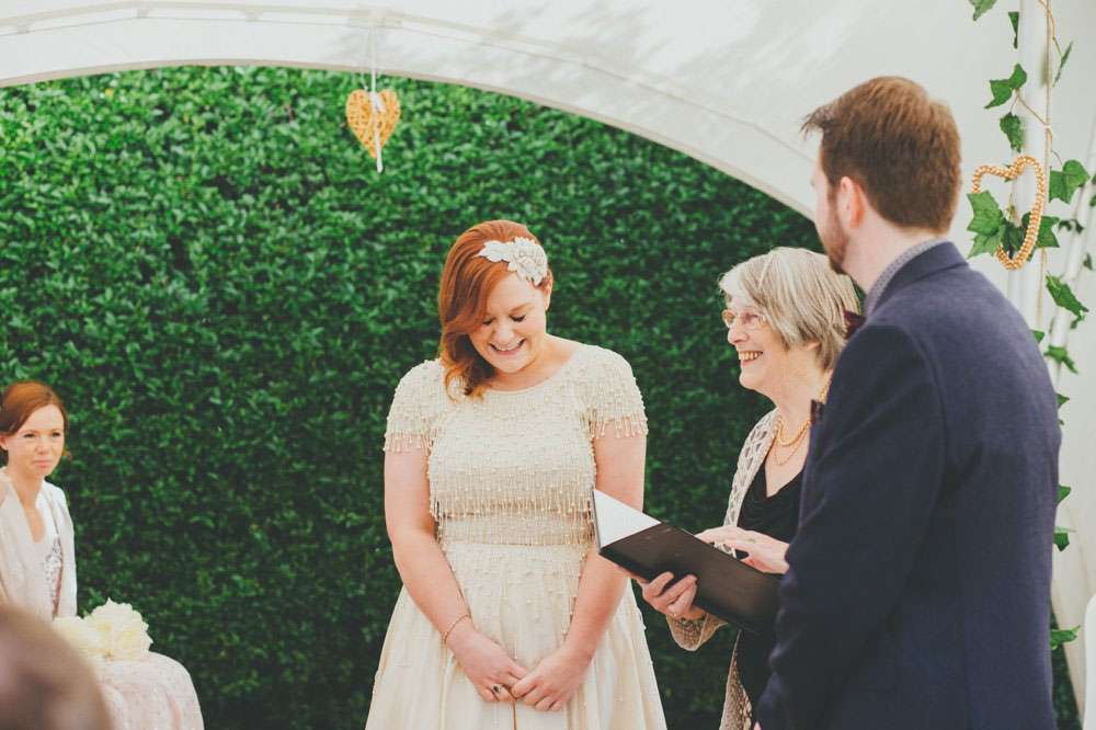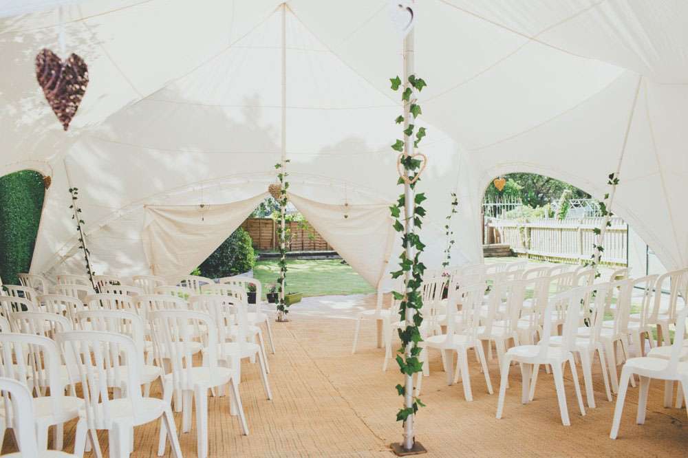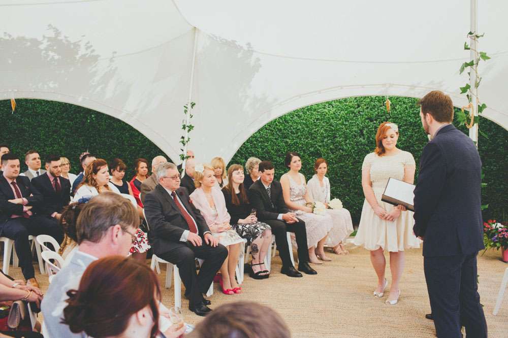 “We had a lot of trouble finding a ceremony venue we really loved and didn’t just want the standard registry office ceremony”, explained Amy. “Then we read the ‘How to plan a wedding‘ series on Rock n Roll Bride at the beginning of 2014 and it inspired the idea of having our ceremony in my parents’ back garden. It was by no means a foolproof plan, but once my parents were convinced (which didn’t actually take much doing) the ball was rolling. Since we’re both not religious a Humanist ceremony seemed like a perfect fit, and once we met Lisbeth, our celebrant, we knew we’d made the right decision. The ceremony she delivered was tailored to us, and our friends and family really enjoyed how personal it felt.”