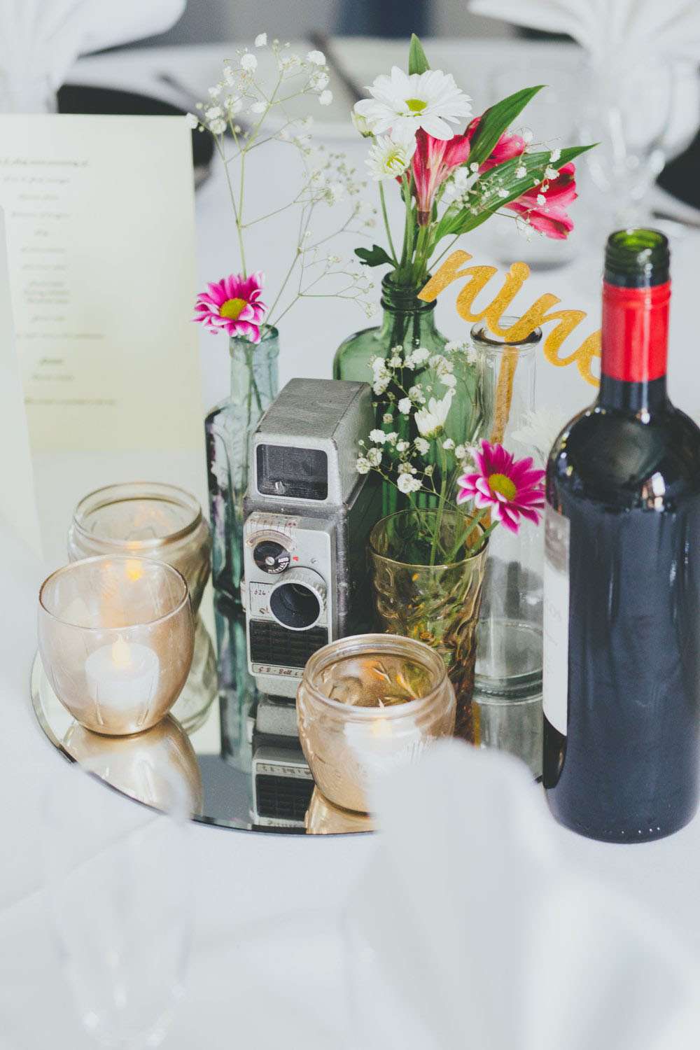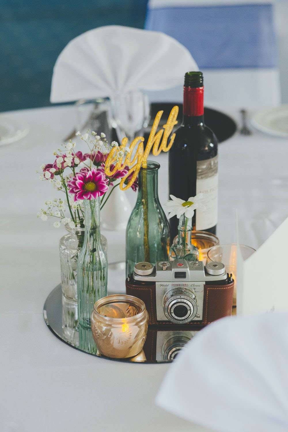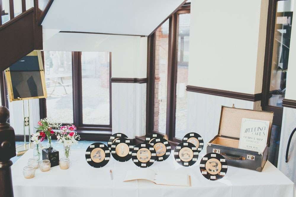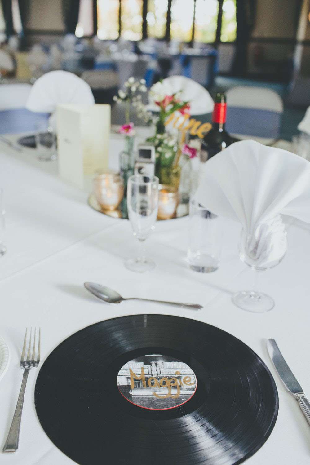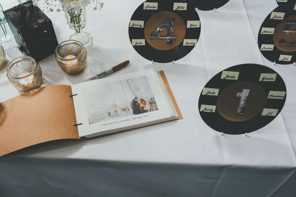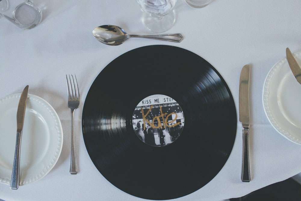 After the ceremony, they went to Mansion House, in Newport for the legal bit, then to Peterstone Lakes Golf Club for their reception. “We both spent a lot of time collecting vintage cameras and bottles for the centrepieces, and collecting vinyl for the guests’ place mats and table plan. We made stickers for the centres of the vinyl using black and white images of cinemas and hand-wrote the guests’ names for the place mats, and stencilled the table numbers and sprayed the stickers gold for the table plan.”
