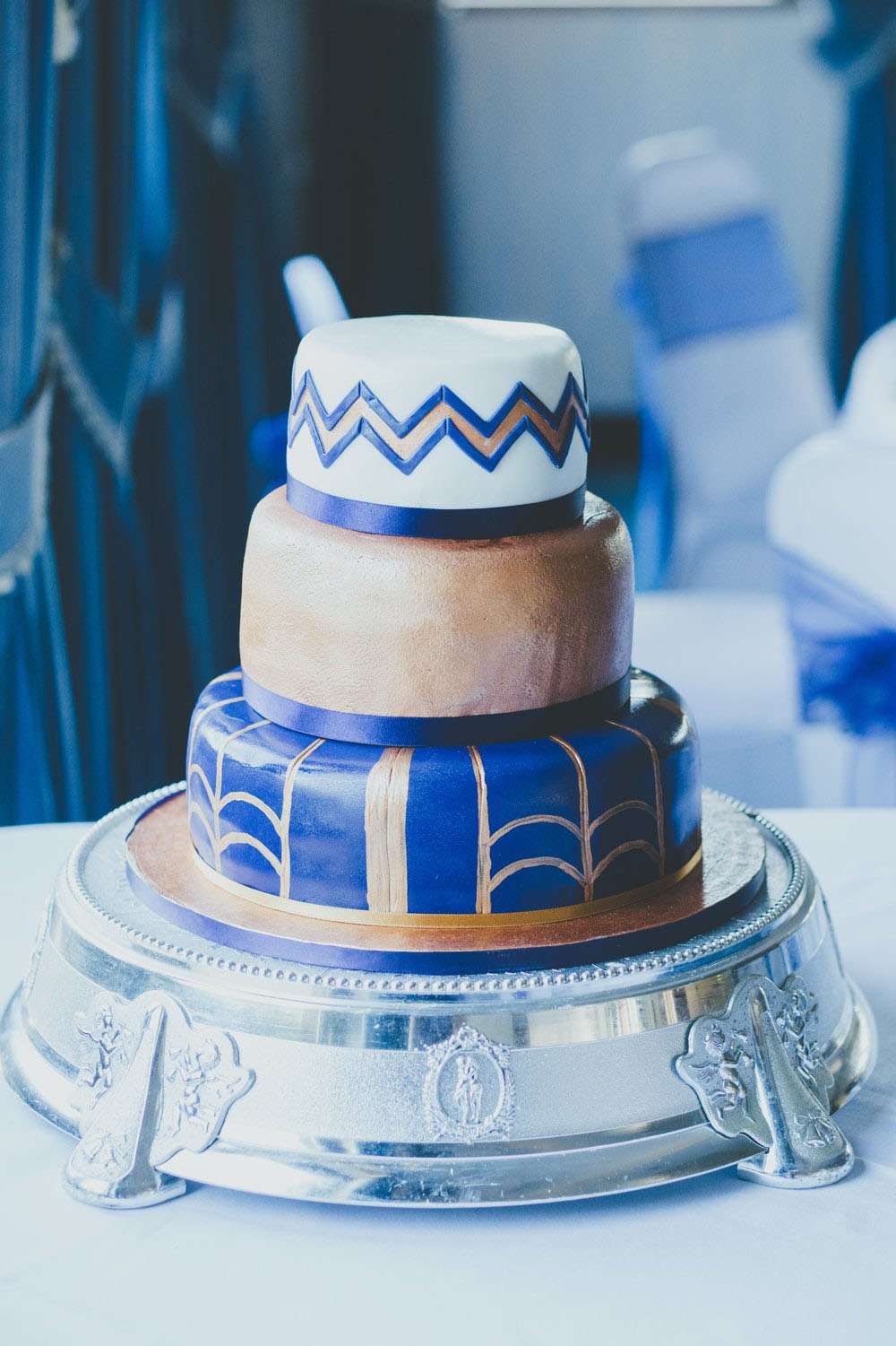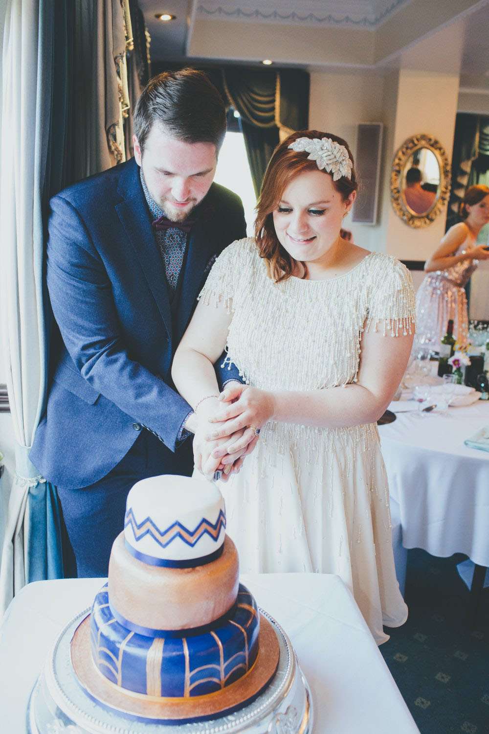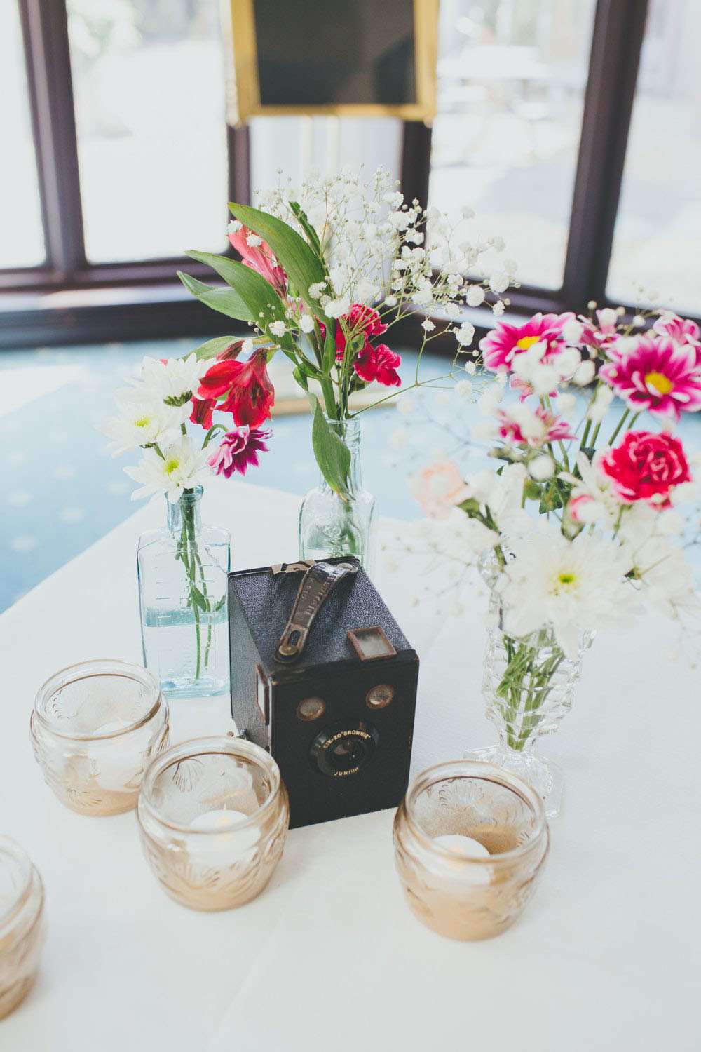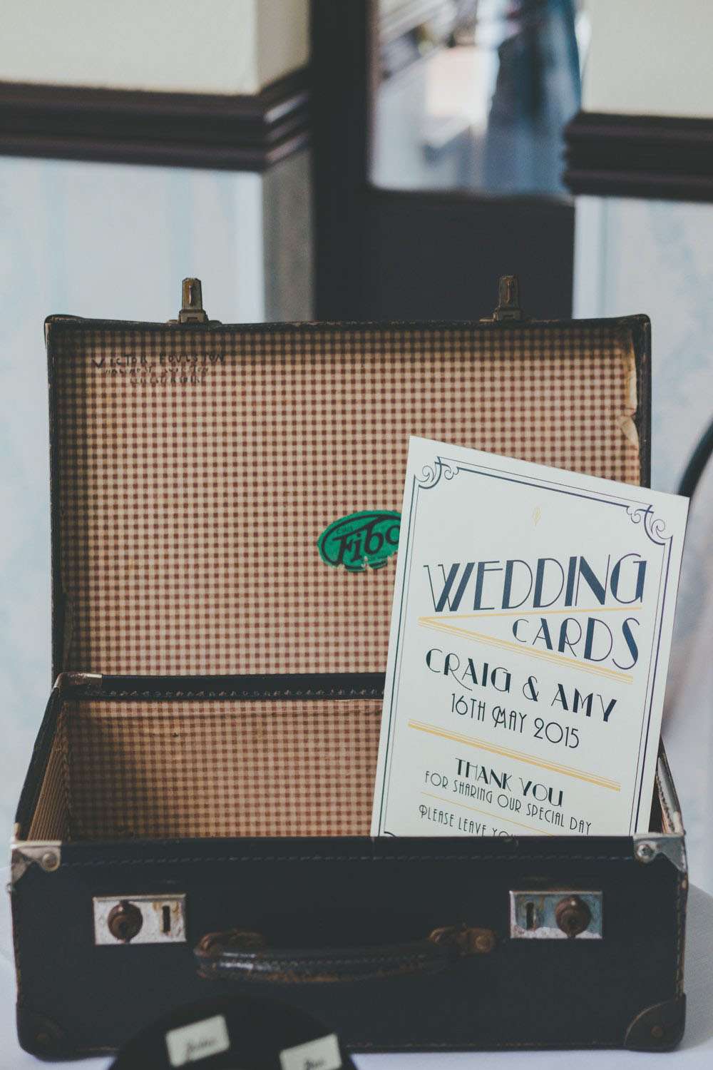 After the ceremony, they went to Mansion House, in Newport for the legal bit, then to Peterstone Lakes Golf Club for their reception. “We both spent a lot of time collecting vintage cameras and bottles for the centrepieces, and collecting vinyl for the guests’ place mats and table plan. We made stickers for the centres of the vinyl using black and white images of cinemas and hand-wrote the guests’ names for the place mats, and stencilled the table numbers and sprayed the stickers gold for the table plan.”