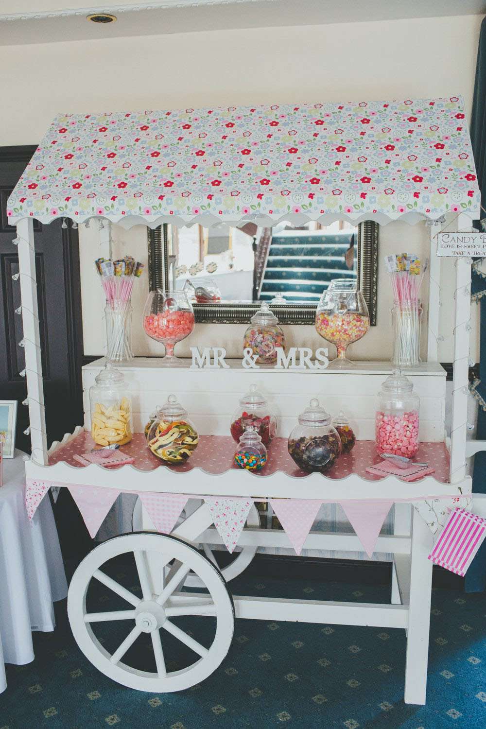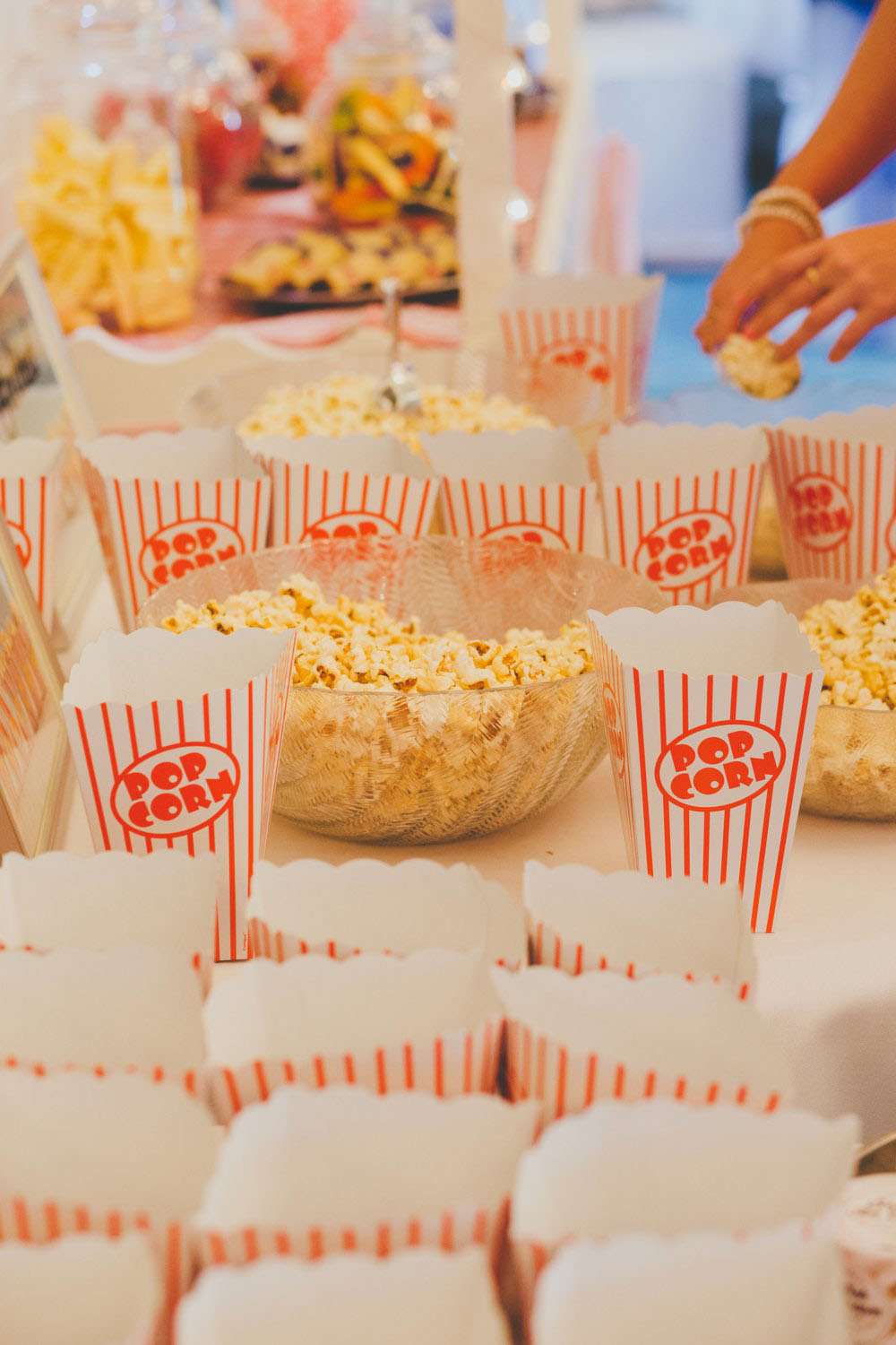 “The idea we constantly held in mind was to create a wedding we would really want to be guests at”, she continued. “Cue plenty of food and drink! We chose a hog roast and barbecue for dinner which everyone loved, plates were piled high and guests were encouraged to go back for seconds. The dessert was cinema snacks (candy cart, popcorn, and mini tubs of ice cream) as it fitted with our love of cinema and it encouraged guests to help themselves to as much or as little as they liked, and got everyone out of their seats and mingling.”