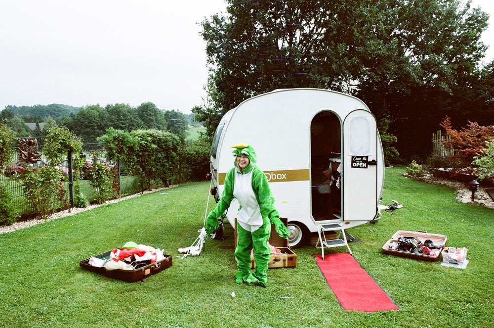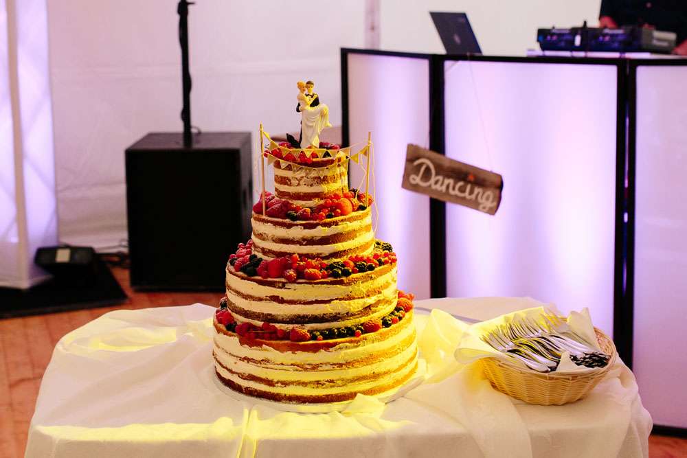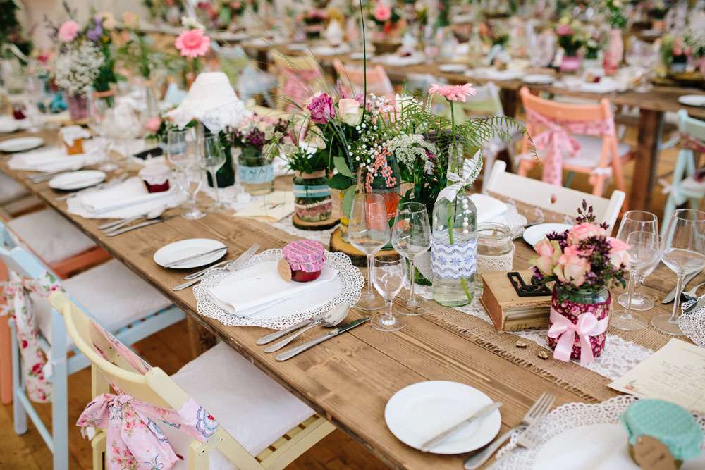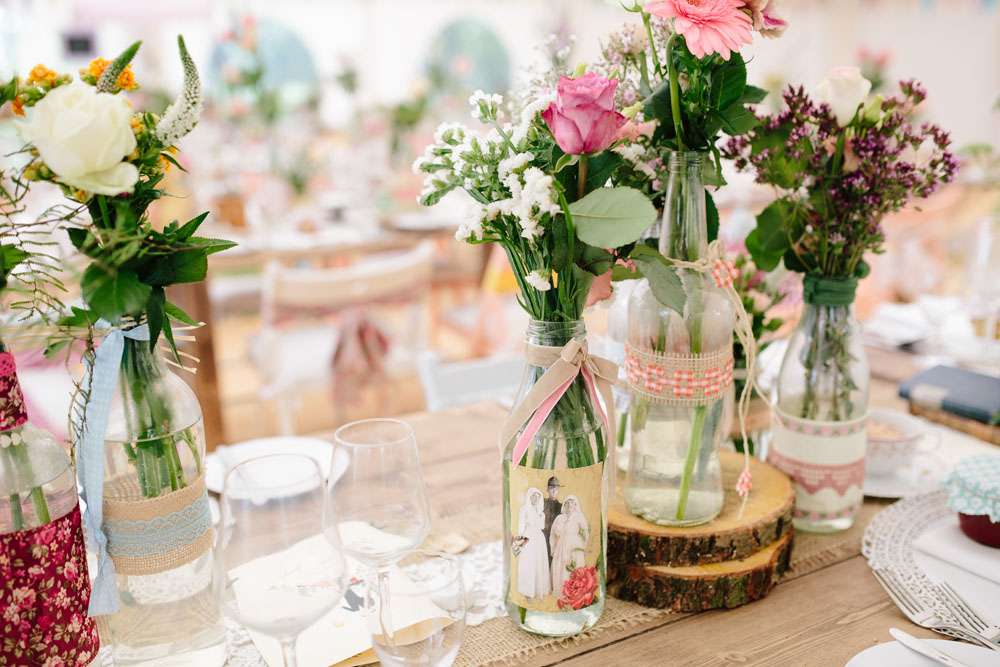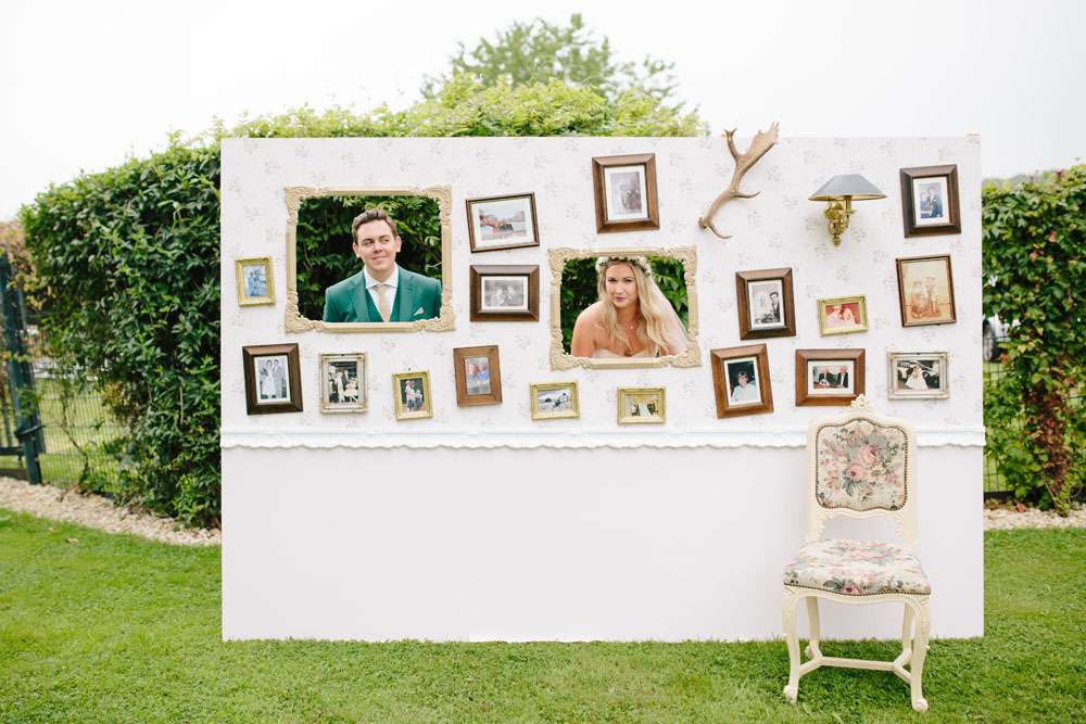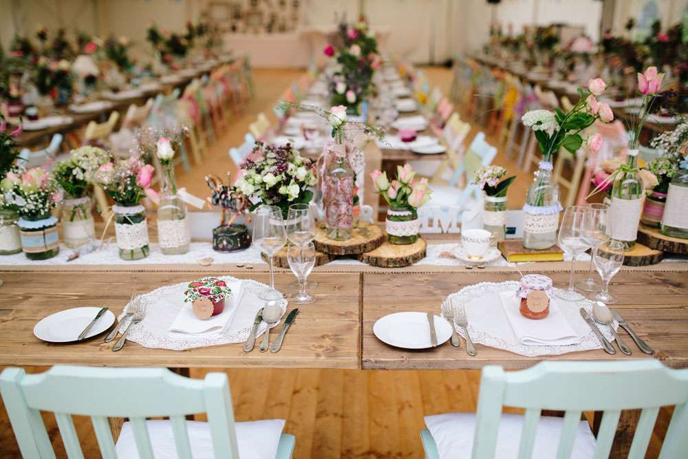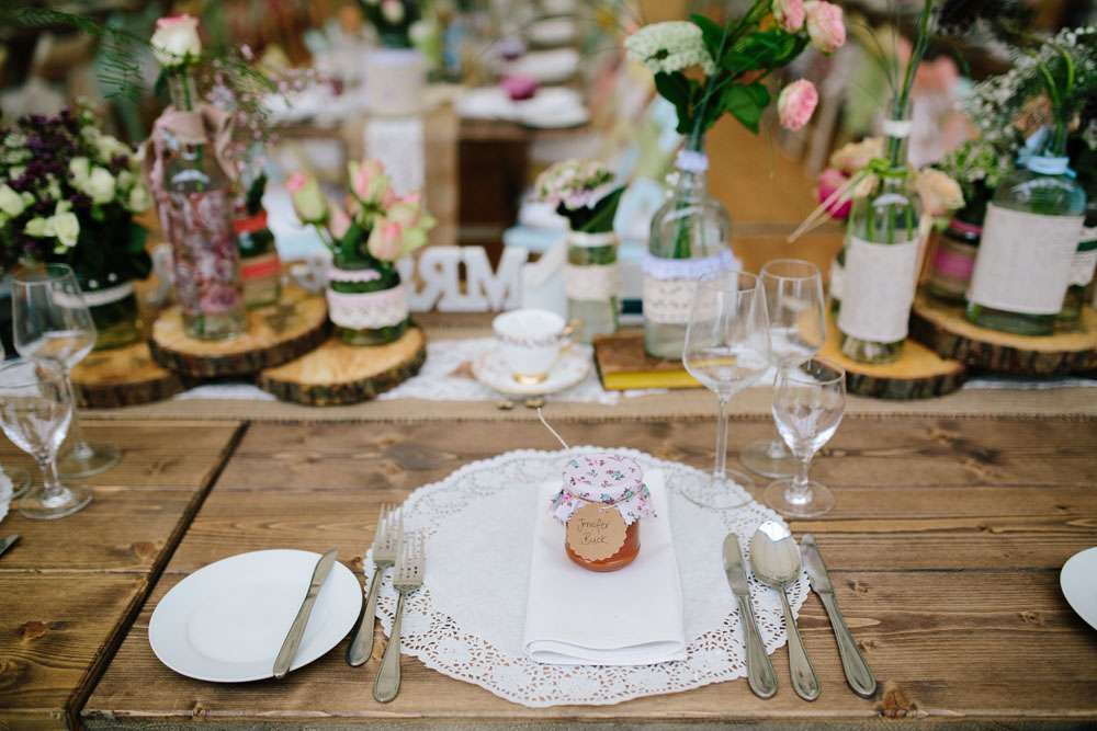 The couple made almost everything at their wedding, it took eight whole months of daily crafting! “We made about 350 differently decorated jars for our table decorations, my dad sawed tree slices from an old collapsed tree for us, my uncle helped us built all the four funfair booths, we made our vintage living room photo wall from scratch and decorated it with old family wedding photos from both sides. Each guest received a jar of home made vanilla rhubarb strawberry jam as their name tag, my aunt sewed the bunting from mountains of old fabrics everyone collected, and my mum and I spent hours decorating the cans that we attached to the bridal car and decorating the bridesmaids hangers with their initials. Jordan’s sister made the home made lemonade for our lemonade stand.”