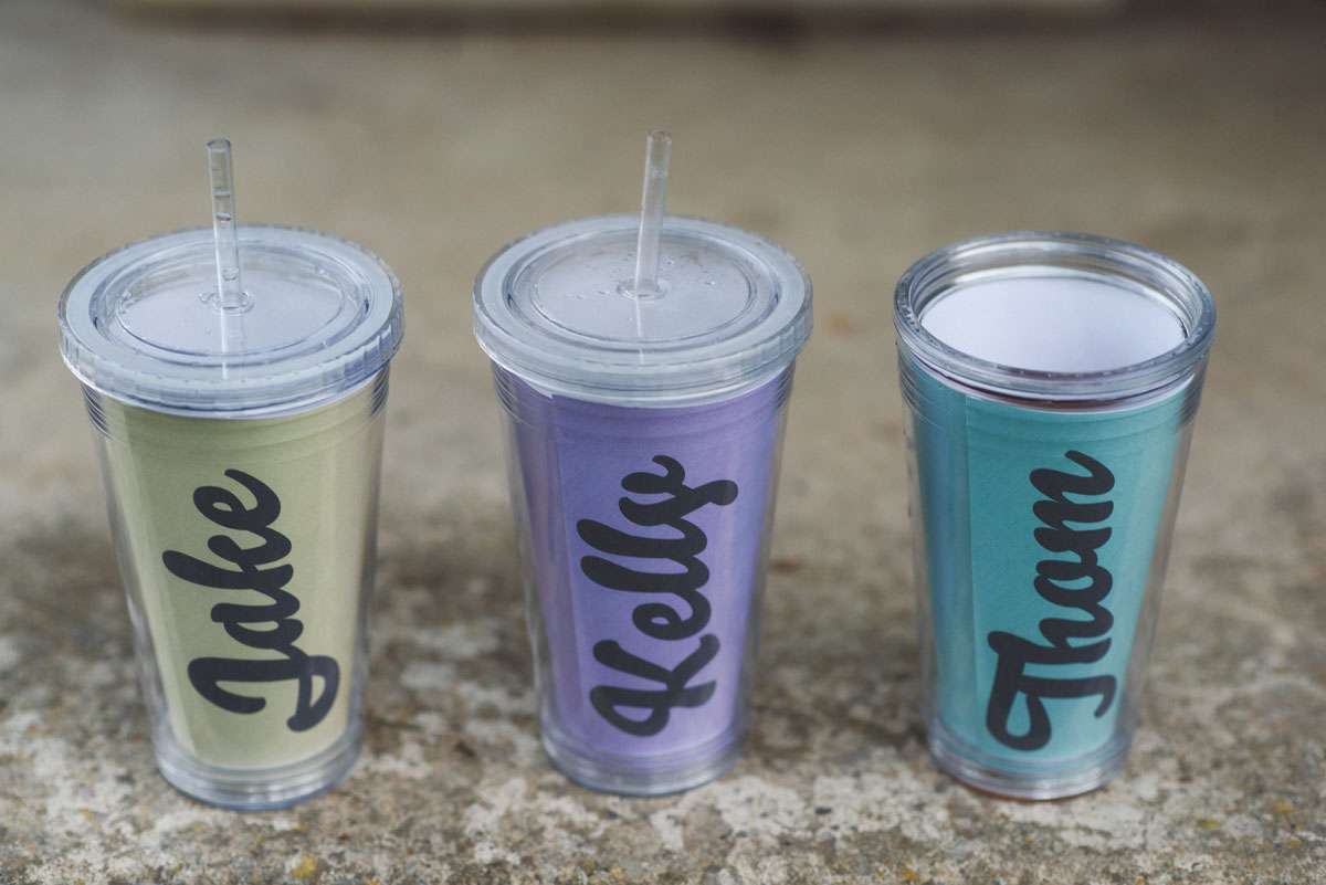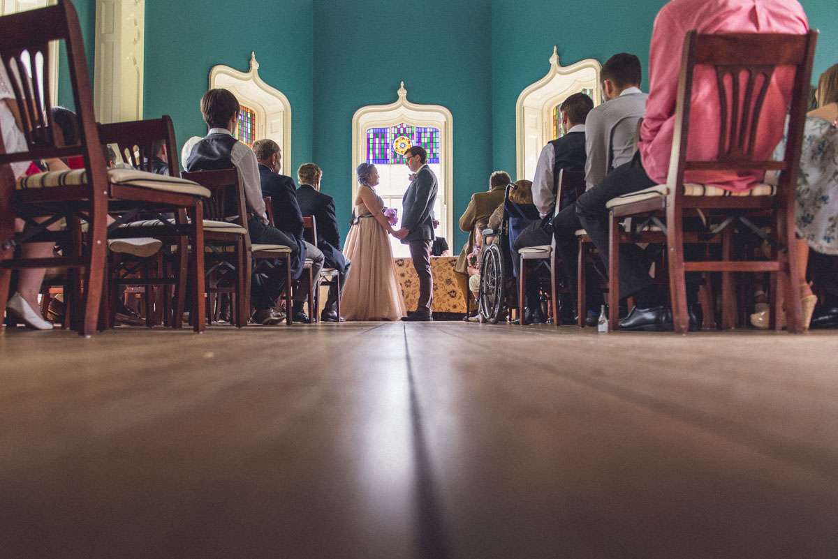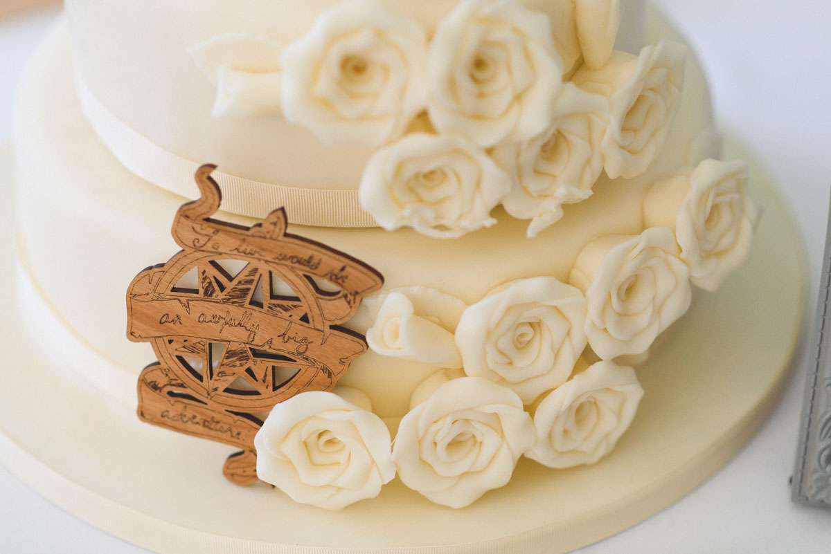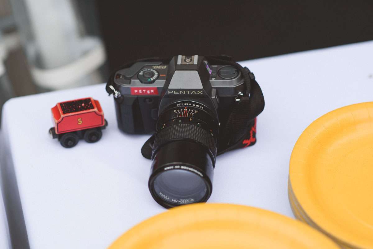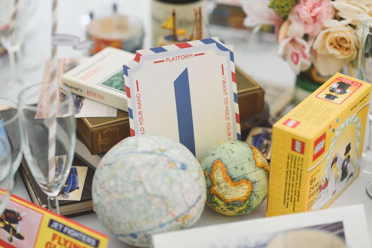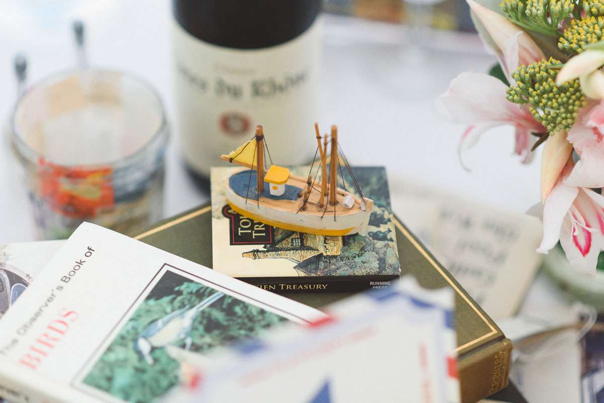 “We looked for every opportunity to pour ourselves into the décor”, said Kelly. “Most of the decorations were handmade by us or things we already had. As part of the invitations we sent postcards of Wiltshire and Boise for RSVP, using the returned cards as bunting decoration. The flower bunting flags were handmade by a family friend and surrounded the entire marquee. We had small frames all around with quotes from some of our favourite books and every table had a small tower of books from our own collection. Thom designed the table numbers, each featuring a different lyric from The Beatles. Thom also has a collection of vintage cameras we placed around the tables. The trains were all from the Brio set that Thom and his brothers grew up with. And I designed the little iSpy cards. For fun we got a whole bunch of the foam flying gliders for every place setting. Thom’s dad also made the large sized Jenga!”