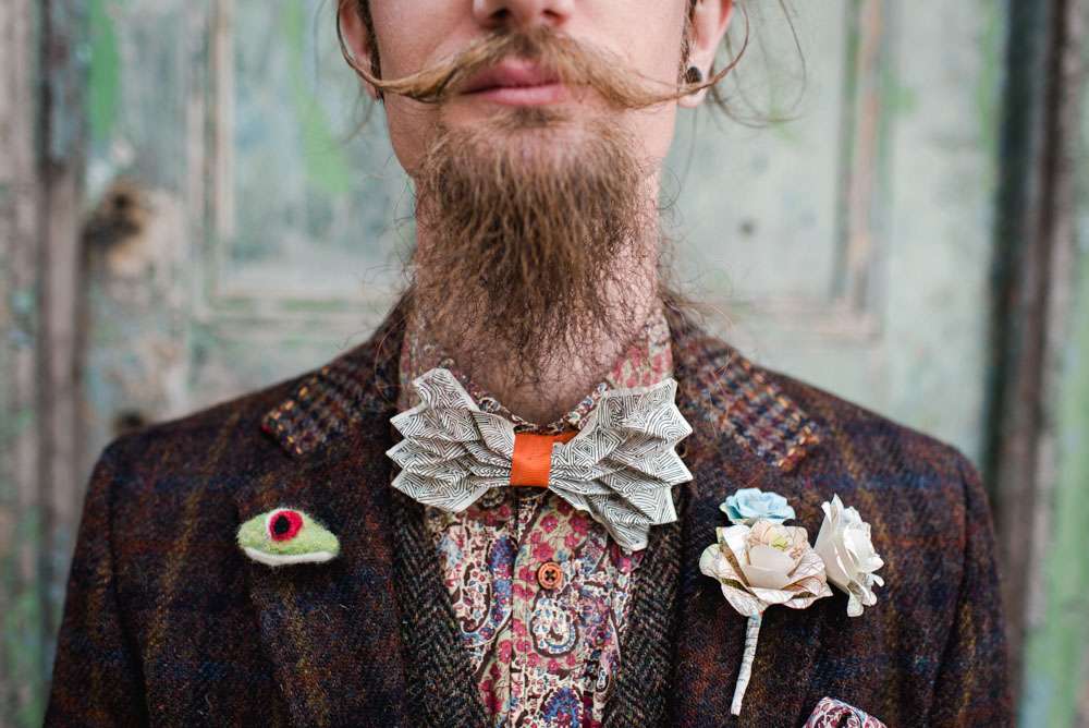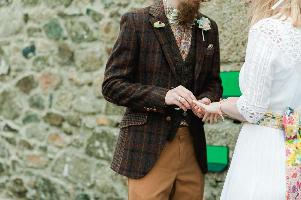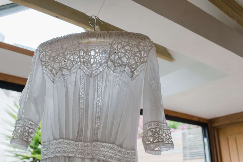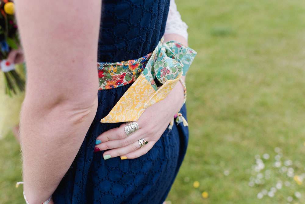 Frog’s dress was an Edwardian tea dress, “I found my dress at the magical Days of Grace in Budleigh, Salterton”, she said. “Having struggled for months and months with trips across the UK to find something suitable, I came across the Days of Grace facebook page. They were in Devon but I was going to be there for someone’s hen do the following weekend so I sent a desperate request for an appointment and got the loveliest reply from Linda saying they could fit me in! I was convinced I would never wear a white dress, but as my dress ended up being white I decided to add some colour and personality to it in the form of a sash. I have always loved Liberty fabrics, paisley in particular (hence husband’s attire) and spent ages selecting the perfect fabrics to join together in my colour splash. My mother in law put it together for me, she also made the silk slip to protect my modesty, the dress was very see through! I was going to dye the slip my favourite shade of green, but chickened out and stuck with white!”