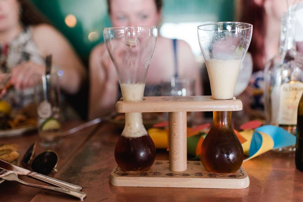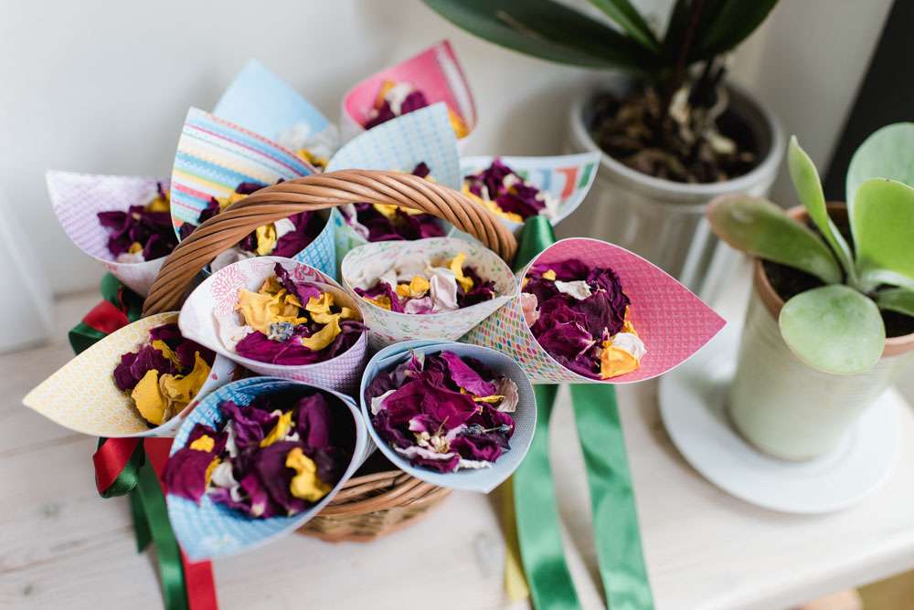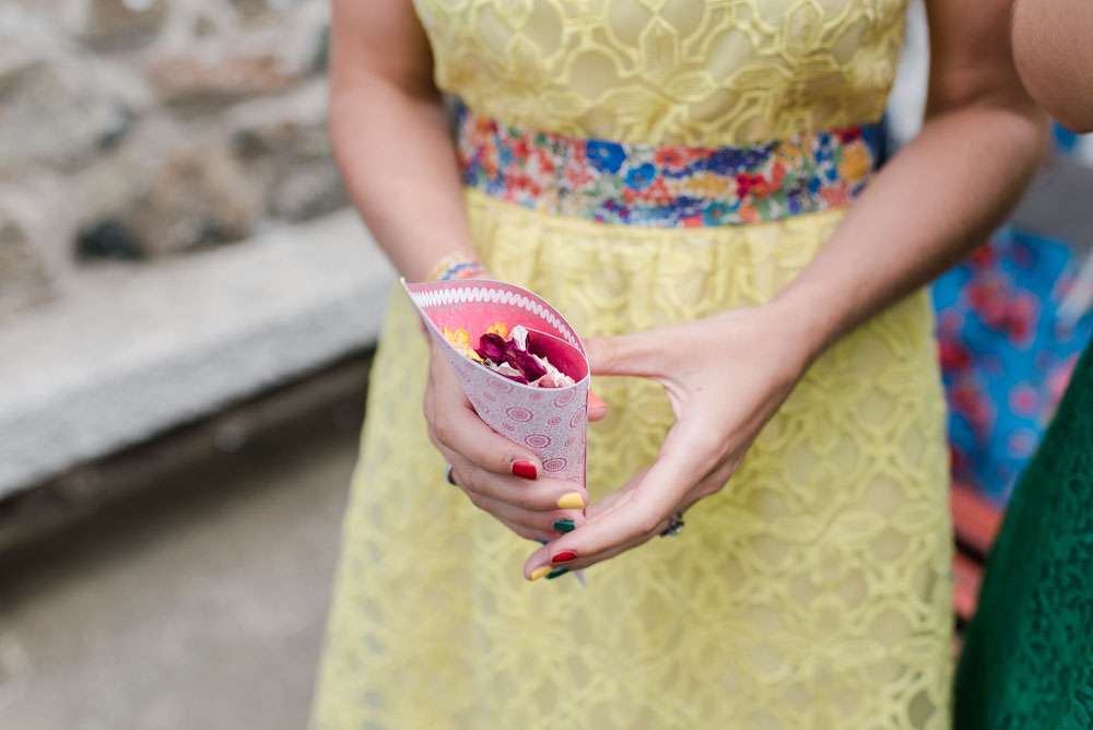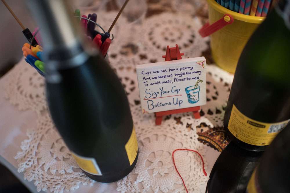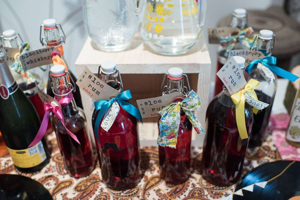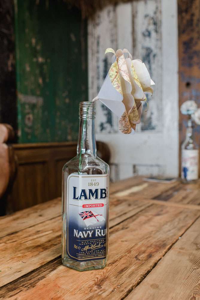 The pair mostly decorated the venues themselves. “We had a lot of stressful moments with the décor, but also a lot of fun creating and planning it”, she explained. “Weaselʼs sister made giant paper pom poms for the studio, along with loads of paper windmills for the ceremony. We had homemade bunting from all our friends. We collected loads of rum bottles (this was a pleasurable chore) to decorate the tables, our friends lent us little LED strings to put inside and we added beautiful paper flowers.”