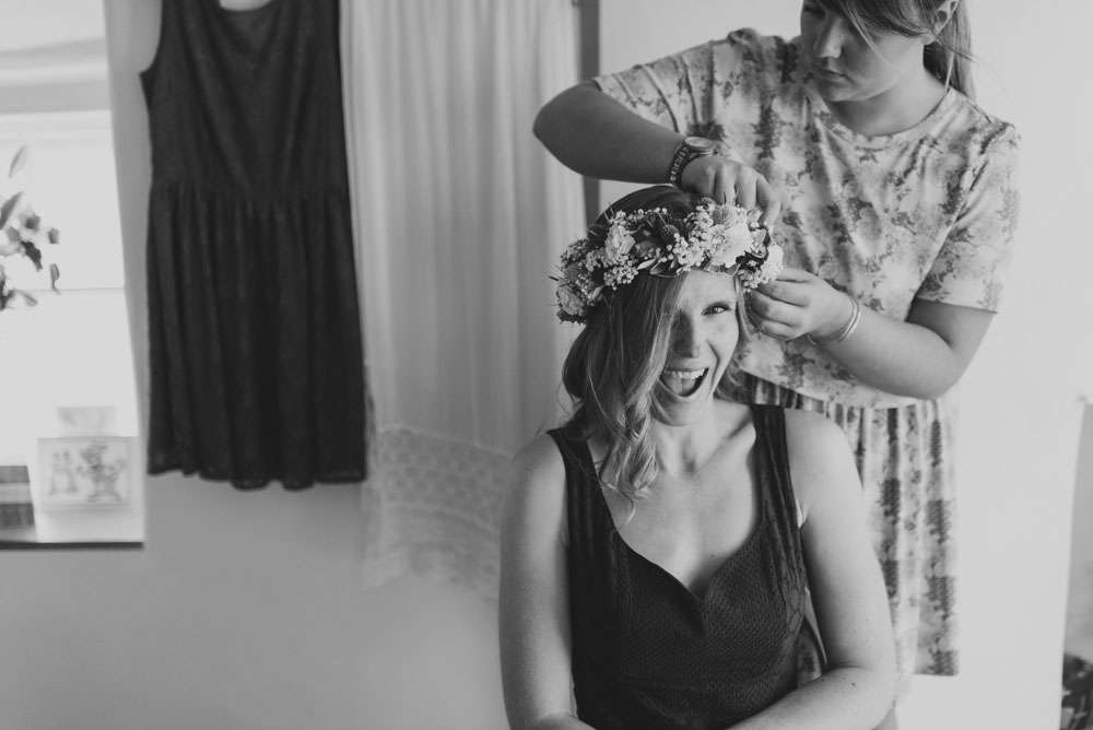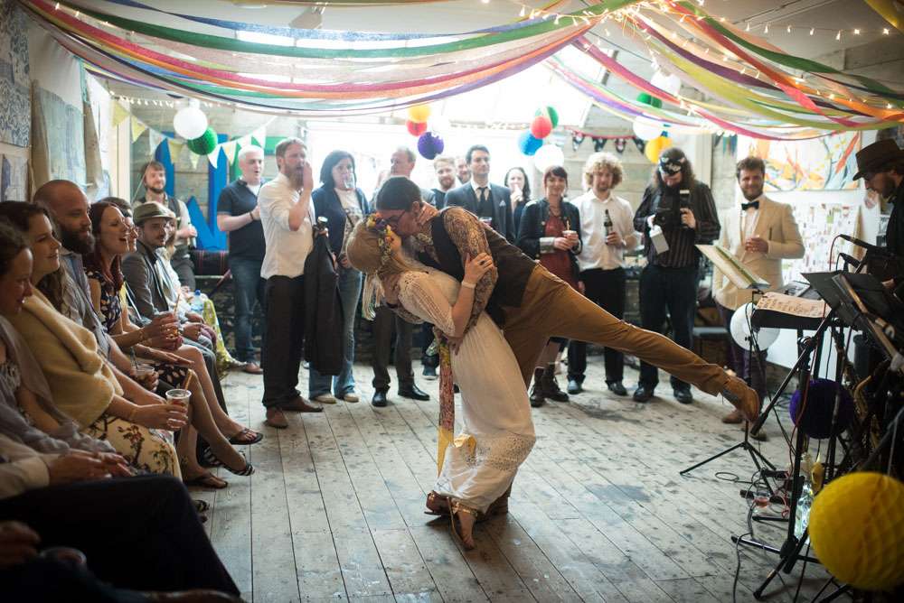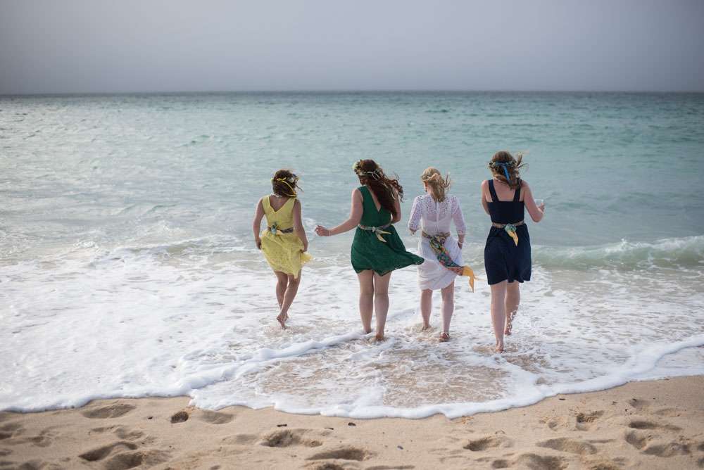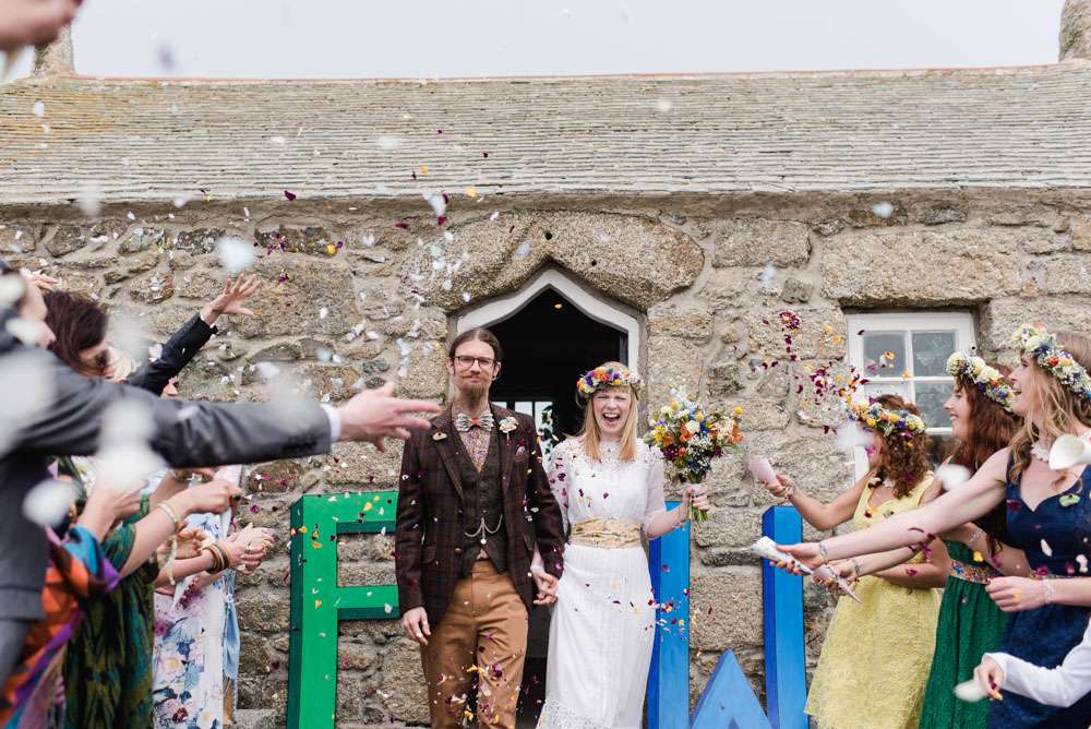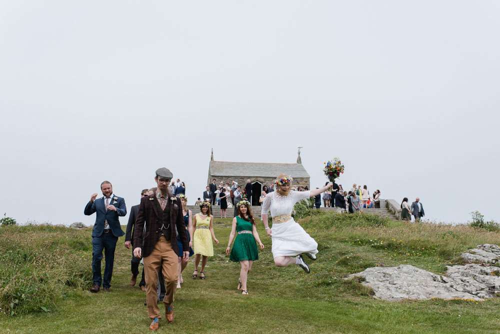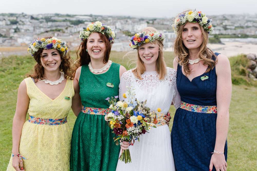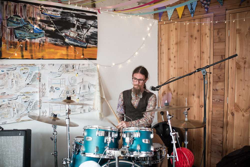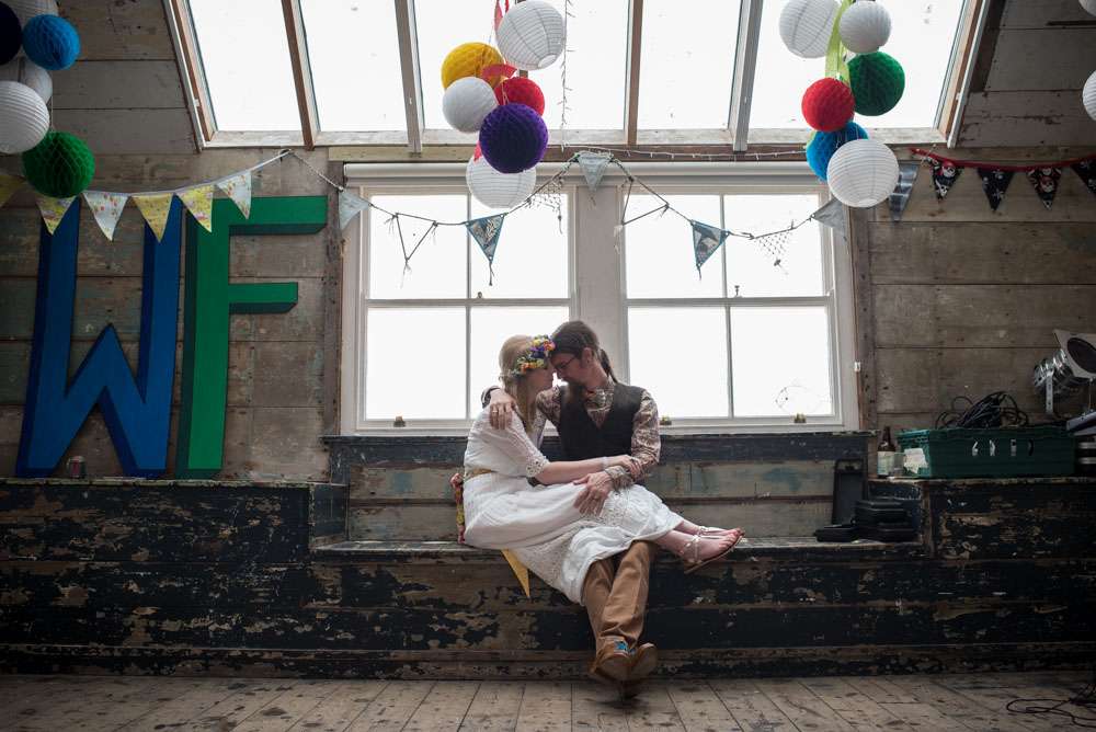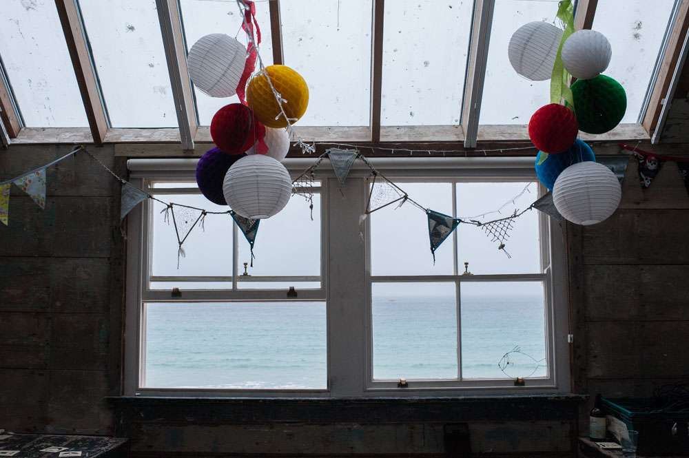 “I wouldn’t say we had any particular inspiration, we just followed our hearts to make it reflect us perfectly!” began the bride. “We really struggled to find the right venue initially. We knew we wanted to be in our favourite part of Cornwall, but could not work out exactly where. We wanted something low key and relaxed like a village hall, but just couldn’t find the right thing. We visited lots of small venues, but none could cater for our needs to the whole thing and a price we could stretch to. After visiting Porthmeorʼs open studios, I had a random brainwave. Thinking it would be a long shot I immediately emailed to see if there was any way we could hire a studio. We were amazed when we found out we could! Realising it wouldn’t be right for the whole day we decided we would mix and match all of our favourite venues and that is how we ended up with the chapel and the Crab Shack. Why settle for something when you can have everything you want!? Plus it lead us to our very loose theme: Frog & Weaselʼs Big Day Out in St Ives!”