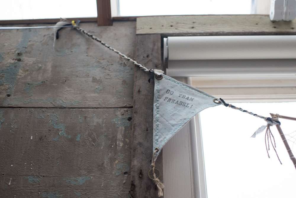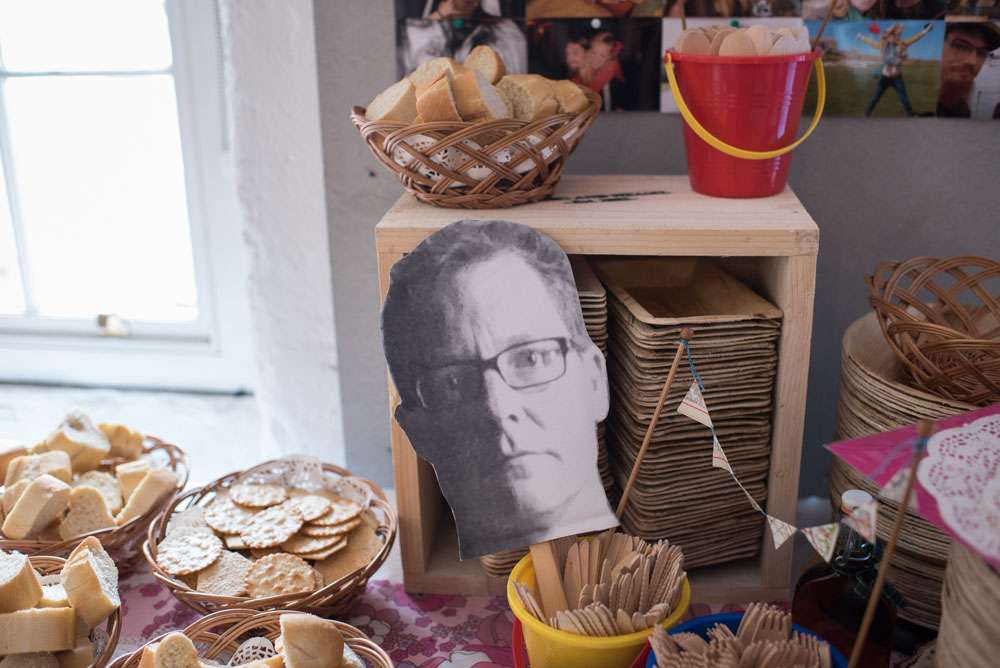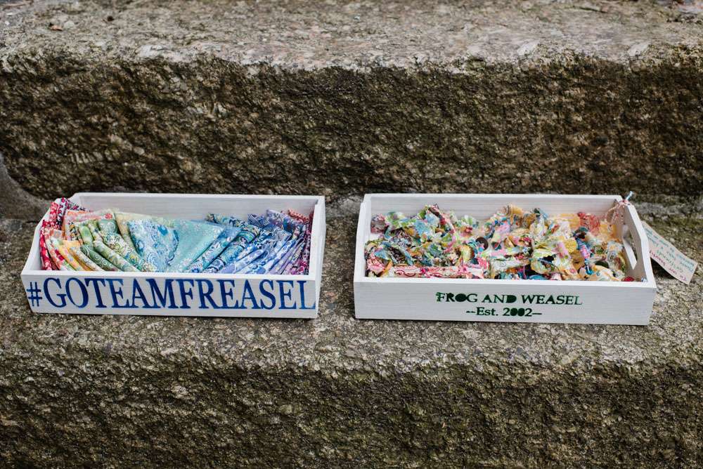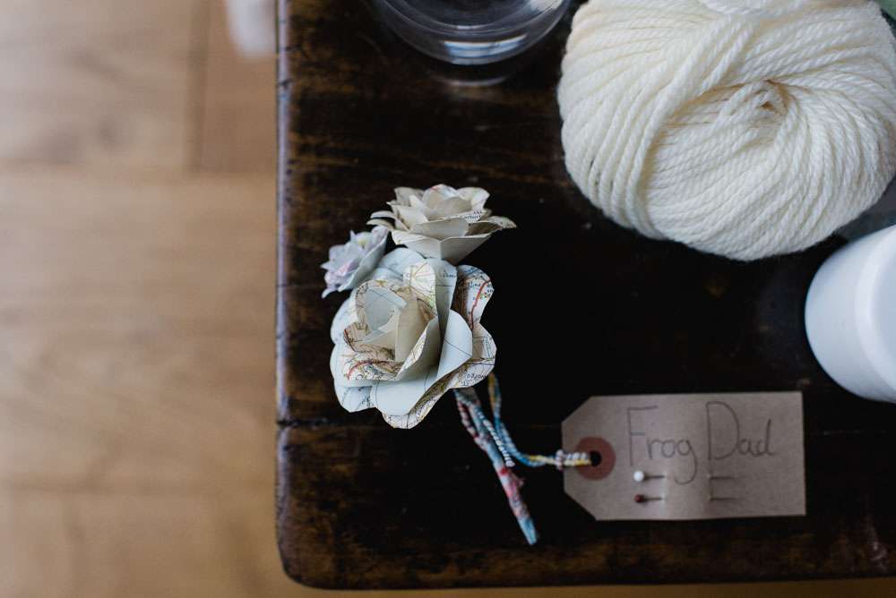 “Weasel spent ages making the flowers out of maps of places we had been or lived. He also made mini ones as lapel pins for him, his best men and our parents. From the leftovers I made mini paper bunting and attached them to knitting needles to decorate the buffet table. We also made directional signs, mini easel signs for the studio, a giant F and W, a cardboard post box and wooden boxes to display food on.”