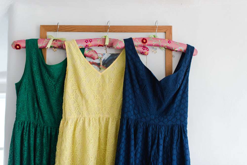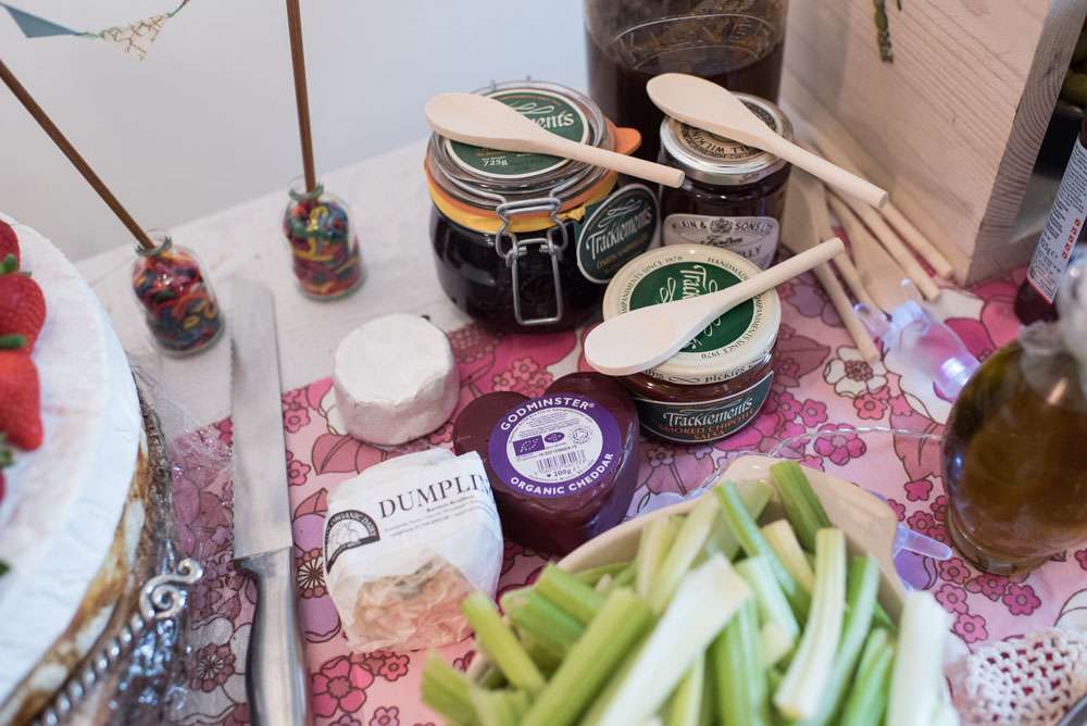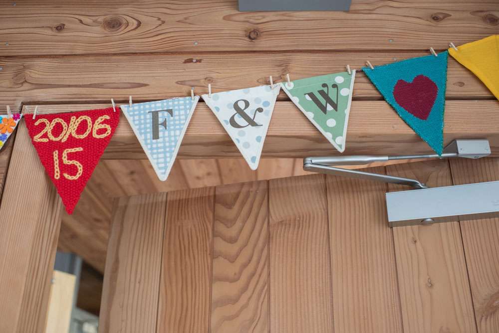 “We decorated the buffet table with vintage fabrics, my maternal grandmotherʼs crochet doilies which my mother lent me, beach buckets of cutlery and giant slices of wood from Westonbirt trees! We had oodles of fairy lights everywhere and LED lanterns and more paper pom poms! I also printed about 200 photos of our 13 years together to display on the notices boards, these included photos of us at the weddings of our friends who came to ours, it was great fun going back through our history together and remembering all those special moments and adventures we have shared so far.”