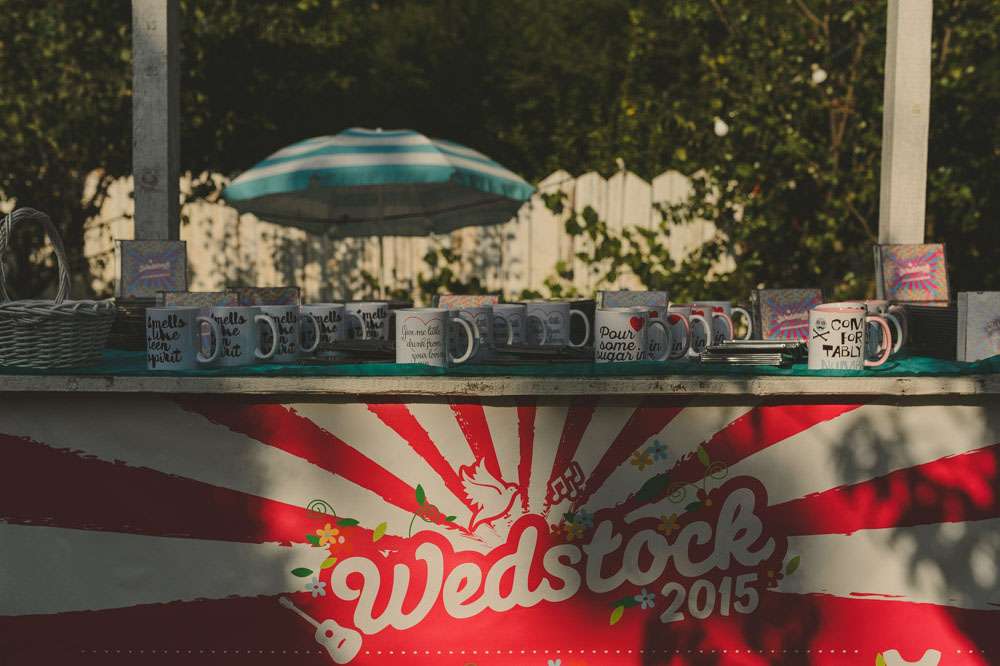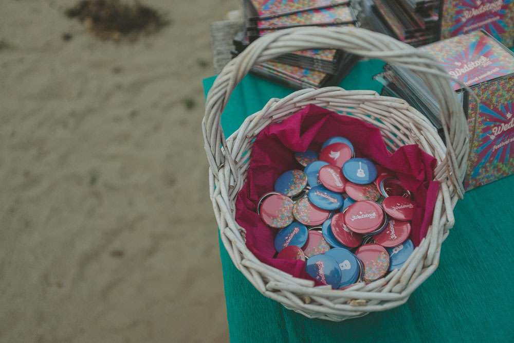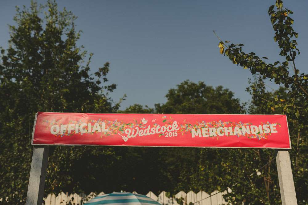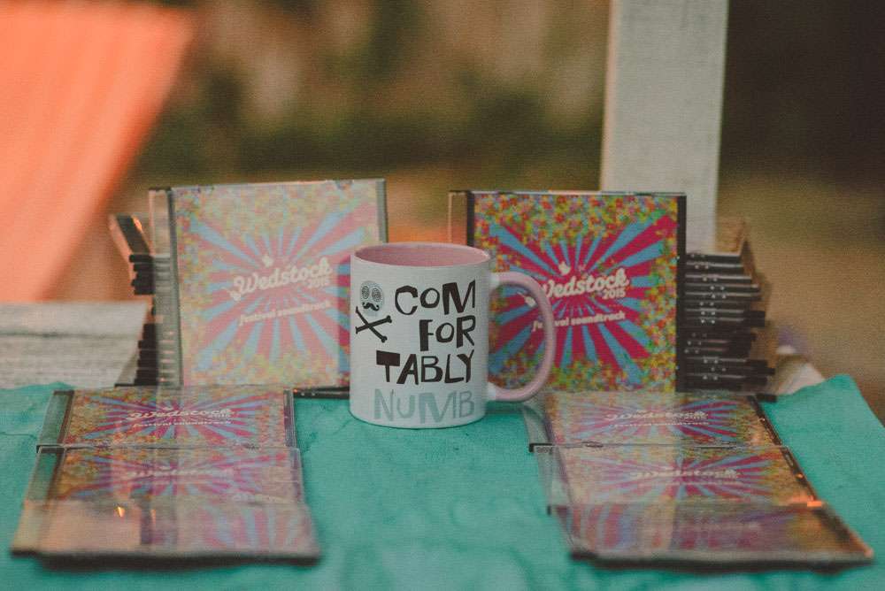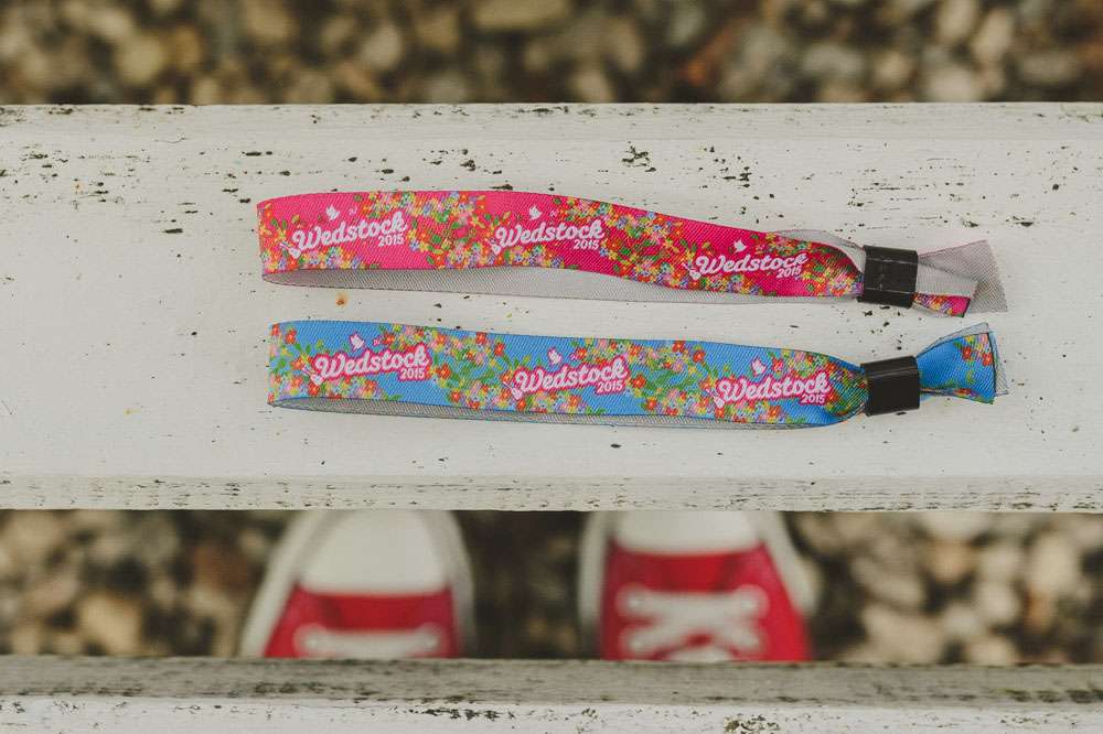 “We had LOTS of little details at the wedding, all of which were inspired by music festivals and bands we love. Each guest received a wristband and we even had an ‘Official Merchandise’ stand where were had CDs, badges, cups and t-shirts for our guests to take away. We arrived in a VW van and most of our guests camped over.”