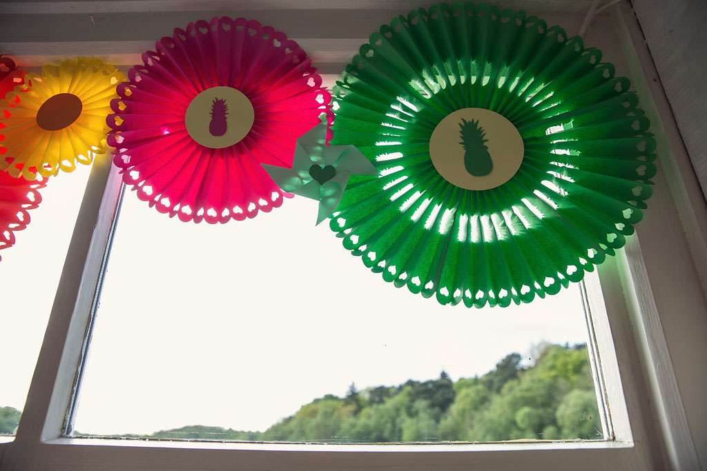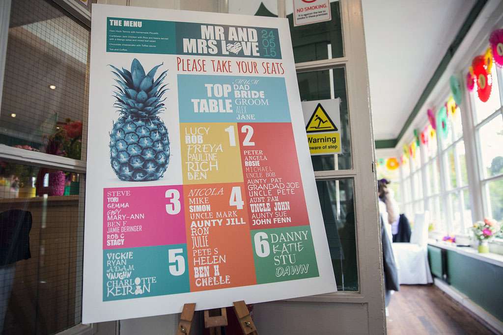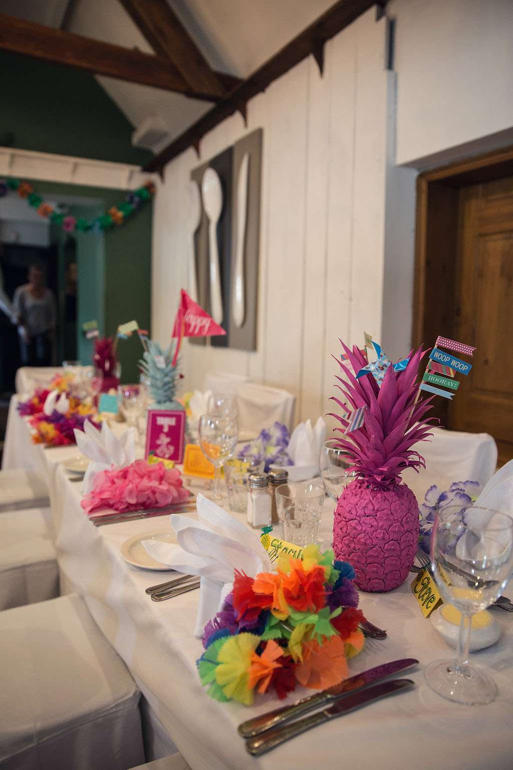 “We did the decorations ourselves. Len and I hand-painted 30 pineapples for table decorations. The pineapples were actually the very first idea I had for the wedding. They were originally all going to be gold but as the planning went on we both realised we wanted a mega colourful wedding so they ended up being painted multi-coloured. We also had 25 painted tin cans that we put our flowers in. We had a brilliant florist who did my bouquet and flower crown but to save on money the rest of the flowers were done the day before by my dear mum. She did a fantastic job.”