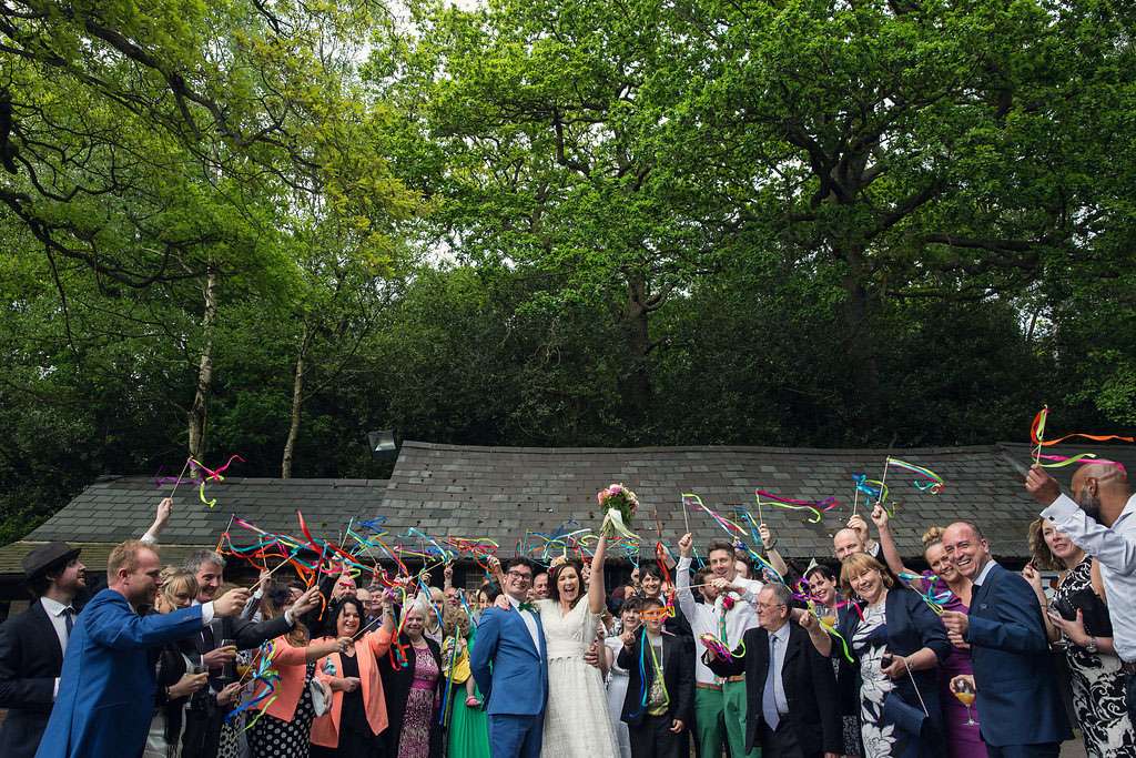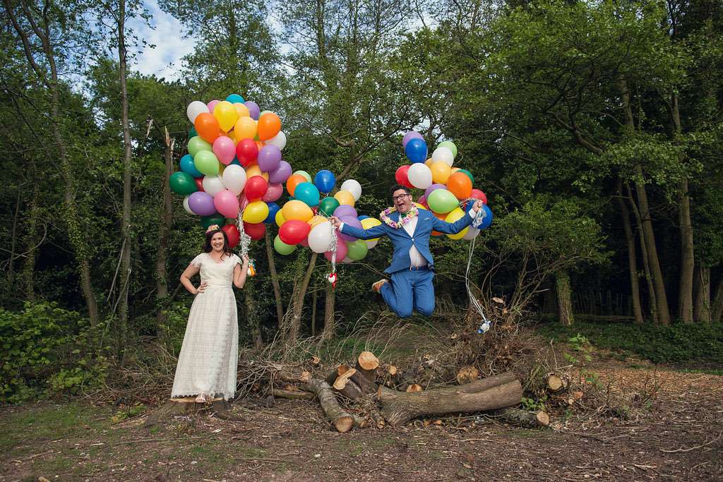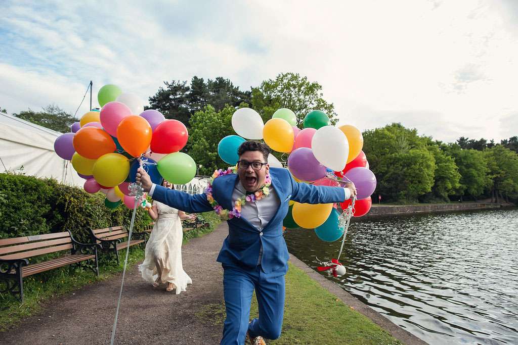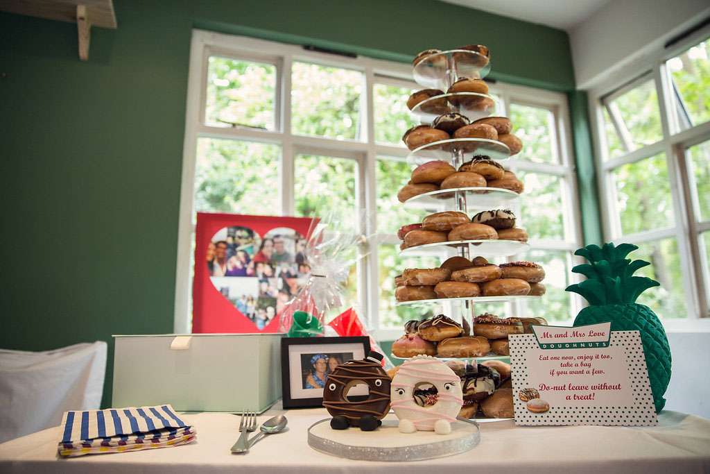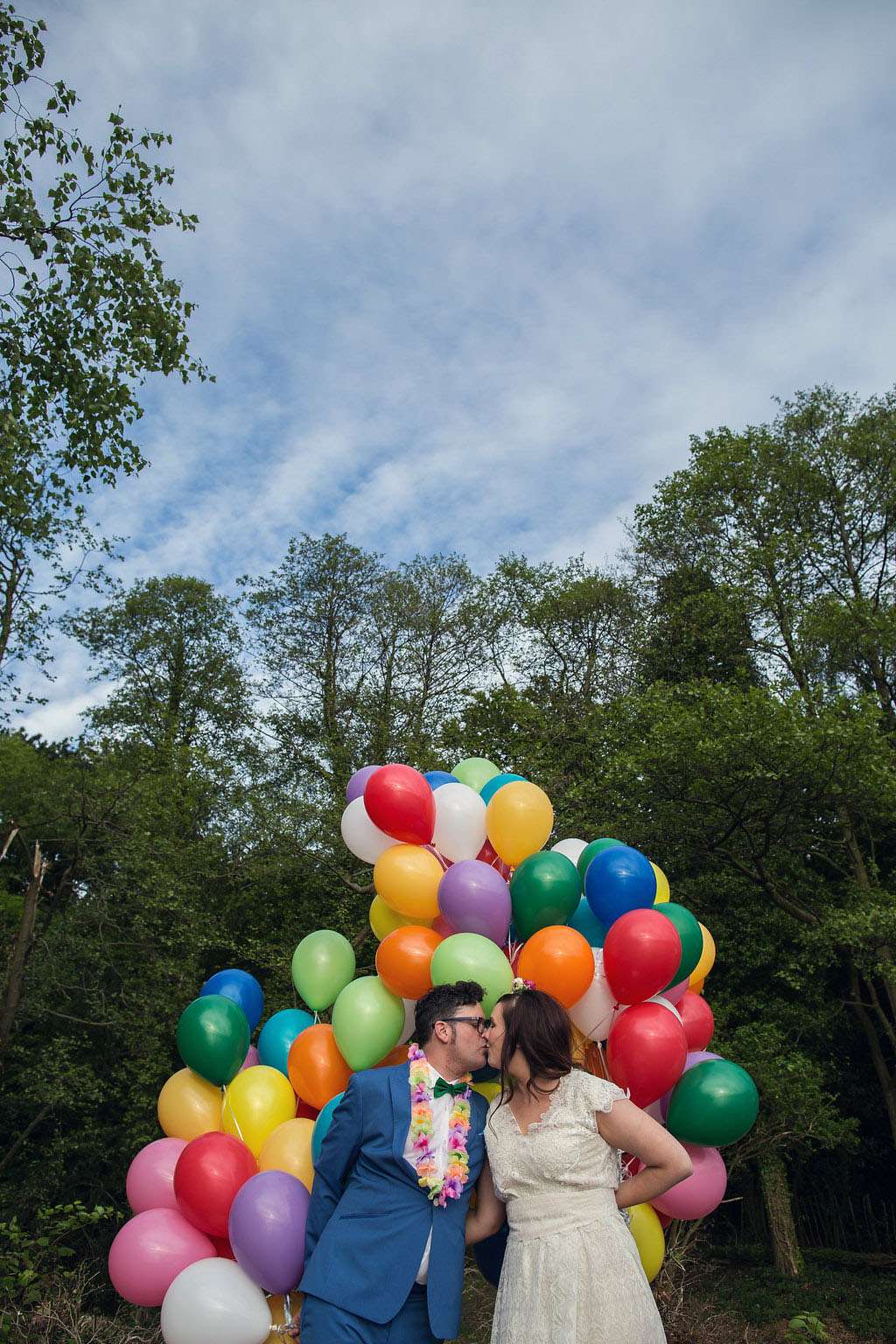 “We had a Krispy Kreme donut tower instead of a traditional cake and as wedding favours we gave everyone a flower garland which everyone wore around their necks and in their hair and it seemed to really get everyone in the party spirit! We weren’t allowed confetti at our venue so I brought some ribbon wands from an eBay seller in China and we used them for ‘the confetti shots’. They turned out great and everyone kept hold of them and danced with them on the dance floor. We also had 200 balloons. The brief I gave the balloon shop was ‘Id like them to look like the film ‘Up’.’ It was just another way of us injecting lots of colour and a fun party vibe.”
