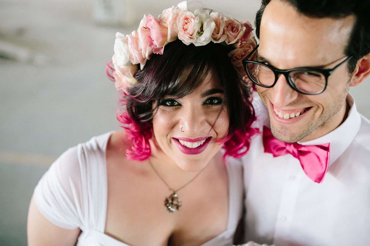 The bride wore a dress with a hot pink underskirt (to match her hair) from Tali & Marianna. “Before I started looking for a dress, it was clear to me that I won’t ‘surrender’ to the bridal-norms. I knew my dress would have some colour and that I didn’t want natural make up. There was also no way I was going to dye my hair. I wanted to look like me!”