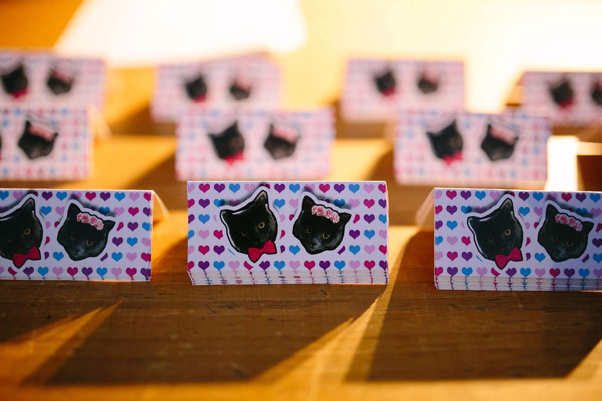 “It was also very important for us to incorporate our cats into the celebration, so we added a magnet to the invitations that designed with their faces in wedding outfits. We also put them on the sitting cards. The table numbers were designed by me as well, they had Disney, Star wars, Harry potter and Pokemon on them.”