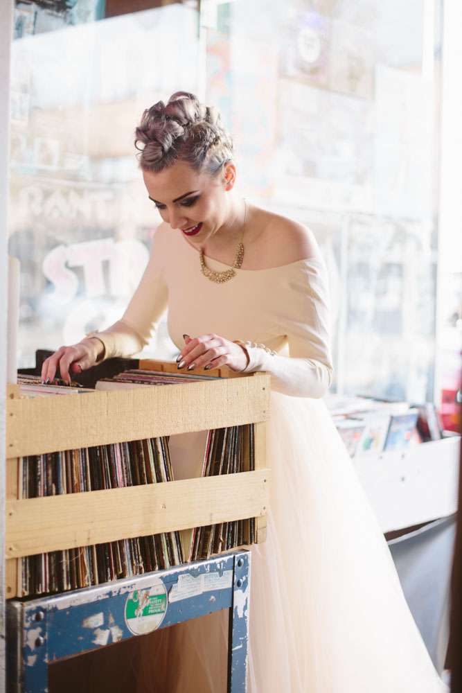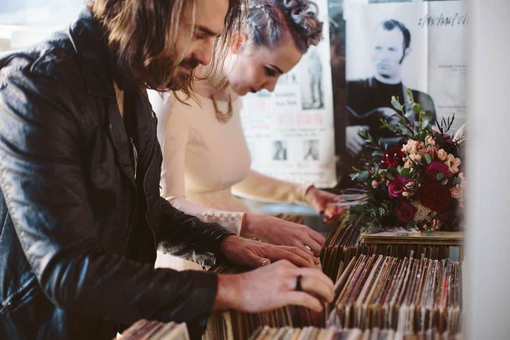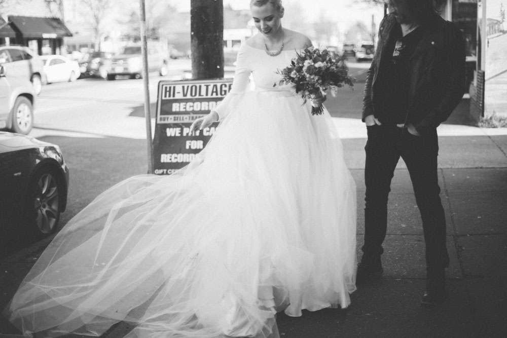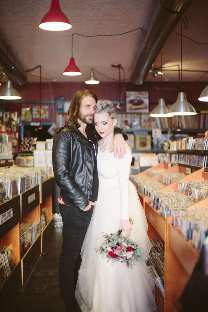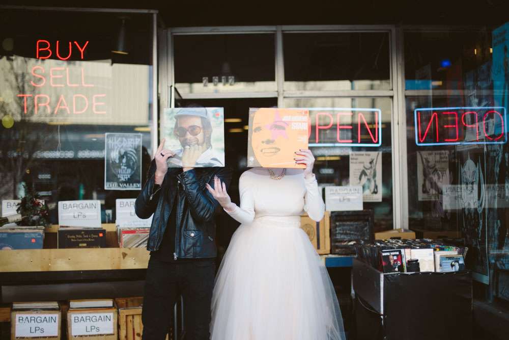 “Most of the shots were taken in downtown Tacoma; the venue was at a beautiful space called Events on 6th, which has an incredible industrial loft-like reception area along with the cosiest vintage chapel. A lot of our shots were also done at a local record store called Hi-Voltage Records.”