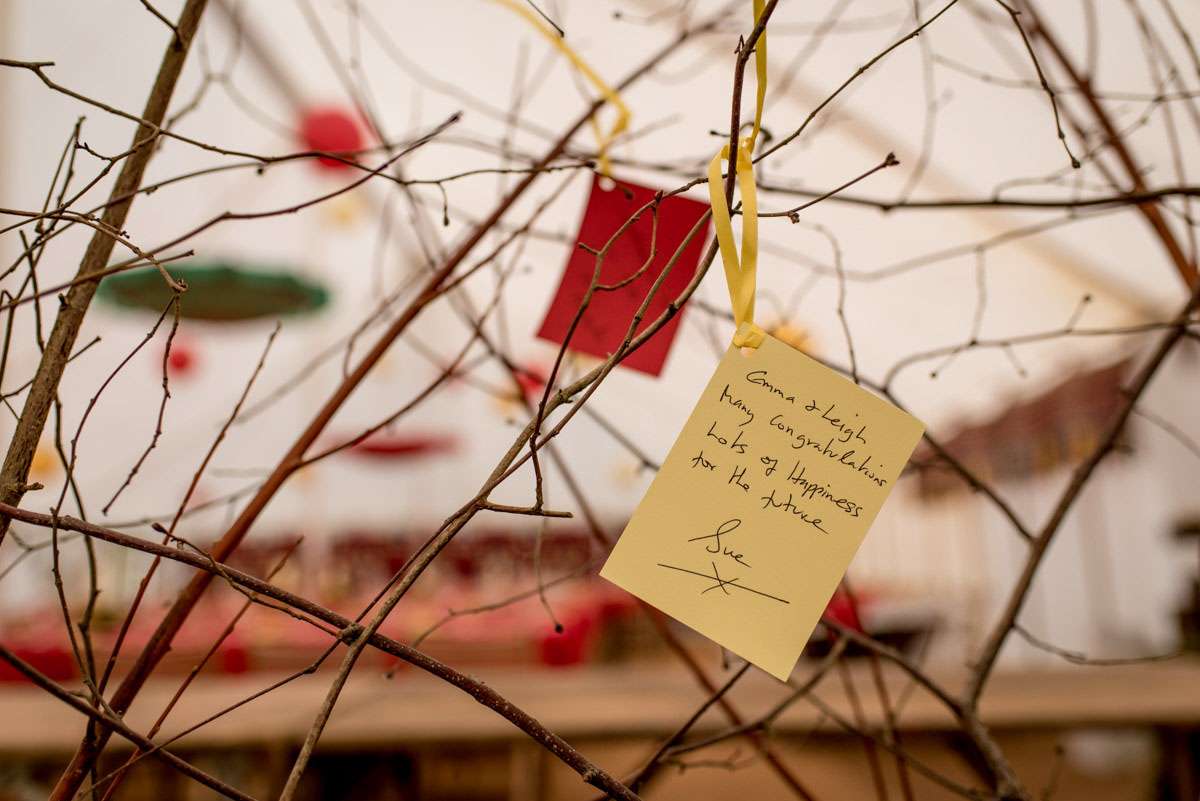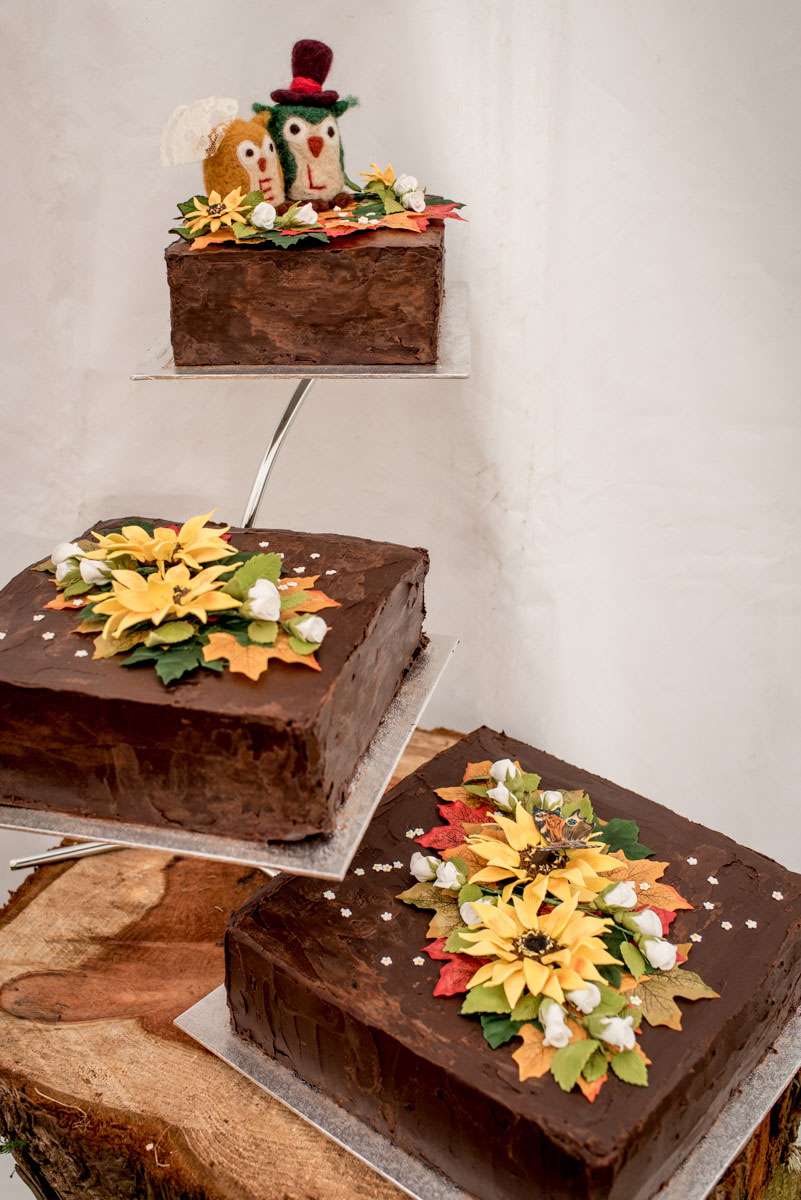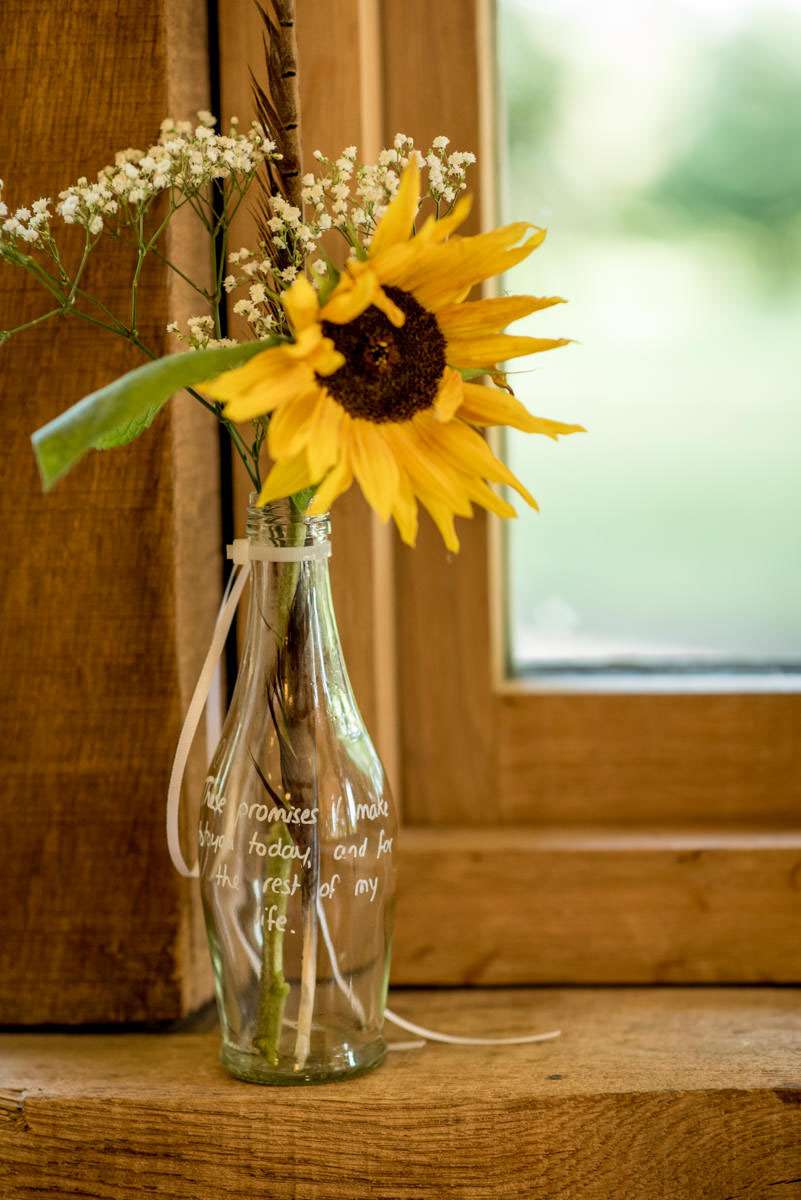 The bride’s favourite part of the wedding was all the home made elements. “We had lots of help with the DIY projects. We pressed daisies for confetti which were put into handmade boxes. There was lots of home made bunting, and pressed leaves along the tables. Our vows were written on glass bottles which held flowers and pheasant feathers.”