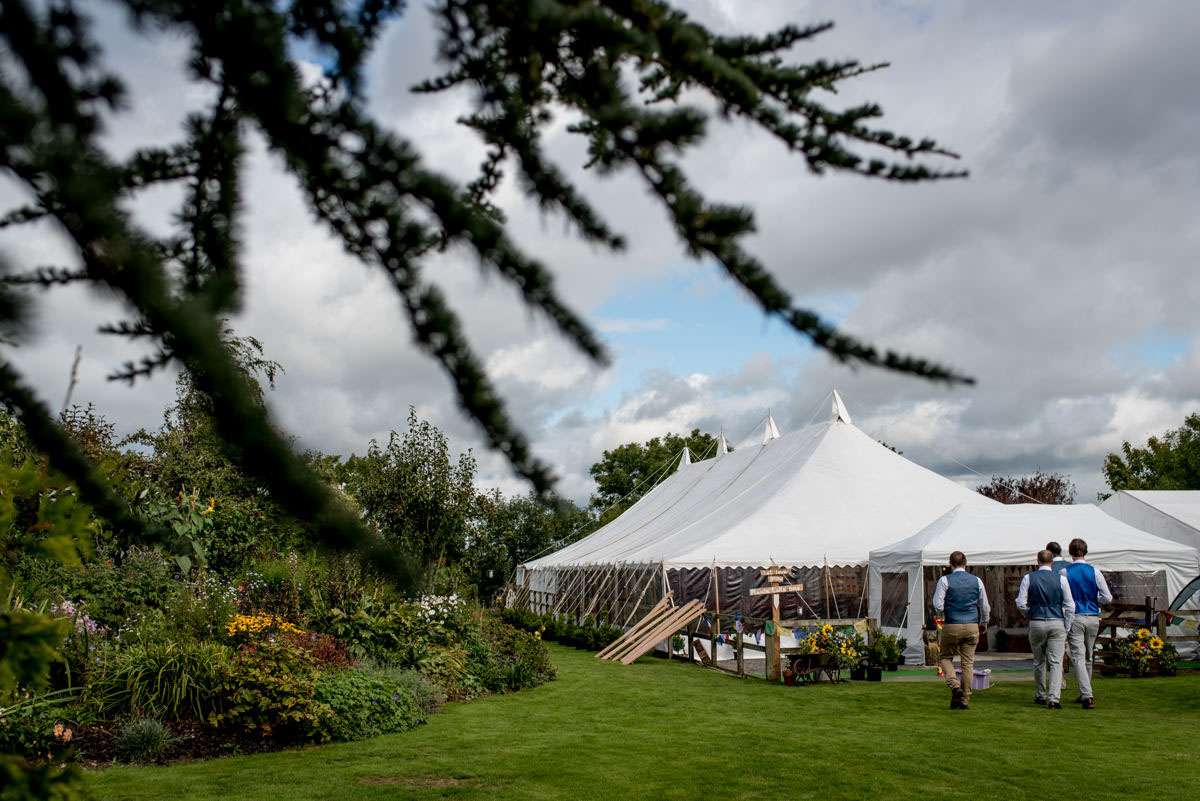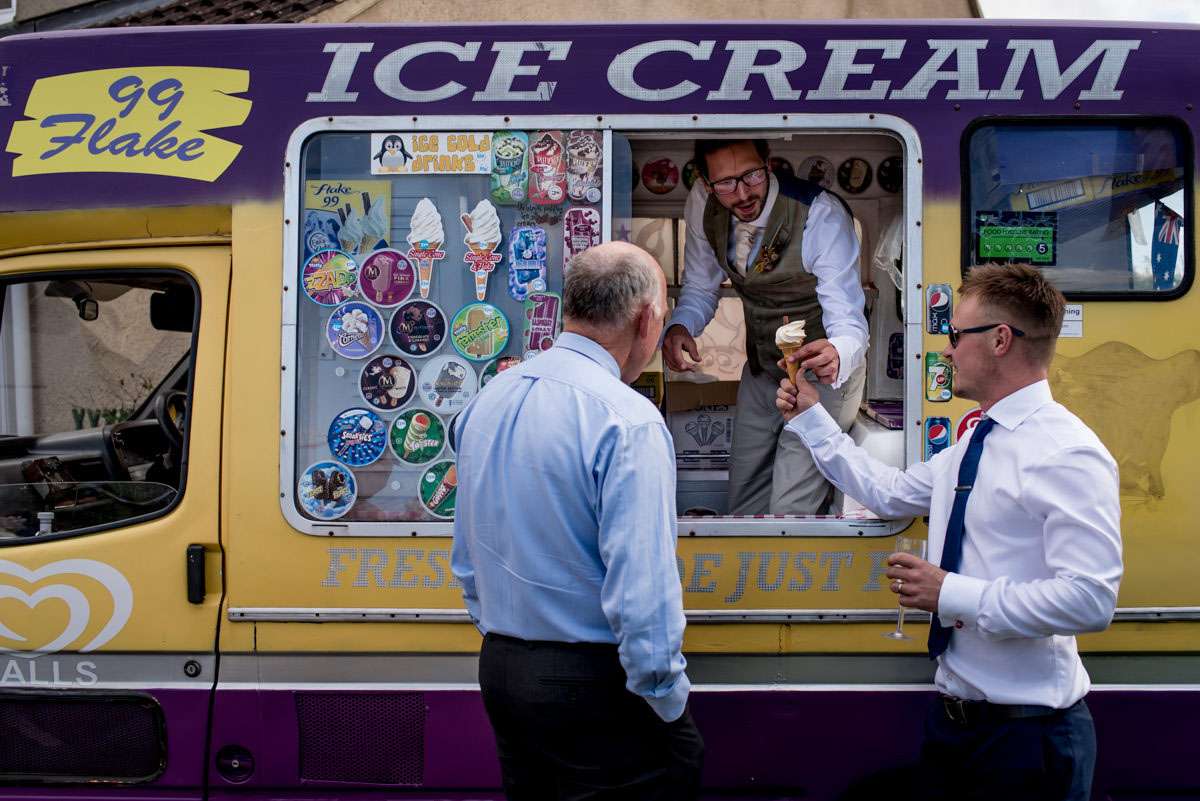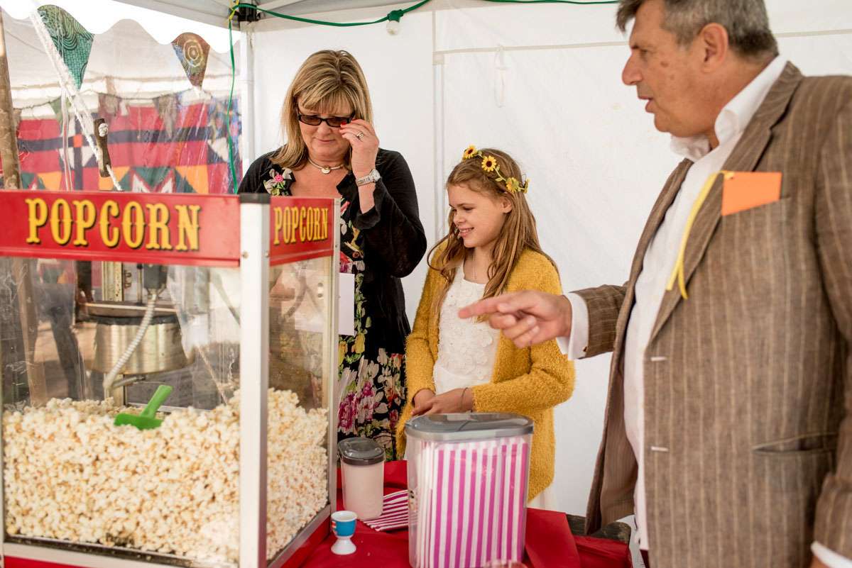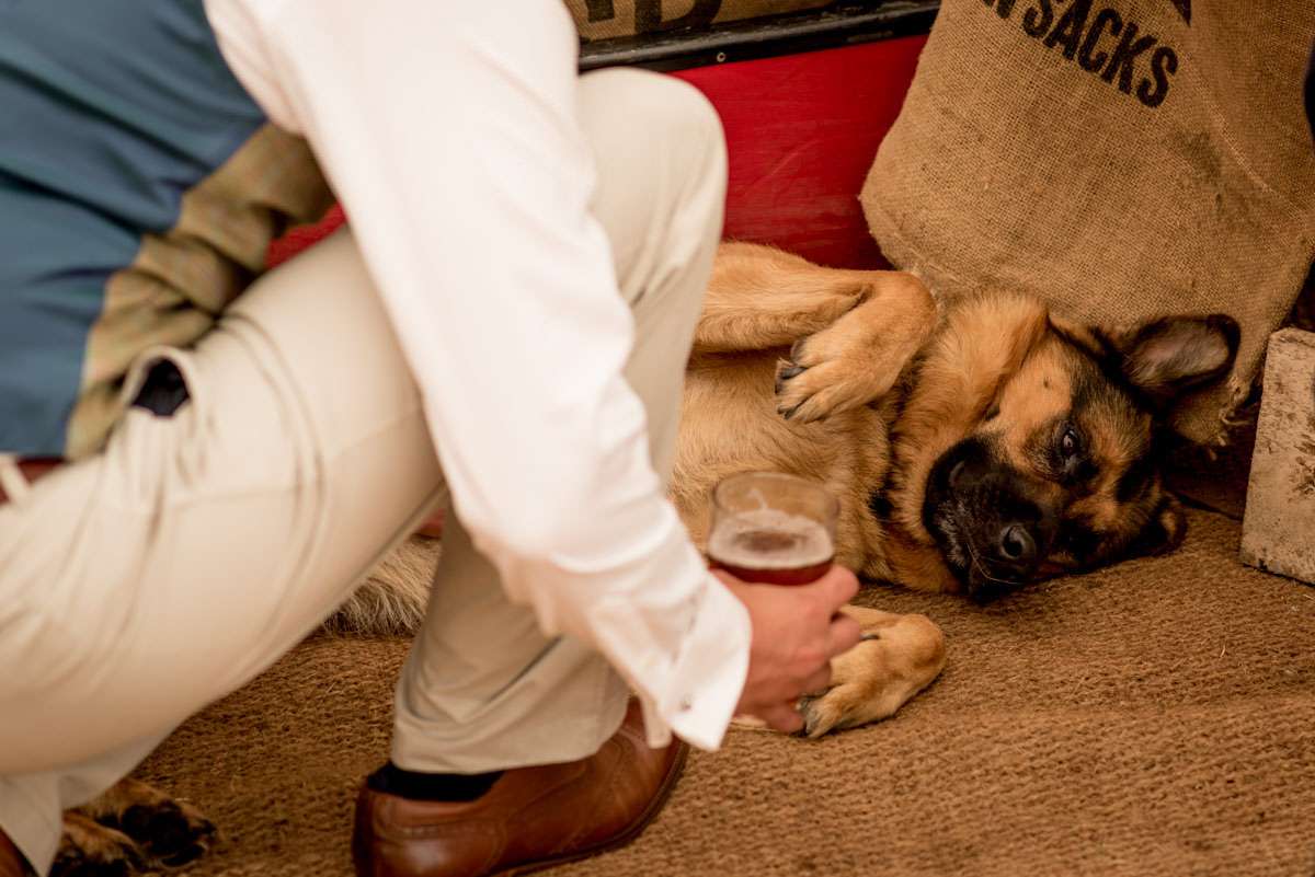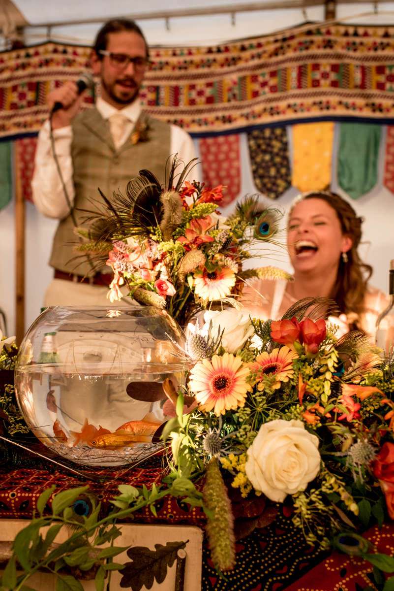 “Our wedding planner, Lynn Edwards, had so many creative ideas for personal touches at the reception”. Emma continued. “We had flowers hanging in bottles for the ceremony. We also had lots of lanterns made out of tin cans which we lit around the garden in the evening. We could not have done it without the sharing of unique items, interests and talents from our friends and family. The garden looked amazing. We borrowed an old fashioned popcorn machine, small shrubs, bales, benches and trestle tables. A wooden horse on wheels even turned up! We had gold fish on the top table which were a complete surprise and added due to Leigh’s love of marine life. Finally, Leigh’s Dad had spent months, showing off his talented refractory brick work skills by building a large pizza oven in the garden, which was the highlight on the Sunday during which the celebration continued with music, choir singing, home made sausages and Leigh’s Mum’s amazing baking.”