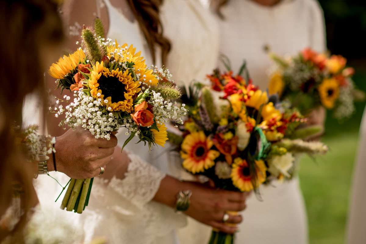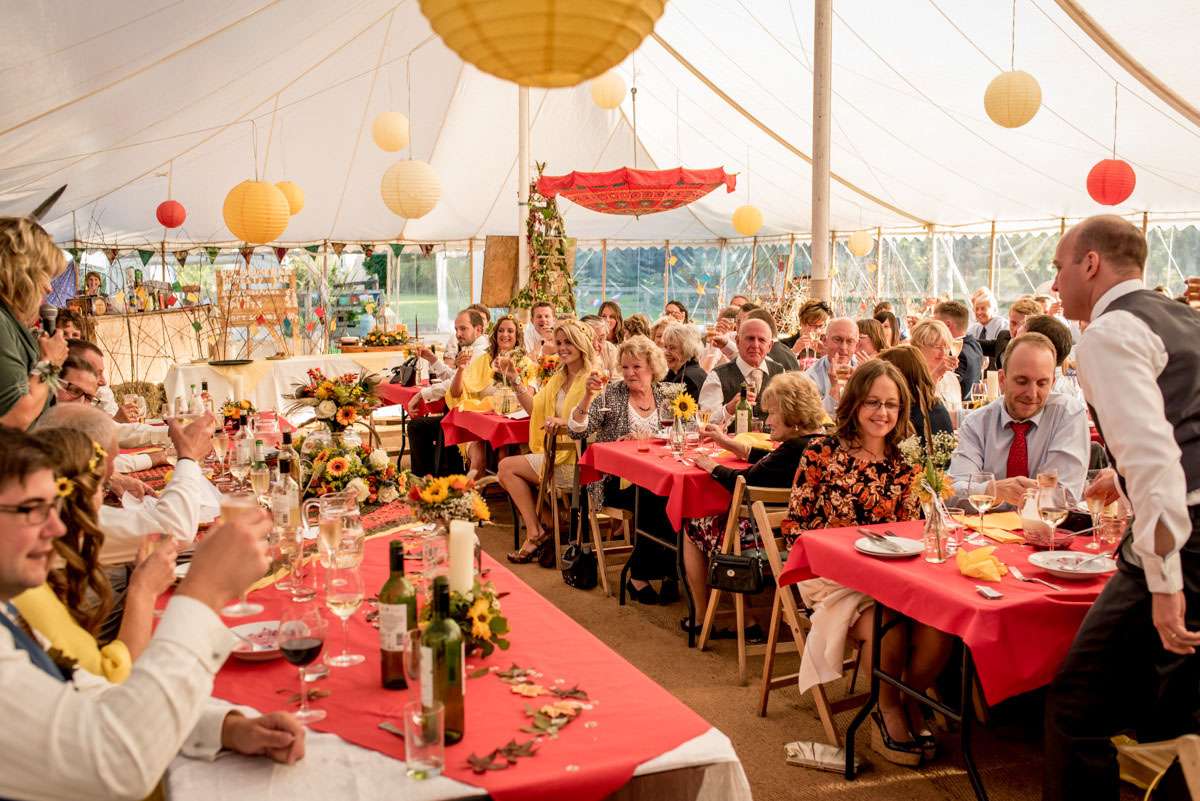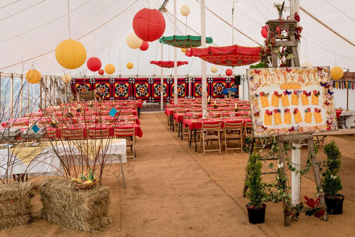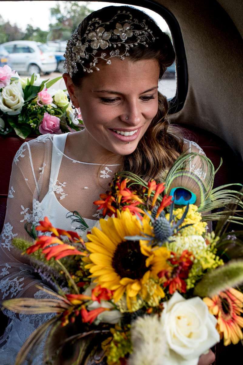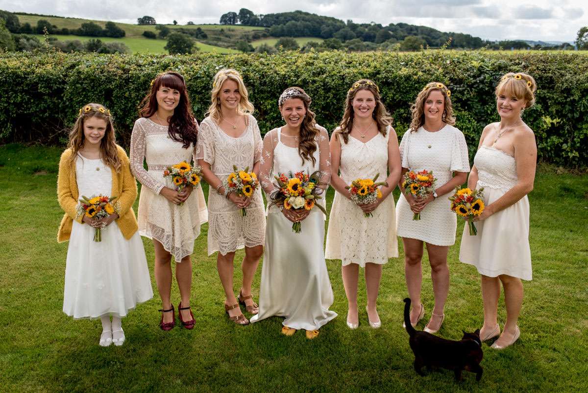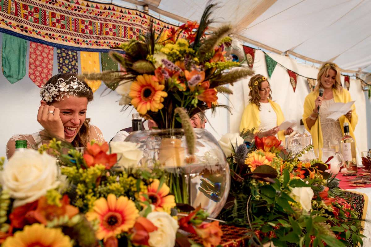 “The inspiration for our wedding grew over the few months we were engaged, we didn’t set out with an initial plan but knew we wanted it to feel relaxed, colourful and have a country element”, said Emma. “I lived in Kenya for a while and love the bright colours of African material. I bought some when I went to Uganda last year and began making bunting. A shop in Tetbury called Artique is an Aladdin cave of Indian artefacts. The owner showed us bright wall hangings and large umbrellas which they have used at Womad festival. We also wanted to bring in a country feel. I love sunflowers, so this also added to the expanding bright colour theme.”