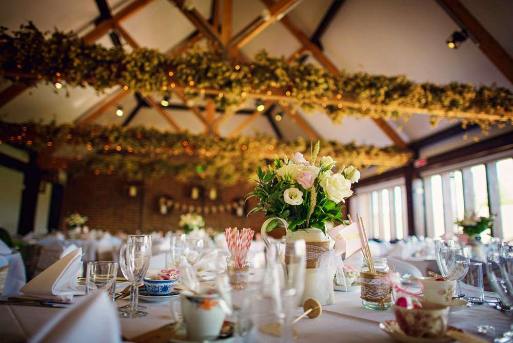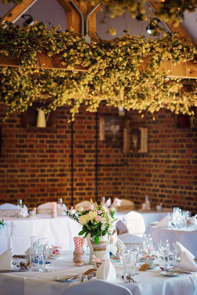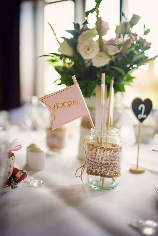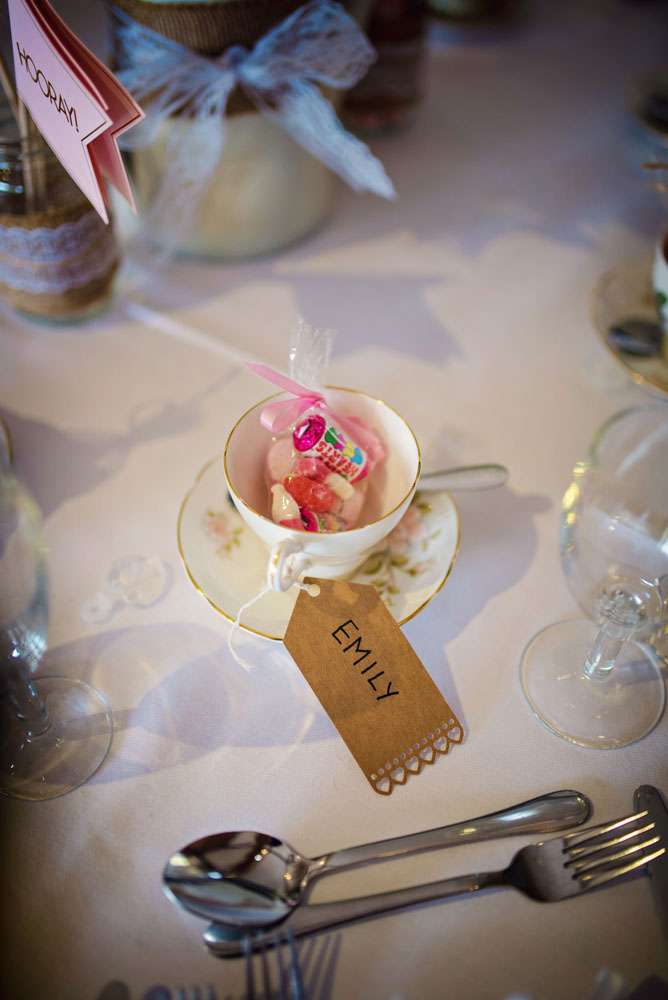 The couple also did plenty of DIY projects. “We made the invitations from recycled brown card. I also did the bunting and lace bows. I sprayed and decorated watering cans and jam jars for table decorations and centrepieces, lined a suitcase and wrote on chalkboards for the gifts and cards. The favours were tea cups which I bought from charity shops. We bagged up some of our favourite sweets and made little luggage tags for the cups so they could be used as the place cards. However the DIY I’m most proud of is my flower crown. I made it from scratch and it came out really well. It did take some time to make everything but it was so worth it and so rewarding, especially seeing everyone’s faces when they saw all the effort that was put in!”