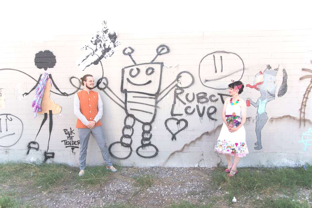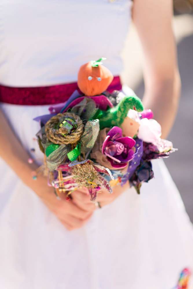 The bride wore an amazingly colourful dress, decorated by her children, which she made herself! “I had a dress in mind but knew I wouldn’t be able to find it, so I’d have to make it myself”, she explained. “I’ve had a lot of experience with sewing, but I’m no seamstress. I didn’t have a pattern, just an old dress which I worked around, and adjusted the shape by chance. If it didn’t look right I’d just sew a bit more, and so on… I was still making alterations the night before! I used plain white cotton which I already had and bought a pink petticoat online for £10! The glittery pink ribbon around the waist was something I already owned too. My favourite part was the bottom of the dress where I let my children draw with fabric crayons. There’s a picture of a rainbow, a truck, some eyes, and mummy and daddy holding hands. Afterwards, I stuck patches on, some which I had already, some which were bought especially and had special meaning.”