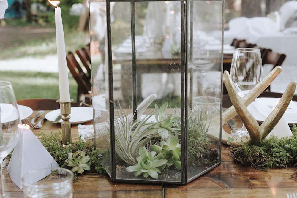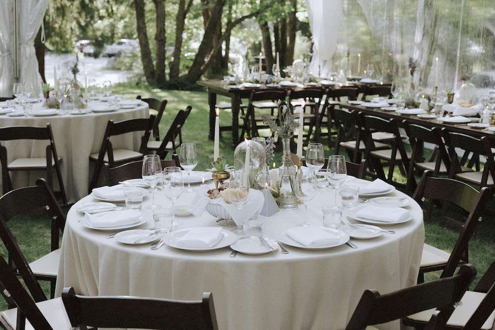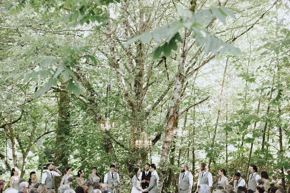 The wedding was held at Sunwolf, a five acre woodland setting in the Coast Mountains, an hour from Vancouver. “Our wedding venue was beautiful on its own, so we didn’t need to overshadow that with any bright colours or over the top decorations. I think understated and ‘accidental’ beauty is often much harder to pull off than extravagant beauty. We wanted the event to be beautiful, but to feel natural and effortless, like it just kind of happened that way. We also loved the idea of using light to decorate. I wanted chandeliers in the trees during the ceremony to create a fun juxtaposition of nature meets elegance. I had no idea the chandeliers were actually going to light up; I didn’t learn that until I was walking down the aisle with my parents. I was just blown away by how something so simple could add so much to an outdoor space.”