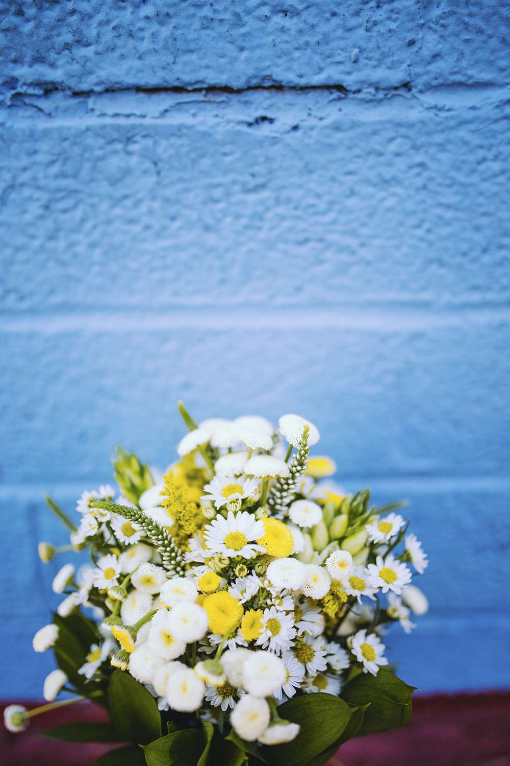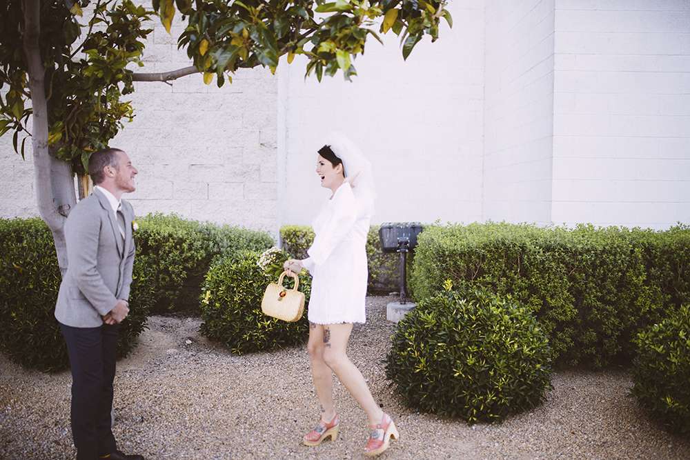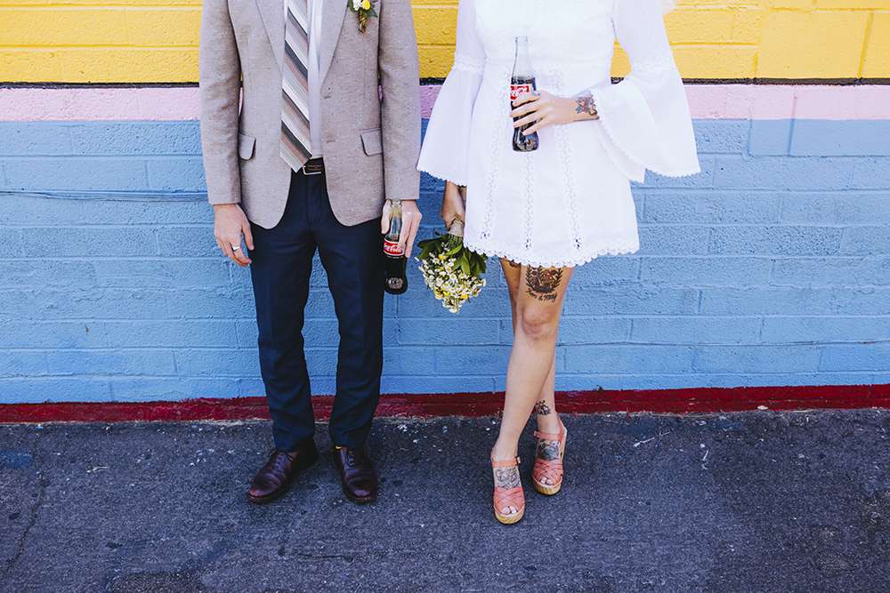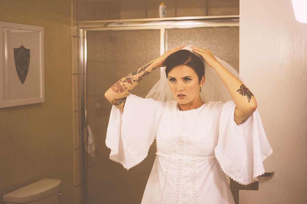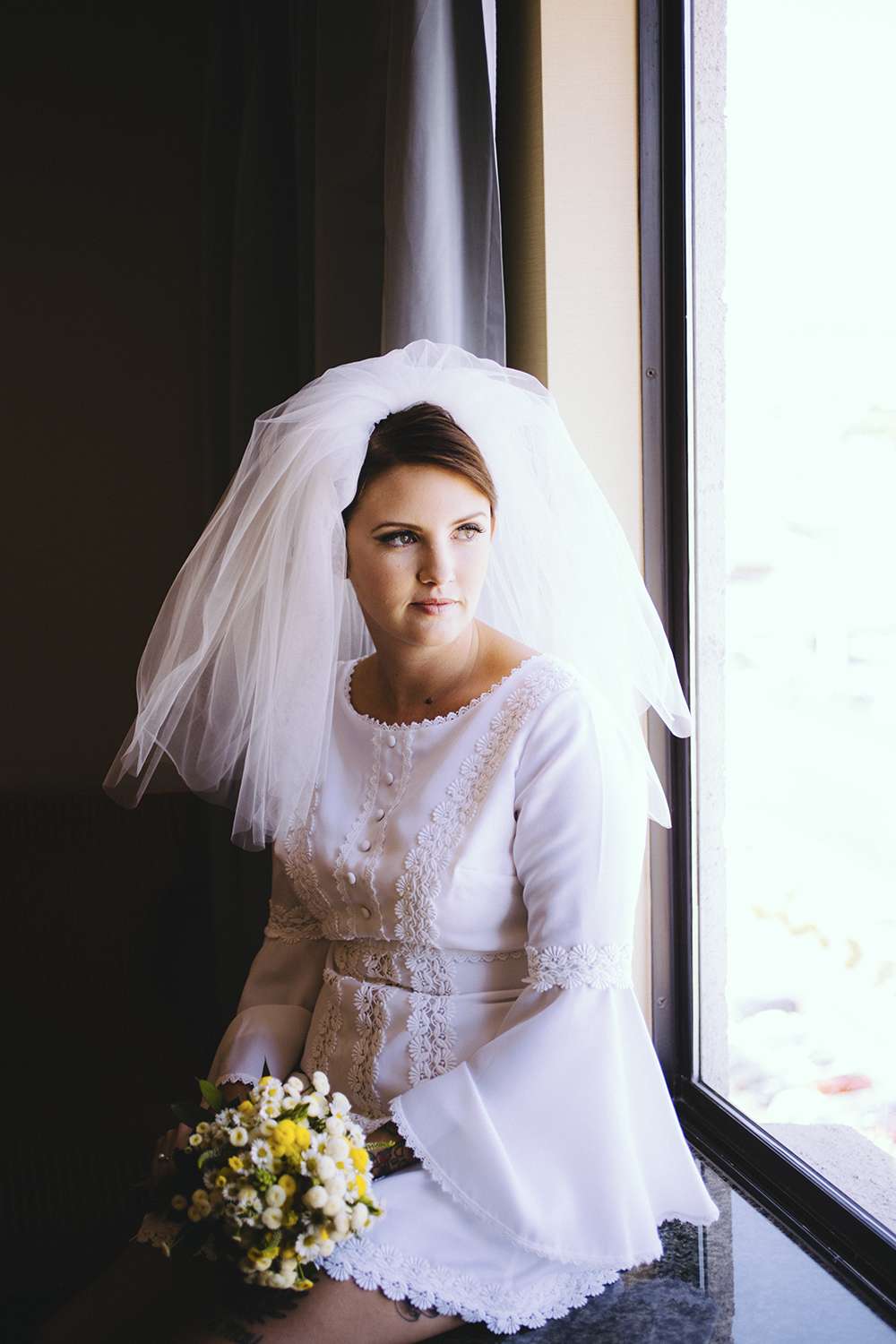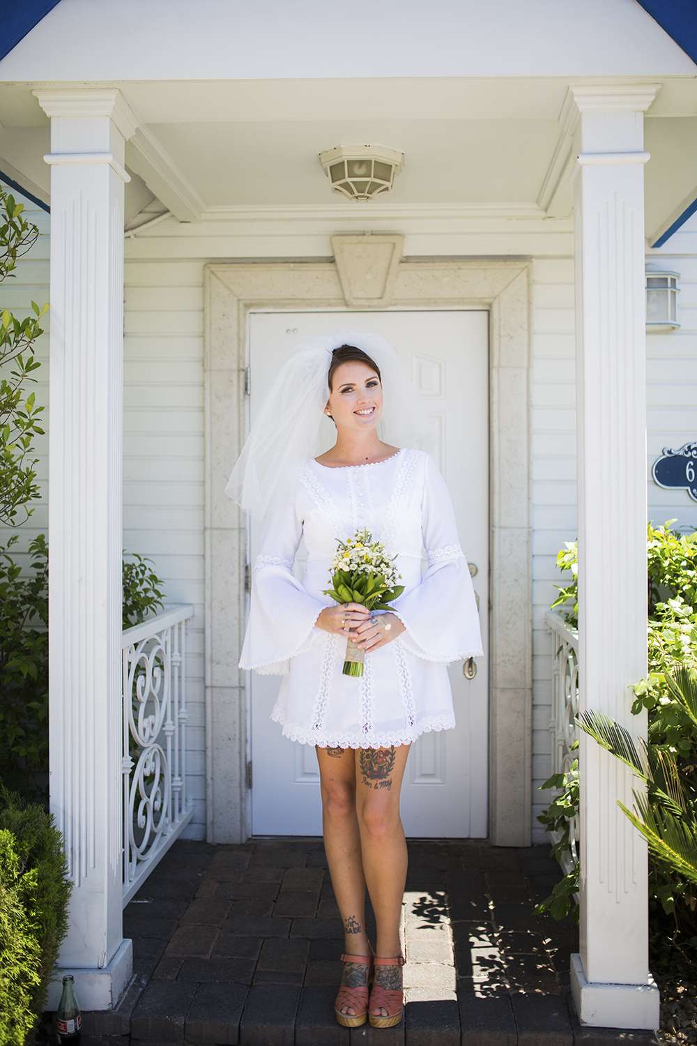 Linda wore a dress they she bought from a charity shop for $10 and her shoes came from eBay. “The biggest expense was our flights but we saved on everything else. I found my dress in an op-shop for $10, it was quite a bit of work to alter it into a mini though. Dan also drew some props to hold in the photos, which I loved.”