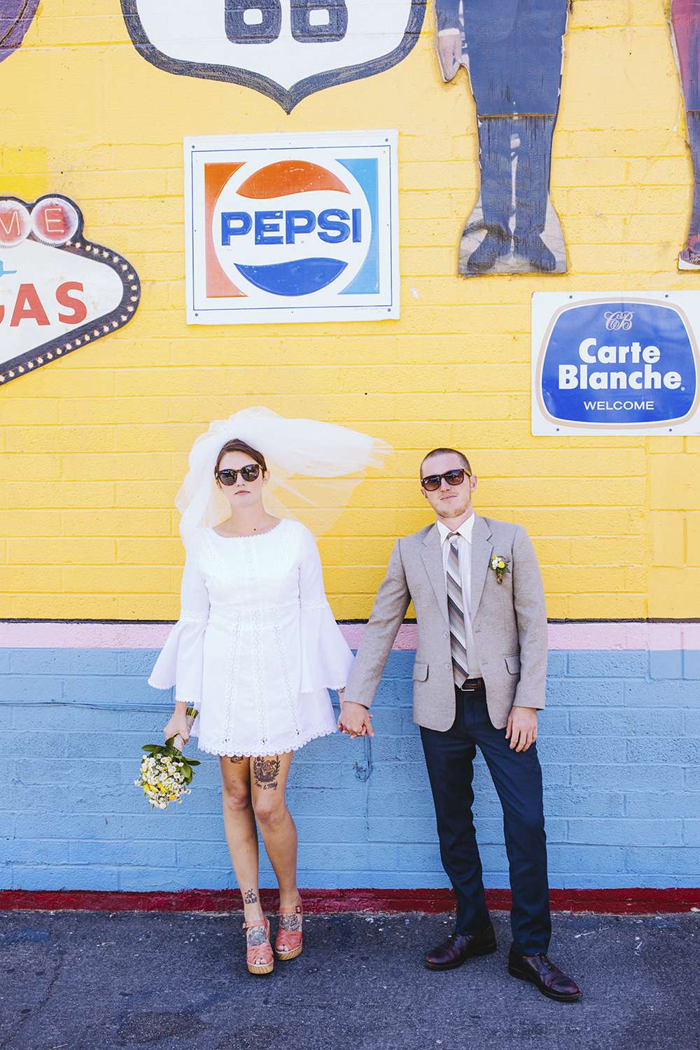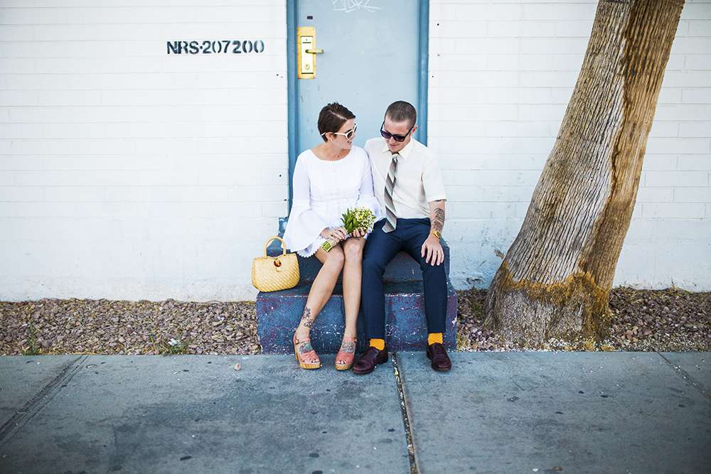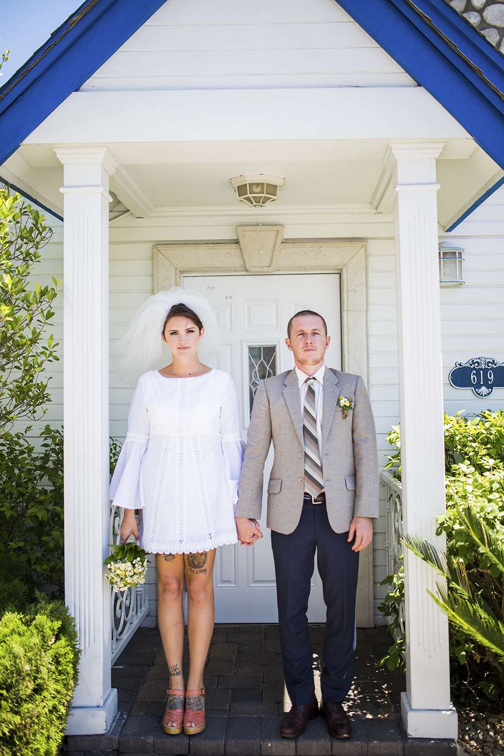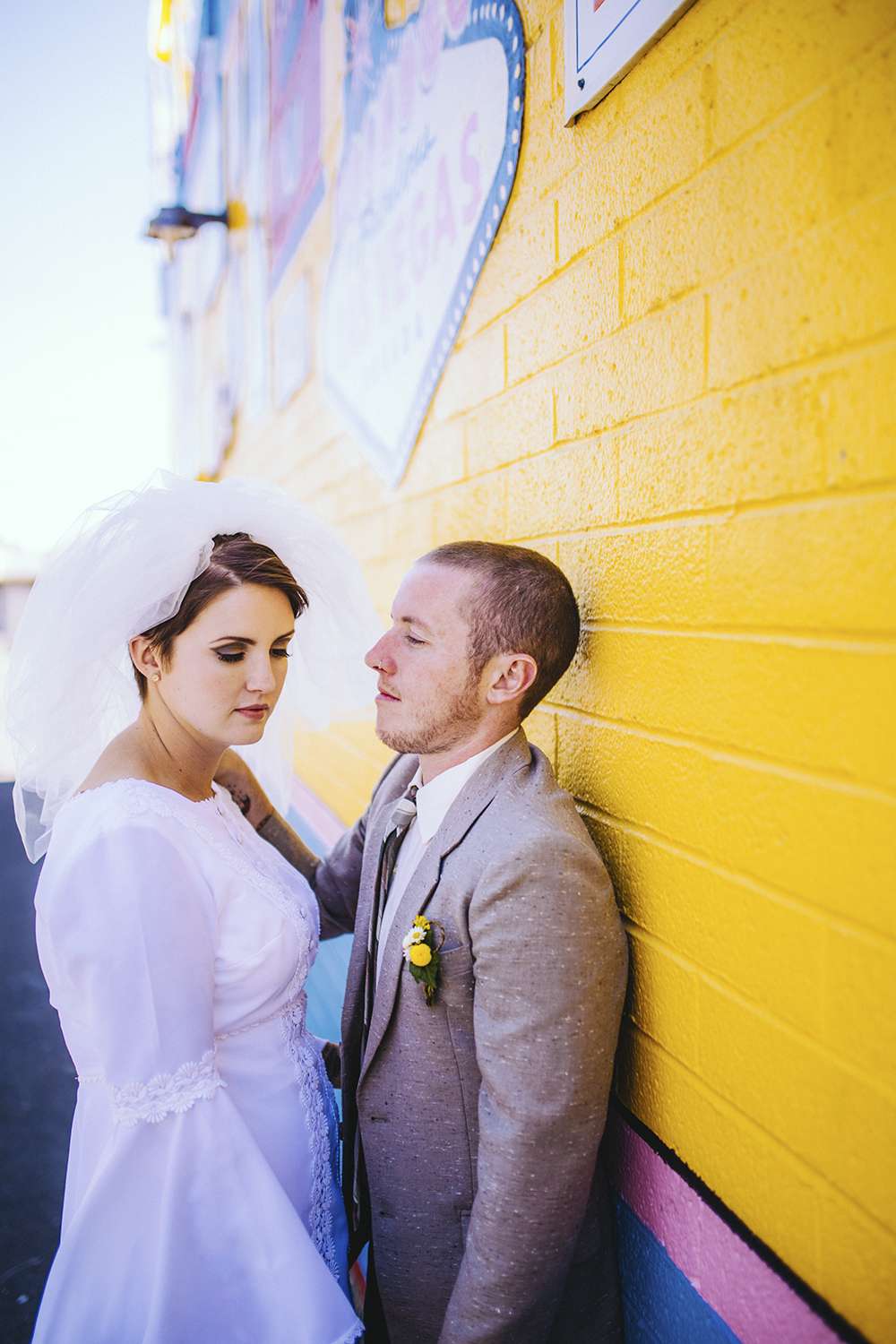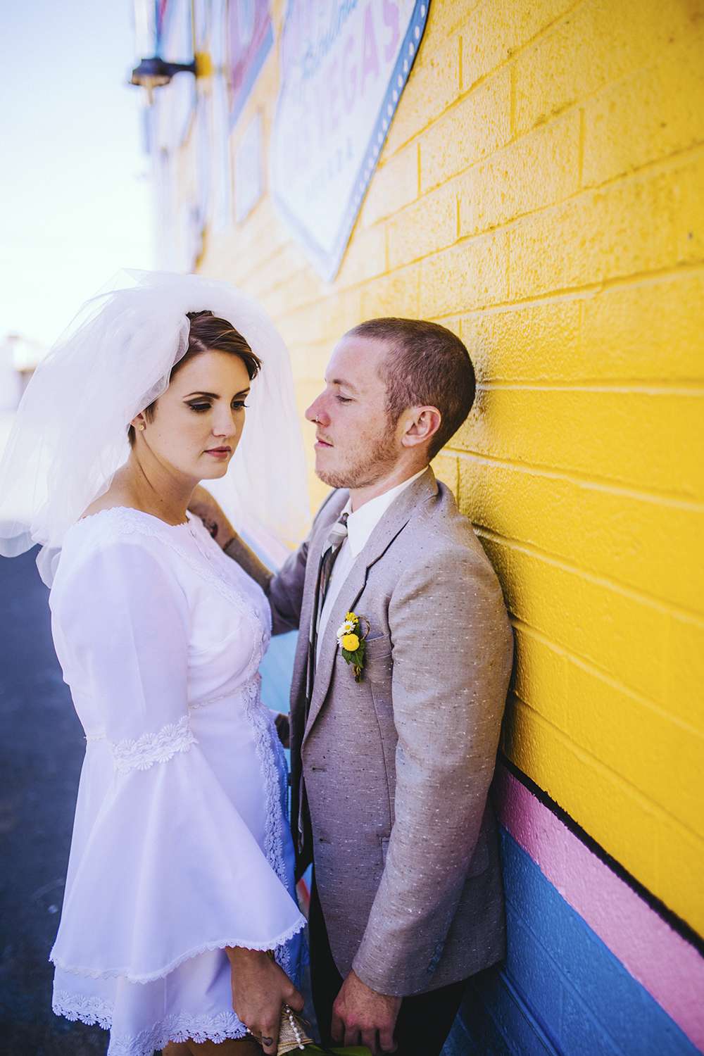 The ceremony was held at Graceland Chapel on the Strip. “In true trashy Vegas style we were in and out of Graceland’s chapel in 5 minutes flat! Elvis sang us a tune and we had a little boogie. It was perfect! After the ceremony we went with Sarah-Kate to do our photos.”