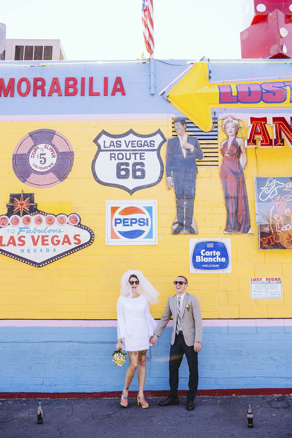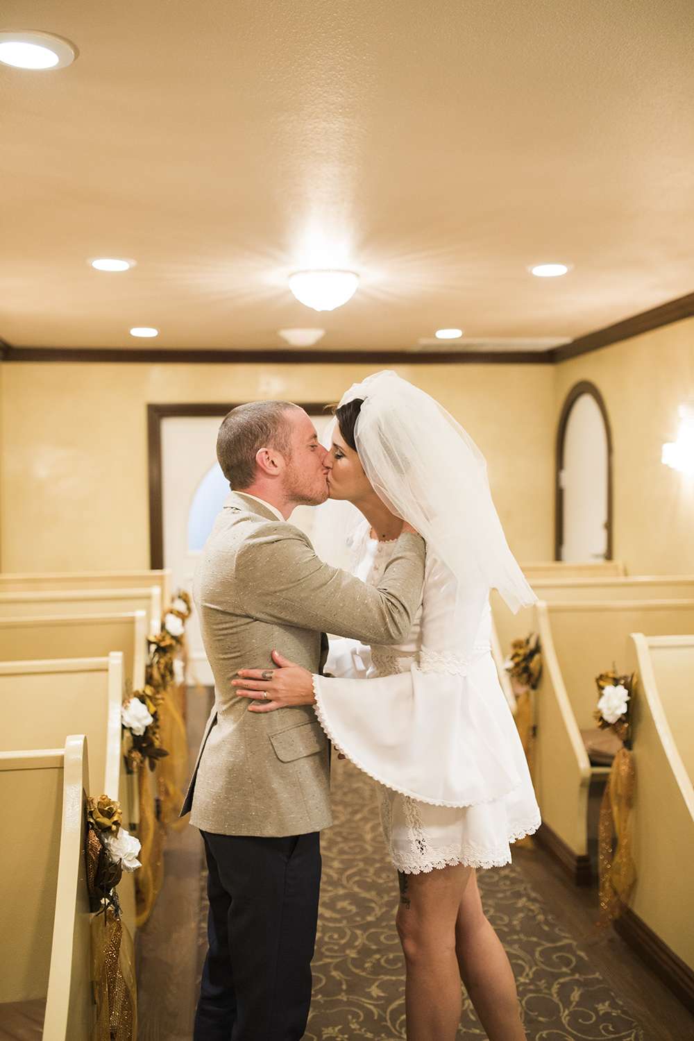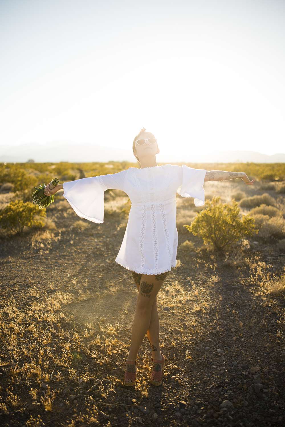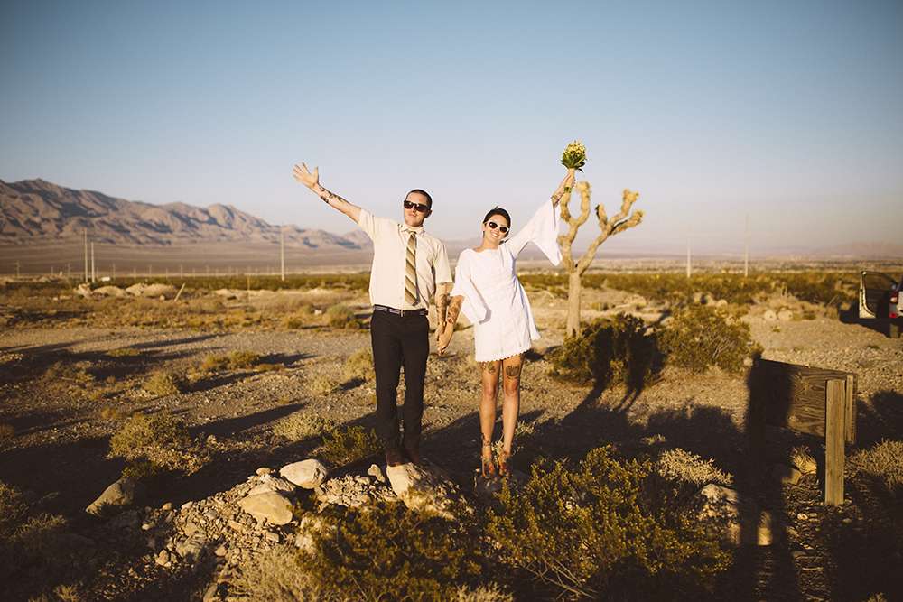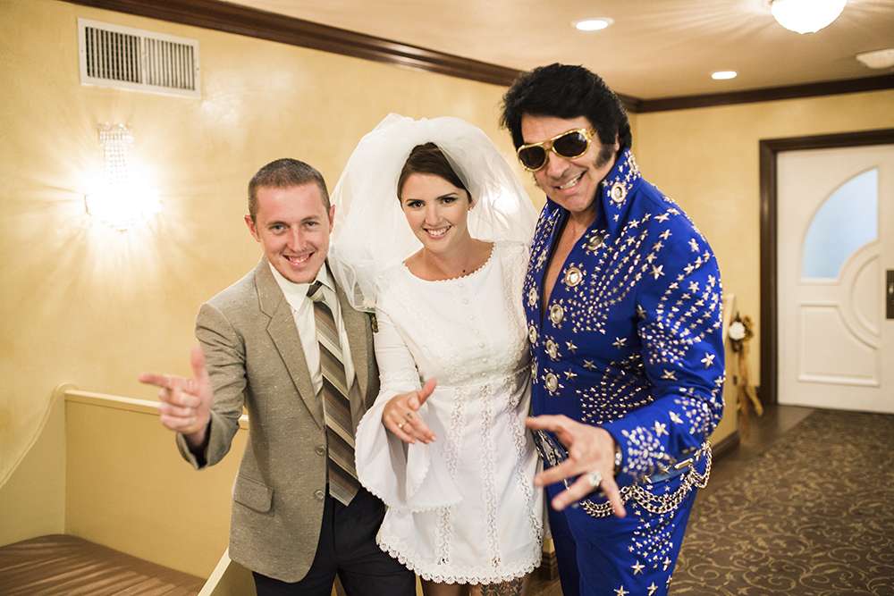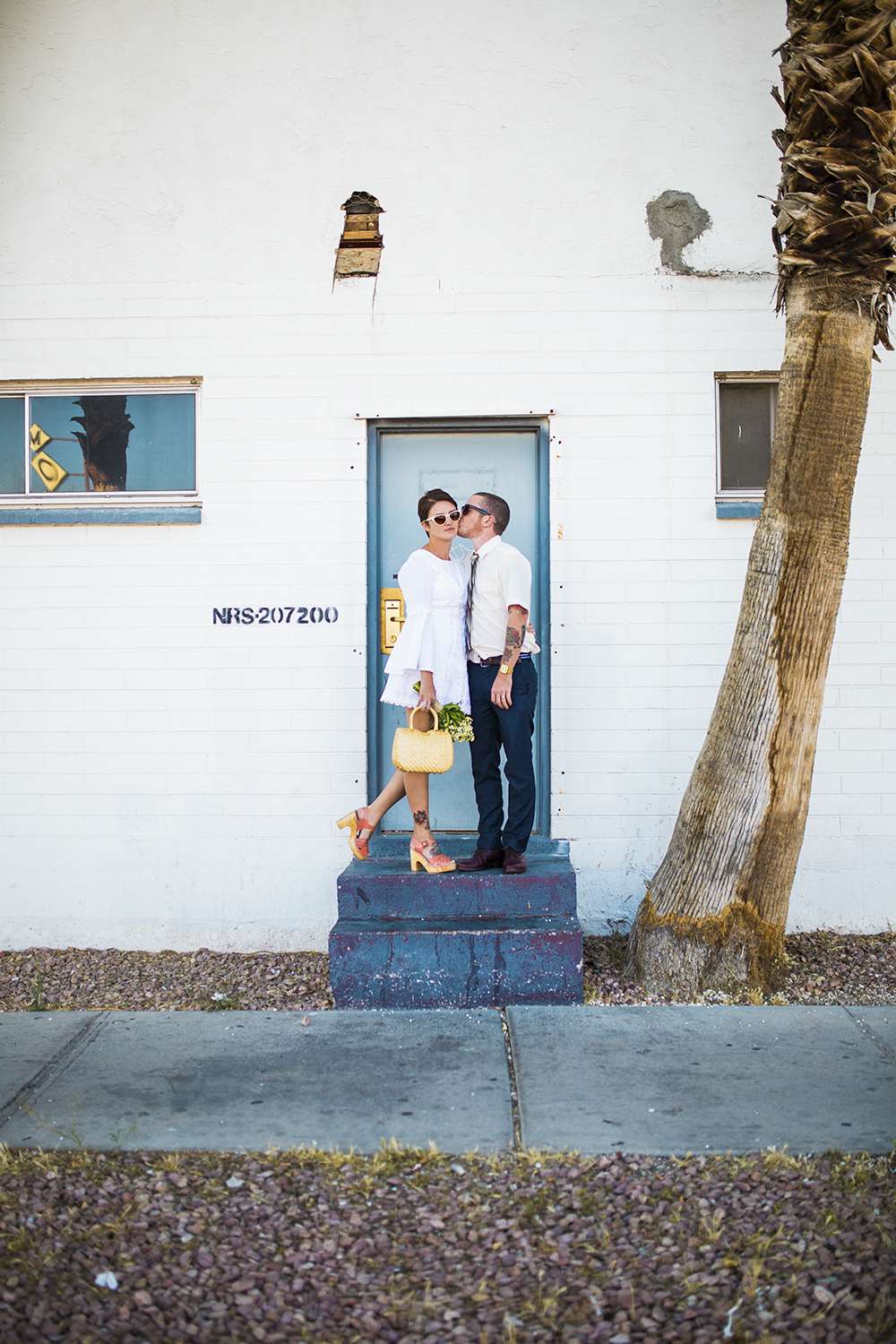 The ceremony was held at Graceland Chapel on the Strip. “In true trashy Vegas style we were in and out of Graceland’s chapel in 5 minutes flat! Elvis sang us a tune and we had a little boogie. It was perfect! After the ceremony we went with Sarah-Kate to do our photos.”