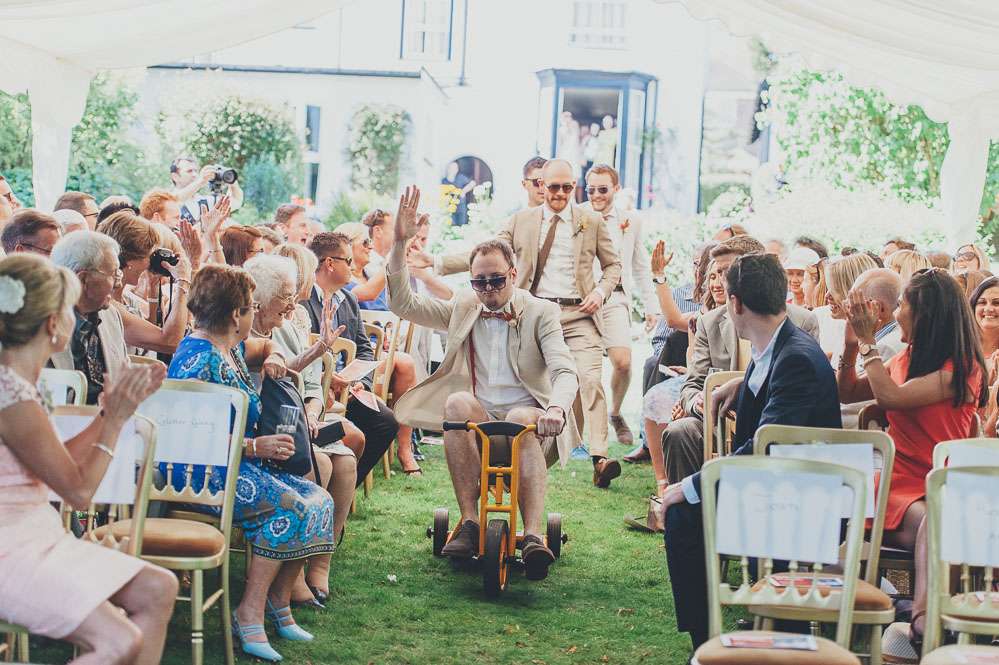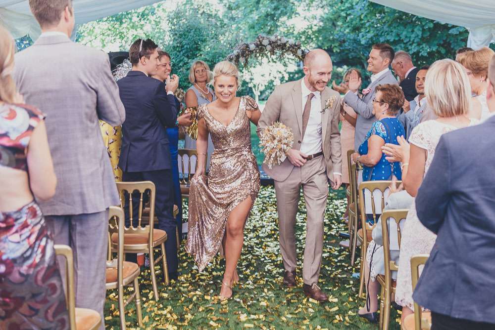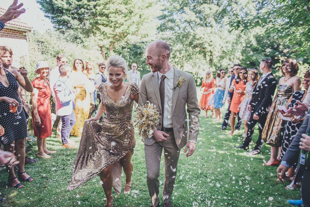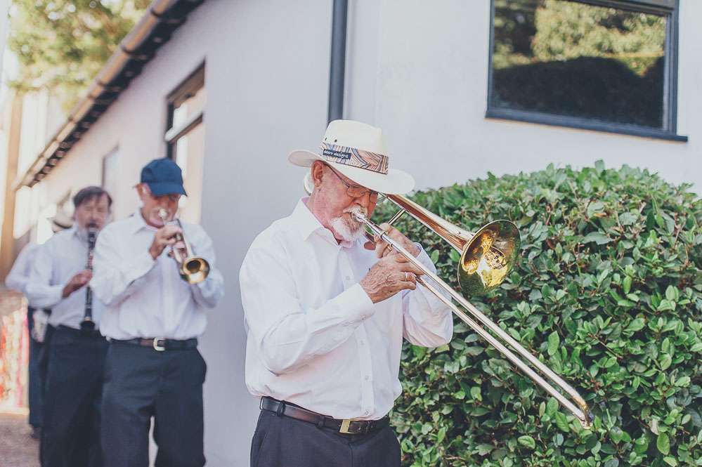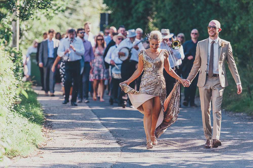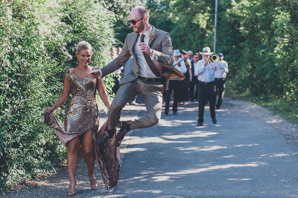 “There were quite a few musical performance elements throughout the day. For example, dancing entrances by the groom and groomsmaids (to the track Whatta Man), and the bridespeople (to the track I’m Every Woman). We also also sang during our vows to our favourite duet, Islands in the Stream. We also put on a surprise choreographed dance to Gett Off by Prince to kick off the dancing later! Plus we had a walking New Orleans-style jazz band to take us from the garden to the village hall. Lots of people from the village came out to watch, which was really lovely.”