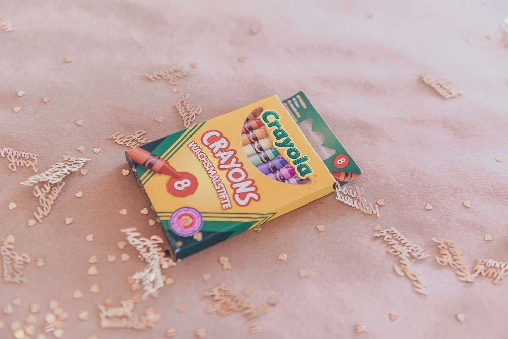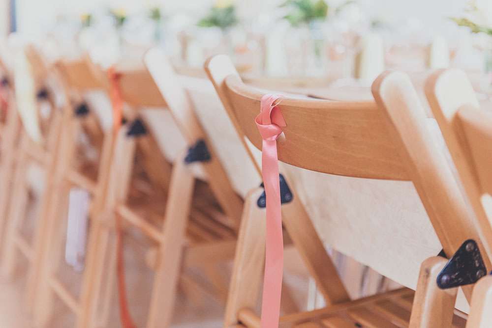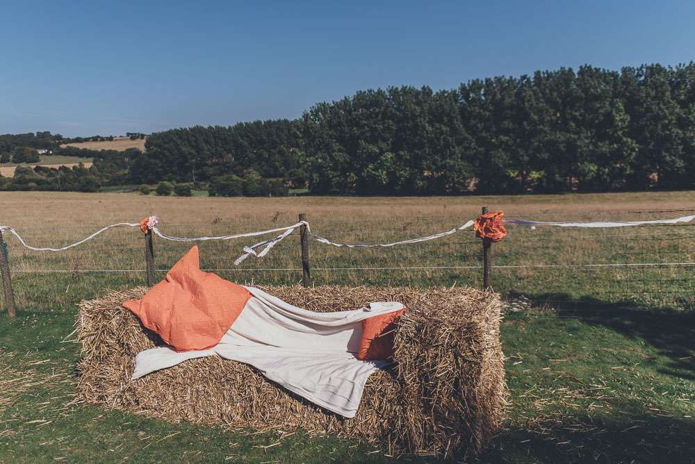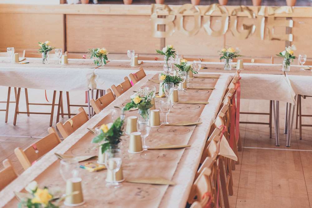 The couple and their families decorated virtually everything themselves. “In the village hall we set up plain trestle tables and had brown paper on them as the runners. We gave everyone crayons to draw with during their meal. My Mum made a blackboard with quiz questions/ sums for everyone to work out their table numbers (she is a teacher!). The Original Draping Co. helped us install a ribbon canopy and fairy lights on the ceiling, and we used the ribbon offcuts and paper lanterns and streamers to decorate the rest of the hall and outside area. We also had hay bales from a local farmer!”