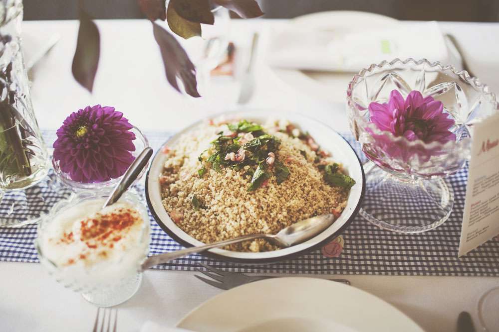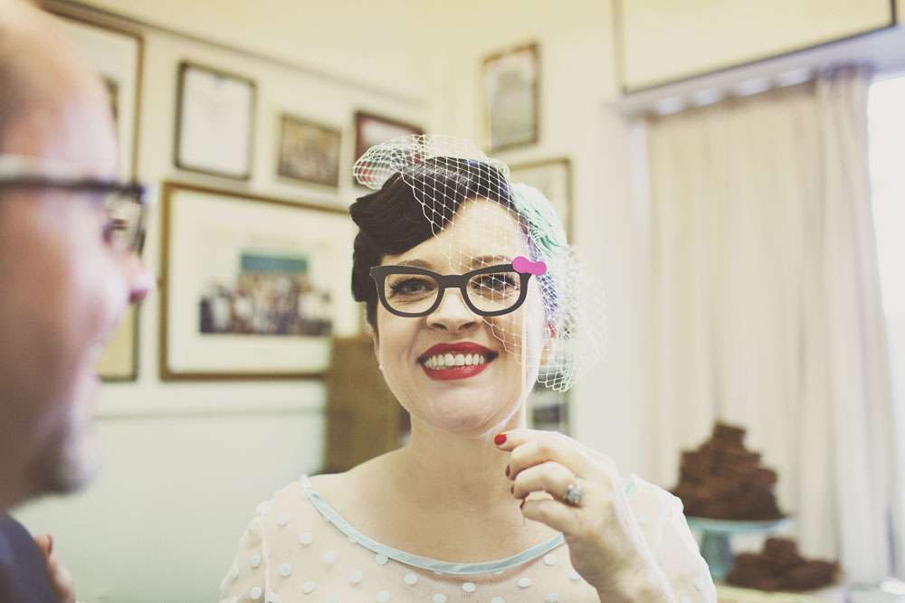 “The theme was a modern take on a 50s wedding – a relaxed, simple, family-oriented party”, she continued. “We didn’t want too many whistles and bells and most of the wedding reception was DIY. The village hall was a blank canvas so set up the entire room and decorated it ourselves with home made gingham bunting and flowers. We dressed the stage, stocked the bar, and put together goody bags for the kids (the fake tattoos and painless piercings went down particularly well). We were also lucky to have a small army of friends who volunteered to help clear up the aftermath the following day.”