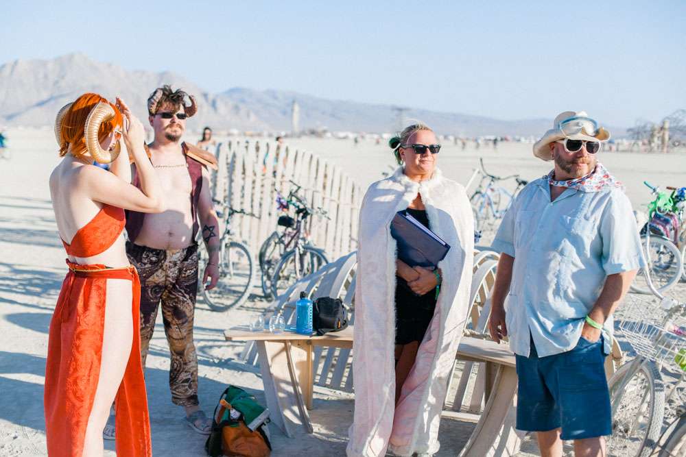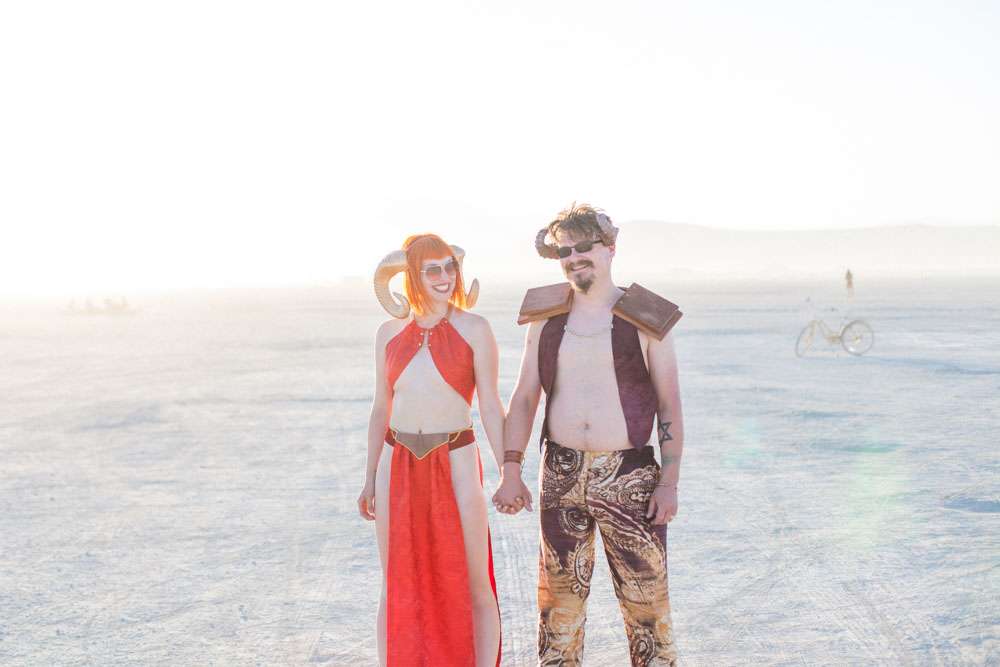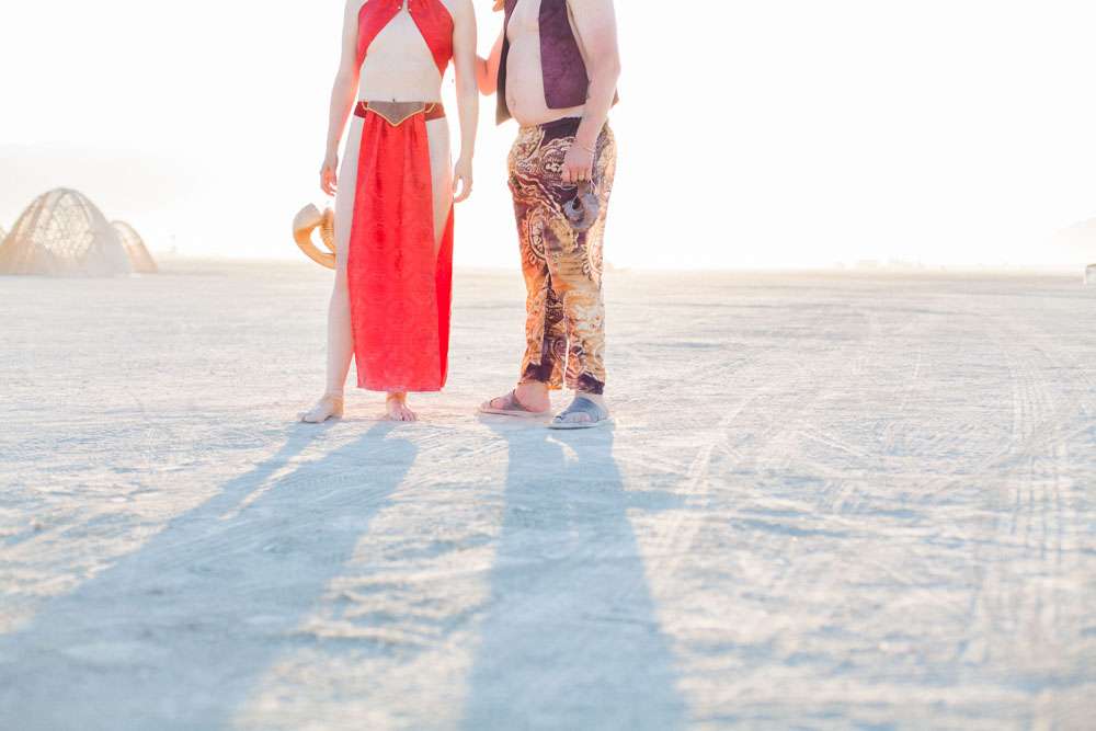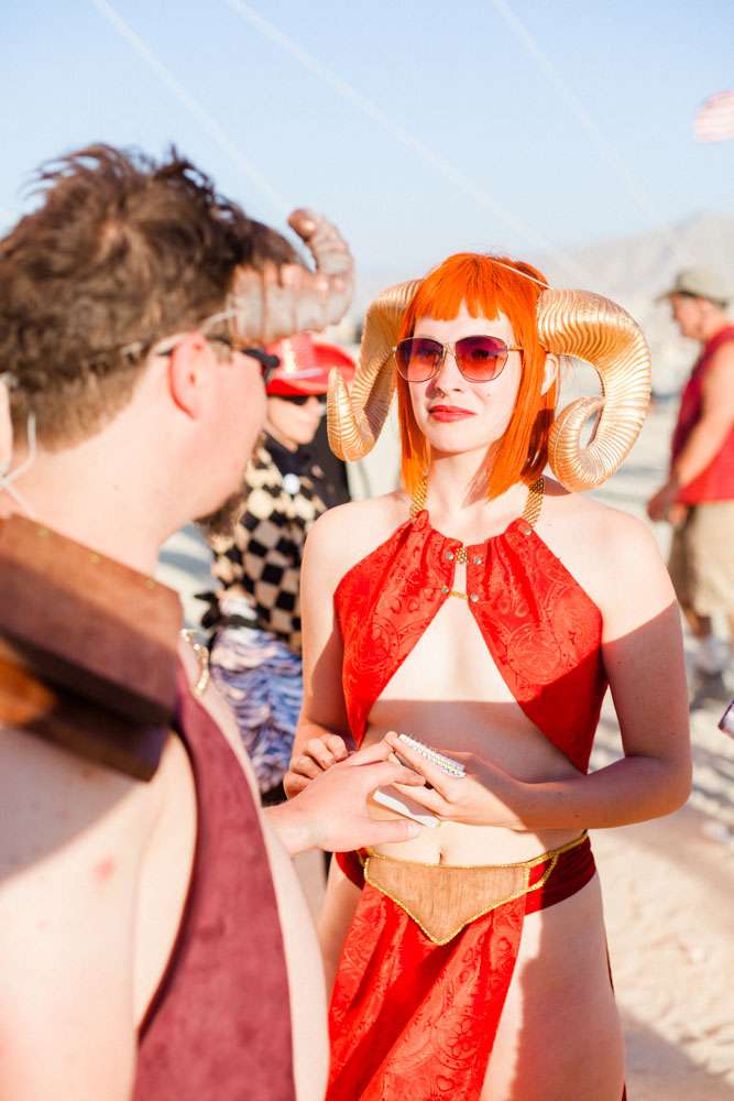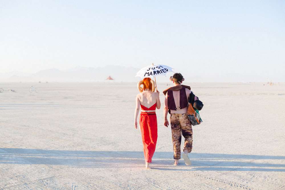 Burning Man is a place where anything goes, so it was the perfect place for Angela and Michael’s to have the wedding they’ve always dreamt of. “We were married at Burning Man so our theme was loosely a mixed interpretation of a royal wedding”, the bride said. “In truth, weddings are rarely just about the bride and groom and we wanted a wedding that was just about us. We already had tickets to Burning Man and had heard about people getting married there so once the idea was put forth it was an easy decision to make. When we told our families our plans they were completely unsurprised. Apparently running away to the desert is completely in-keeping with our personalities and reputation!”