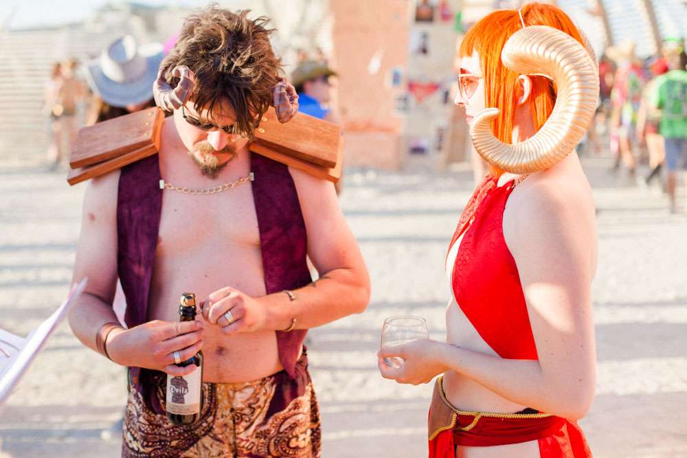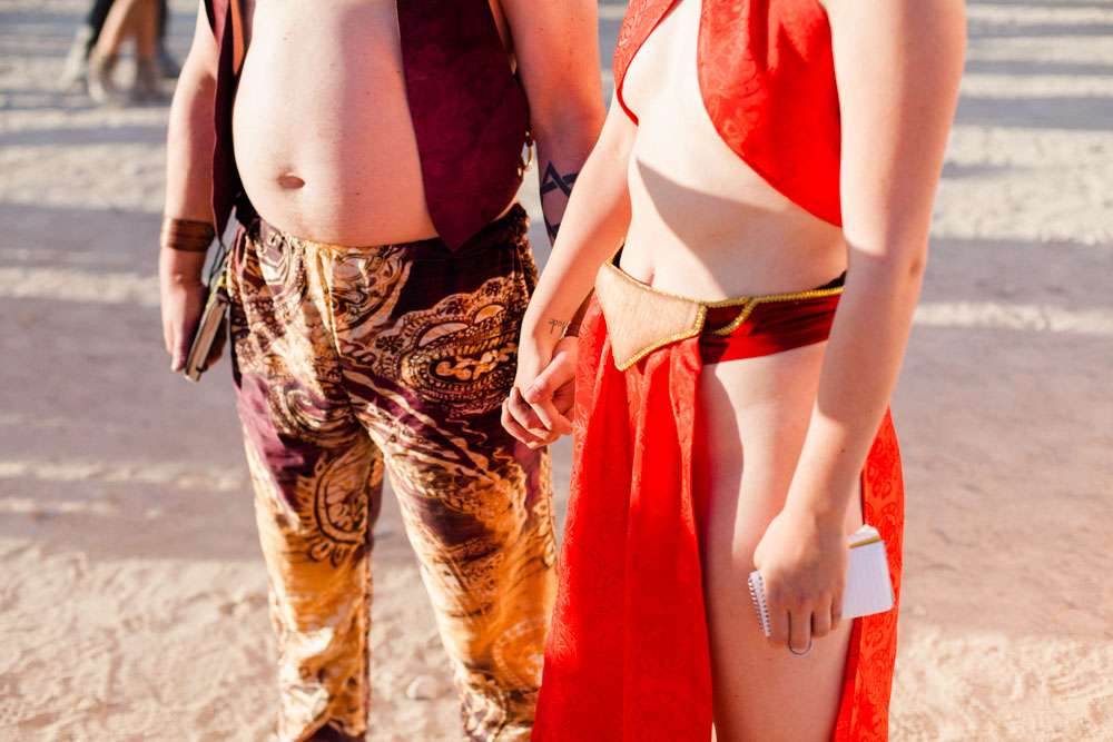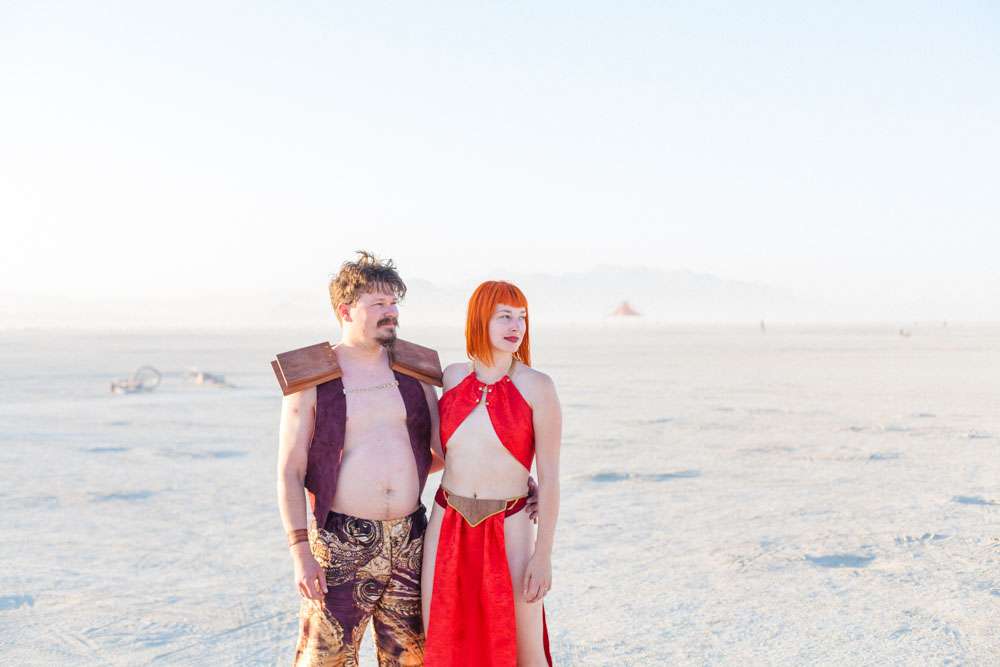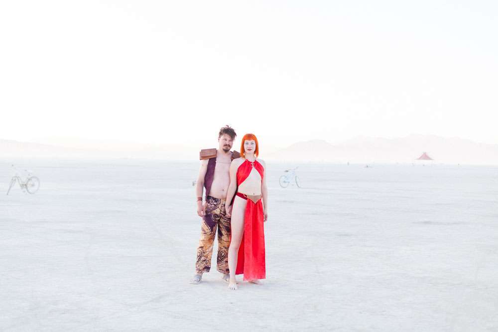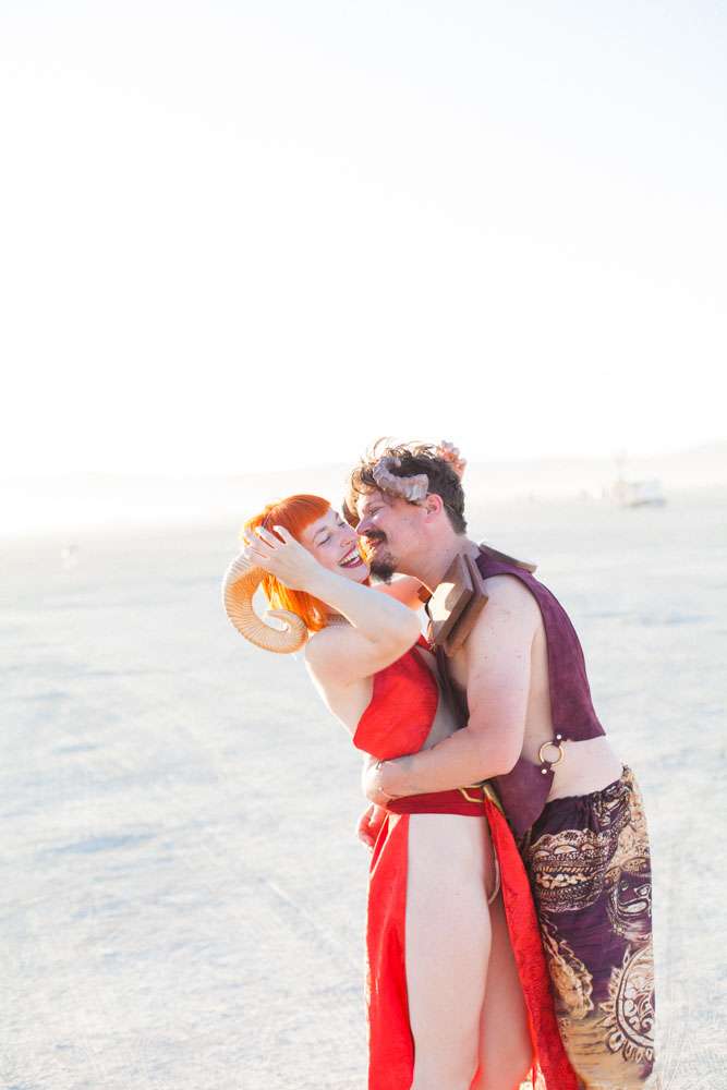 Burning Man is a place where anything goes, so it was the perfect place for Angela and Michael’s to have the wedding they’ve always dreamt of. “We were married at Burning Man so our theme was loosely a mixed interpretation of a royal wedding”, the bride said. “In truth, weddings are rarely just about the bride and groom and we wanted a wedding that was just about us. We already had tickets to Burning Man and had heard about people getting married there so once the idea was put forth it was an easy decision to make. When we told our families our plans they were completely unsurprised. Apparently running away to the desert is completely in-keeping with our personalities and reputation!”
