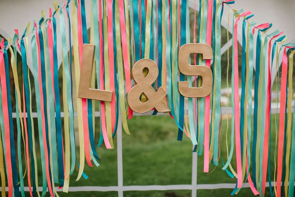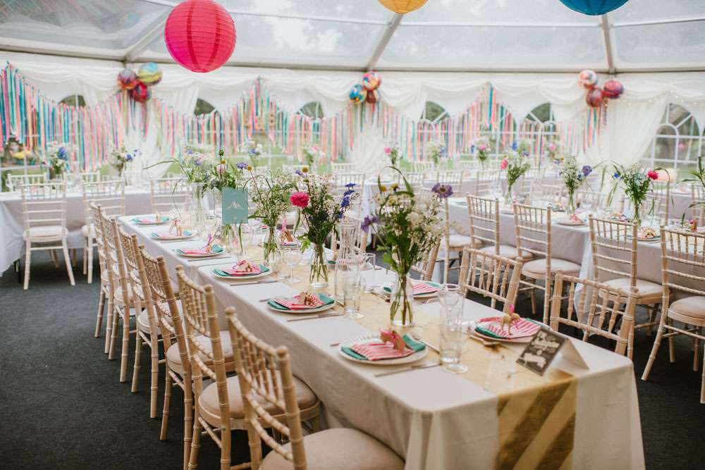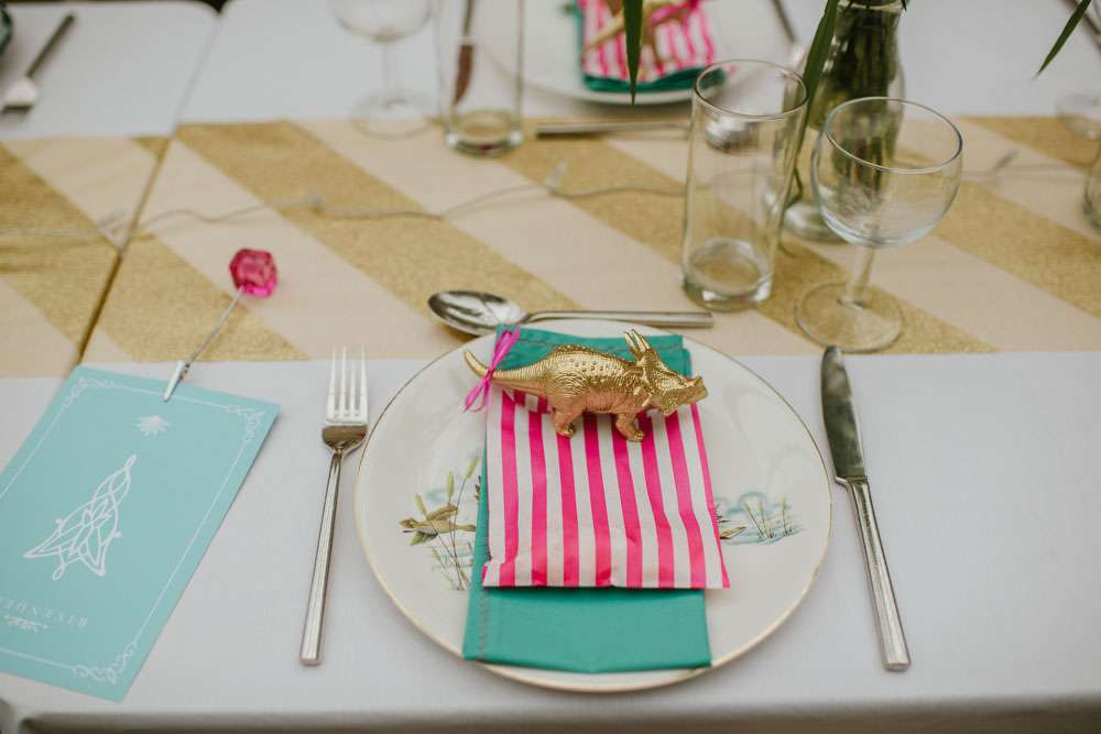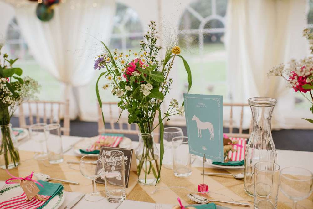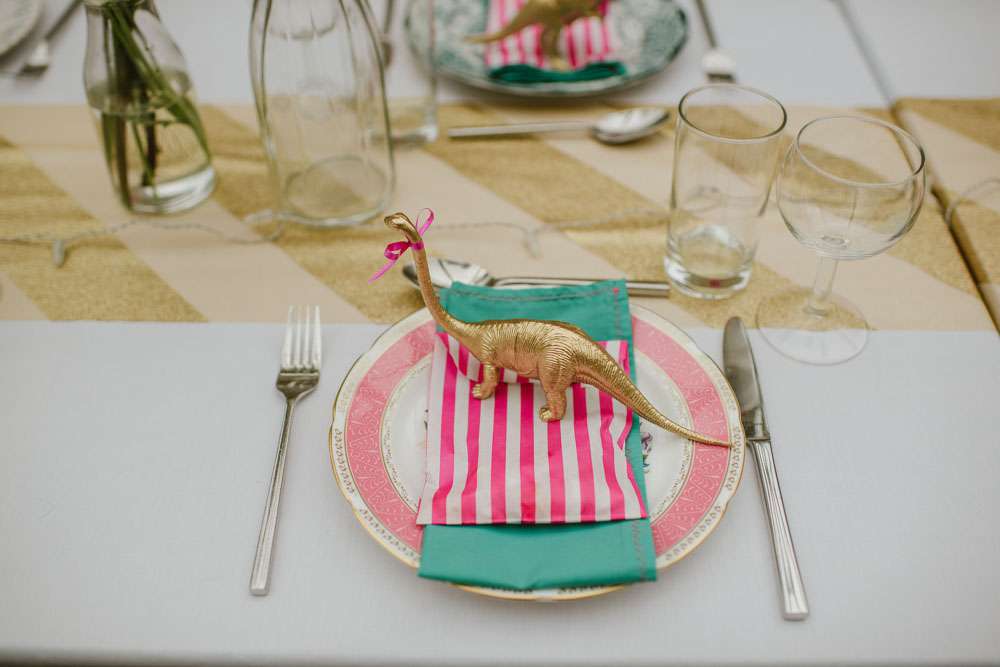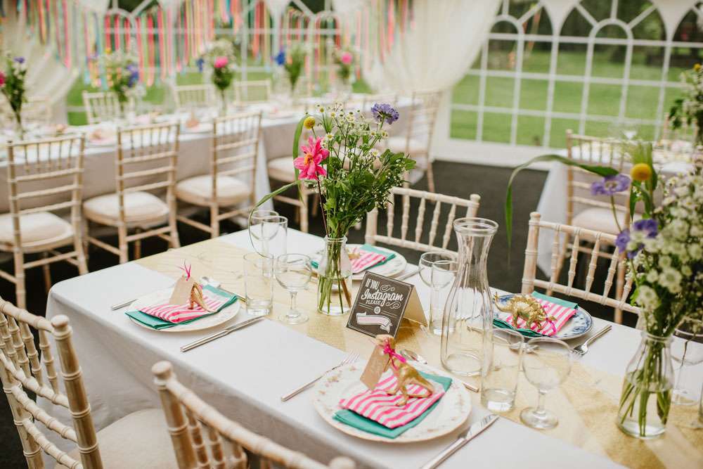 “We did a lot of making and doing too. We made ribbon garlands for the marquee decorations, we made homemade signs for the venue. We also decided to give everyone a hand drawn picture as their favours which we tried to make as personal as possible, this went down really well and made a lot of people smile and laugh. Although it took us hours to draw over 90 pictures it was lovely to see everyone’s faces when they sat down to eat. My Dad also sprayed over 90 plastic dinosaurs gold for our name tags. We made a lot of things and that is why it really felt like ‘our’ wedding because we put so much love and thought into everything.”