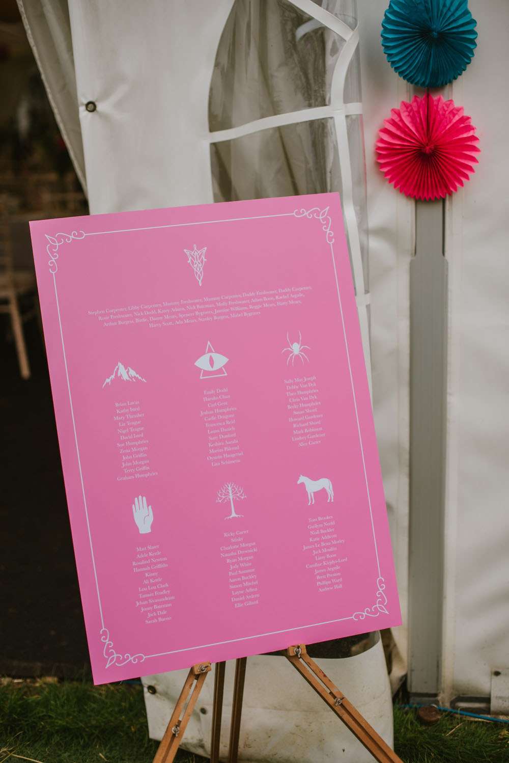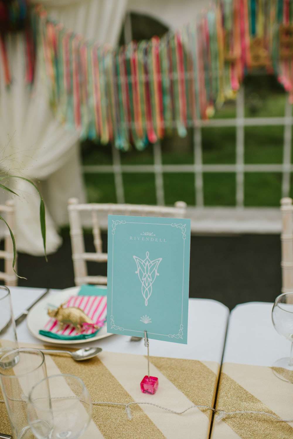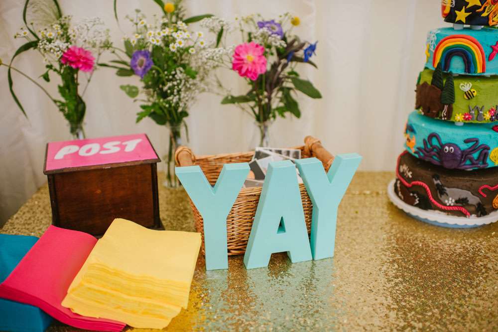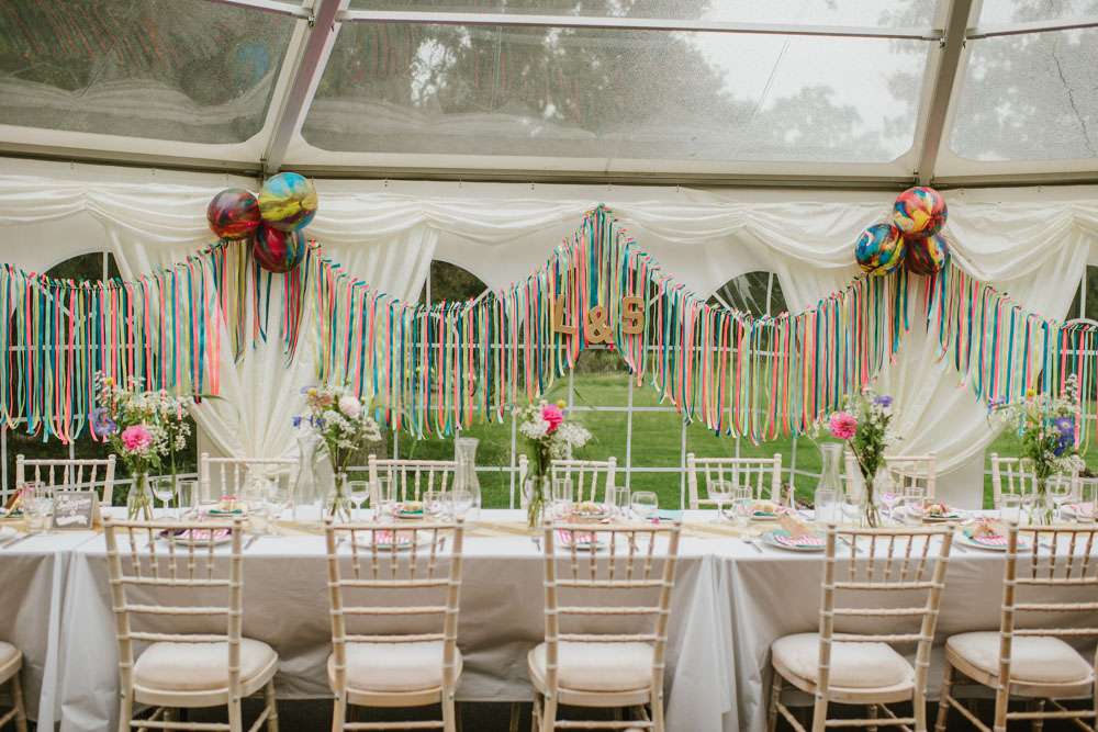 “We did a lot of making and doing too. We made ribbon garlands for the marquee decorations, we made homemade signs for the venue. We also decided to give everyone a hand drawn picture as their favours which we tried to make as personal as possible, this went down really well and made a lot of people smile and laugh. Although it took us hours to draw over 90 pictures it was lovely to see everyone’s faces when they sat down to eat. My Dad also sprayed over 90 plastic dinosaurs gold for our name tags. We made a lot of things and that is why it really felt like ‘our’ wedding because we put so much love and thought into everything.”
