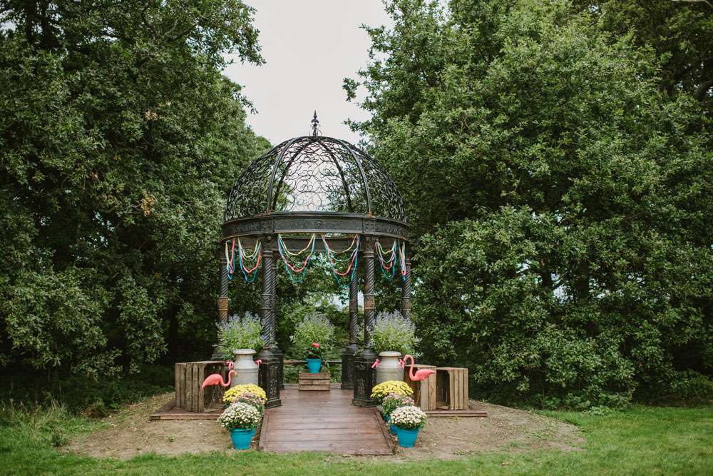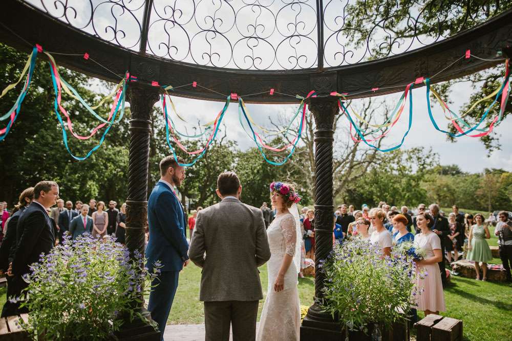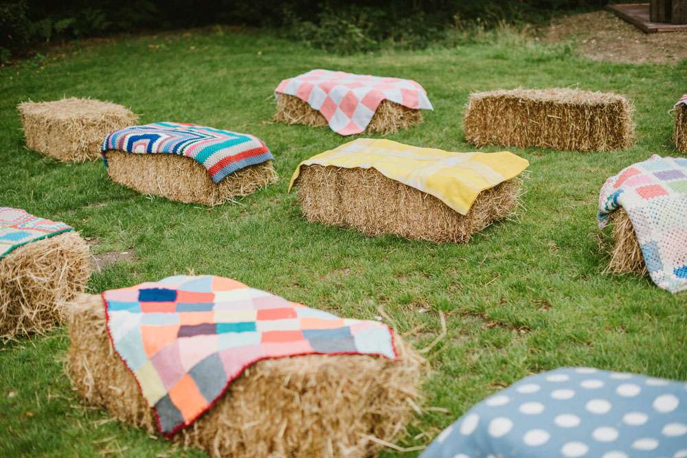 “We were true to ourselves and didn’t have a theme and we created our own ceremony from scratch with our friend Harry. At the venue, they had this beautiful black metal pagoda which we decorated with ribbon and brightly coloured pots with beautiful plants and pink flamingos. Our guests were all sat on hay bales with crochet blankets sourced from various car boots and charity shops. As I walked down the aisle with my Dad and bridesmaids ahead of me to James Vincent McMorrow’s cover of Higher Love the sun came out and apparently dragonflies were flying around the guests! I was oblivious at this point as I must admit I was a little nervous.”