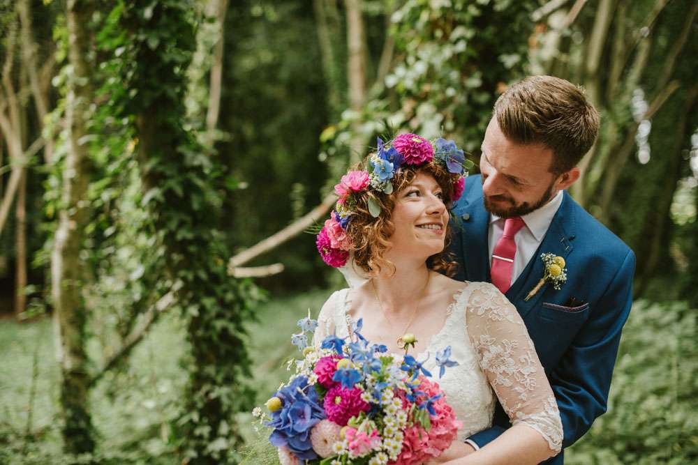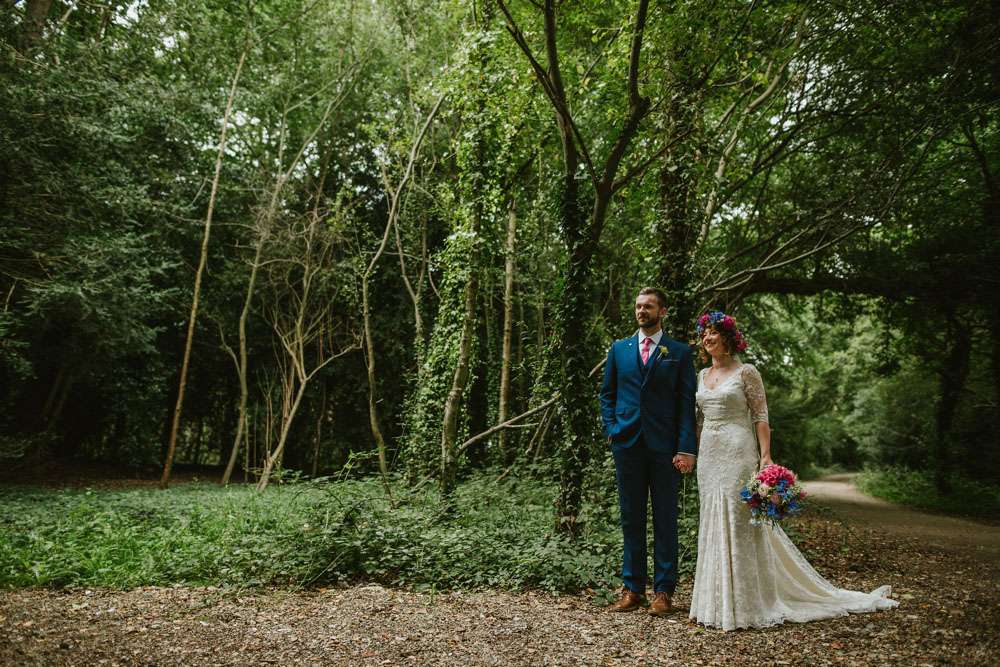 Libby and Stephen were hitched in September at Tournerbury Woods Estate on the Hampshire/ West Sussex border. They didn’t set out to have a theme, but in throwing together all the things they liked it ended up being a super colourful, festival-esque day.