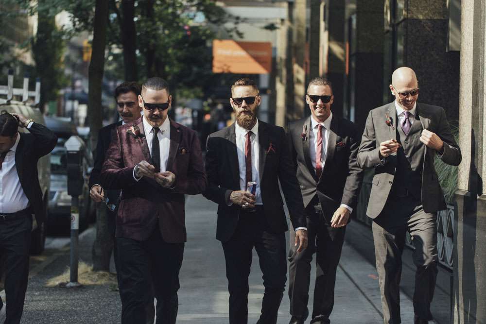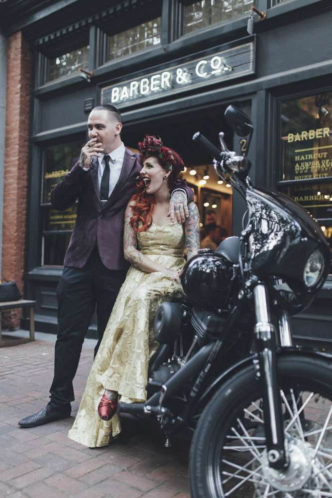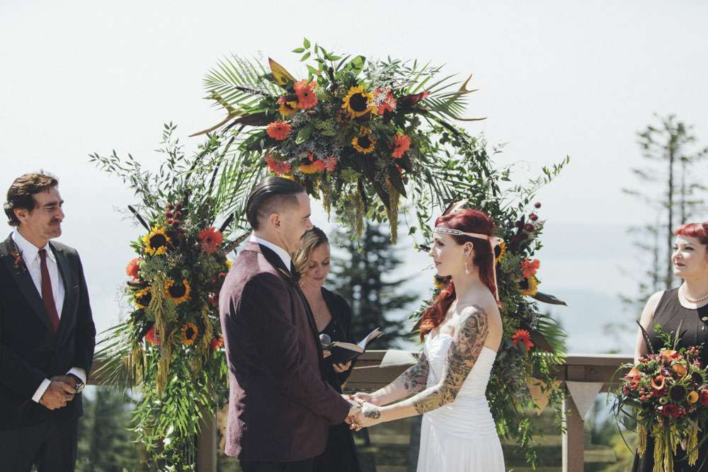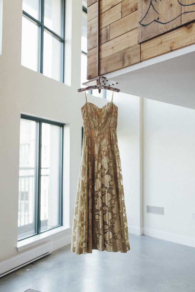 They were married on Grouse Mountain and had their reception at at the Clough Club in Vancouver. The bride’s ceremony dress was vintage and she bought on a trip home to the UK. “I never wanted to get married in white, too traditional, I wanted gold and glitter”, Aisling explained, “but when I tried on this white dress (cliché but the first one) my aunties and mum fell in love. I still couldn’t wrap my head around a white dress though, so we kept looking and that’s why we ended up with two dresses one white and one gold! I couldn’t let go of the white dress so it became my ceremony dress. It was gorgeous, simple, bright white and it fitted so perfectly. My evening outfit was vintage gold culottes which I had altered into a strappy number perfect for a Vancouver summer wedding. It was the perfect dancing outfit.”