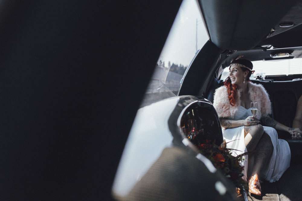 “Location was everything for us. The daytime location was bright and open, natural and outdoors, we were on top of a mountain on top of the world overlooking our favourite city. I was in my white dress with my ostrich feather shrug, with my glittery shoes and 1920s headdress sparkling in the sun. We served fruit platters, charcuterie plates, salmon, champagne and punch. The night time location was warm and cosy with low lighting, candles and twinkle lights. The Clough Club is in the heart of Gastown, our favourite spot in Vancouver.”