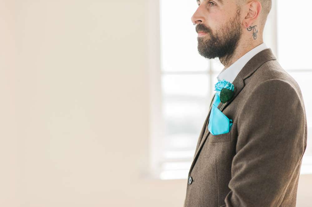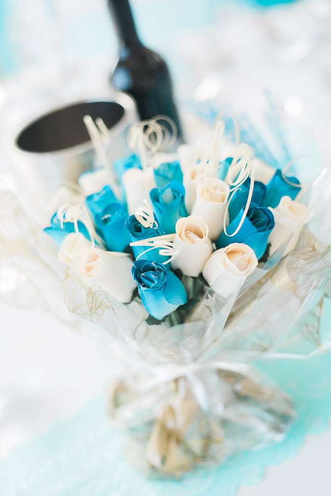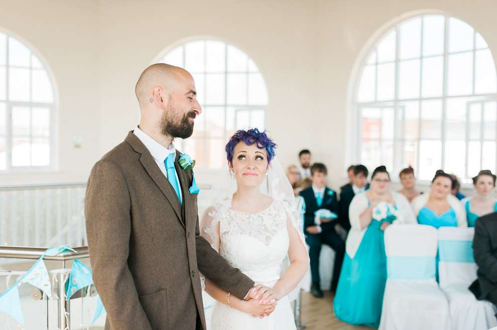 The couple’s wedding budget was £8000. They managed to save money by doing their own décor. “We sourced various turquoise patterned materials from local fabric shops for bunting”, Claire explained. “A friend of ours made them for us. Almost everything else was from eBay. It was really fun sourcing vintage turquoise items online and was my hobby for the majority of a year!”