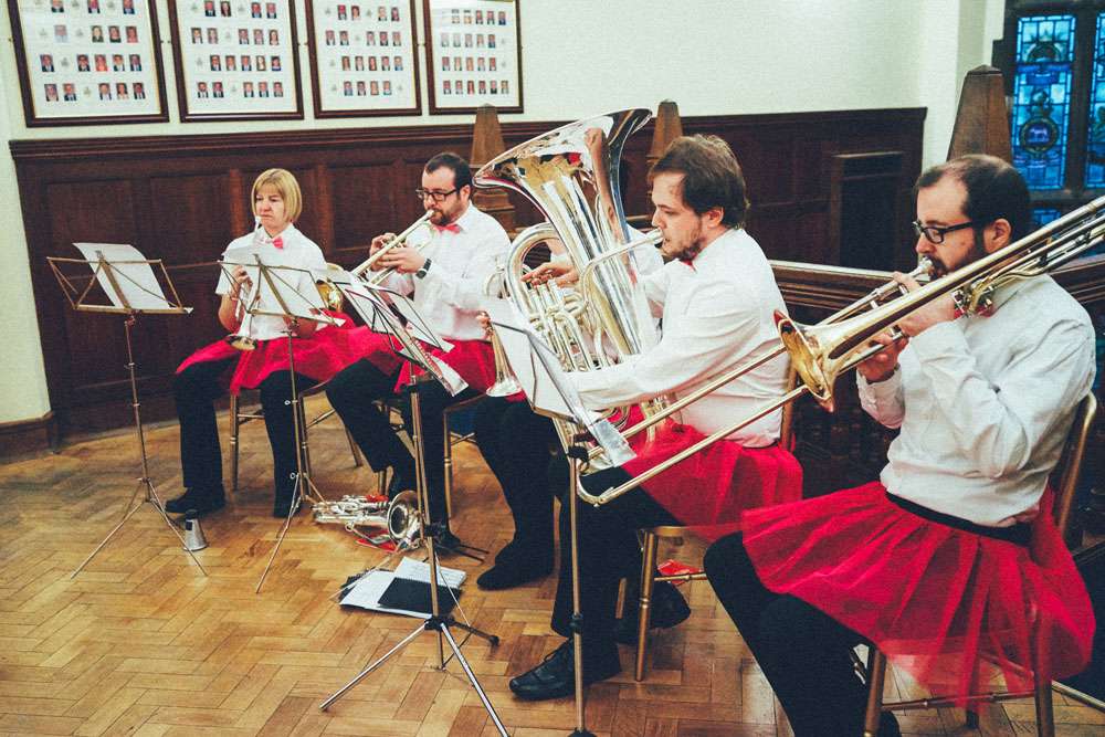 The wedding was held in a school. “For the ceremony, we were inspired by Hogwarts”, she continued, “but with rainbows! We had a rainbow of balloons framing the aisle. Following the vows, the bride and groom walked out to a brass band dressed in pink tutus and bow ties who played songs such as You Got a Friend in Me from Toy Story. The guests then enjoyed cocktails and entertainment by mime artists and stilt walkers before moving on to the reception room. Eight big tables were set out, each in a theme of Cosatto pattern.”