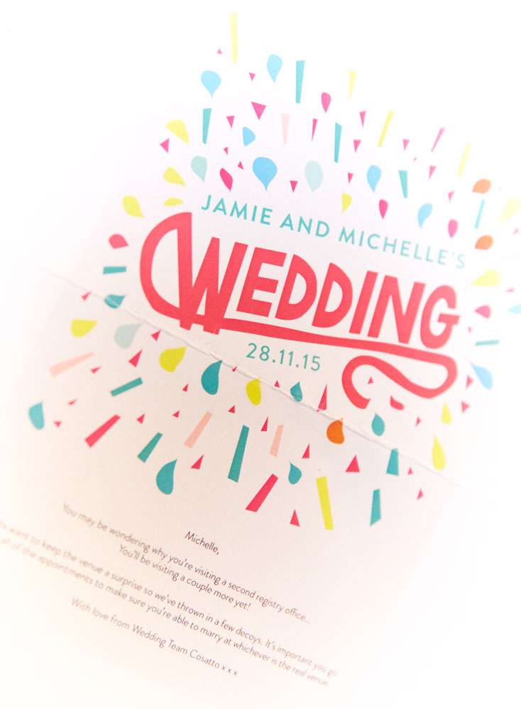 Inspired by the TV show Don’t Tell the Bride, Michelle and Jamie’s wedding was organised as a complete surprise for them by the bride’s employers, Cosatto, who make brightly patterned pushchairs. Inspired by their products, and the bride’s own colourful aesthetic, the team pulled together a truly one-of-a-kind wedding!