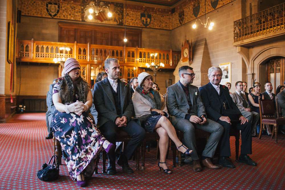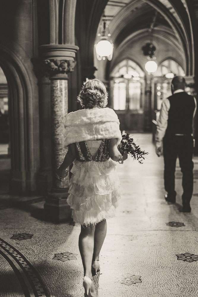 “A lot of 1920s themed weddings are very glam, more along the lines of The Great Gatsby. As much as we love that film, we felt that our characters and northern heritage needed more of an edge, especially against the industrial and slightly grey backdrop of Manchester. Neither of us like being the centre of attention unless it’s for being daft, so wanted a smaller wedding with everyone feeling involved by being dressed the part. Rich wanted the Peaky Blinders look and maintains that it was his overcoat and Grandfather’s pocket watch that made his outfit.”