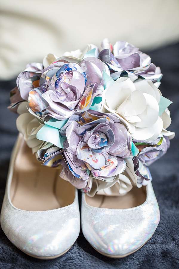 “I figured out how to make paper roses out of Disney wrapping paper and made my bouquet before we’d even set a date for the wedding. I also ended up making my tiara after seeing some similar ones online that were beautiful but totally out of my price range. George covered a couple of garden obelisks with fairy lights, twine and fake leaves to put on the stage. It was the only thing he made but they looked damn good! Our Beauty and the Beast backdrop wasn’t DIY as such, we had it printed by a company in China for the small sum of £10!”