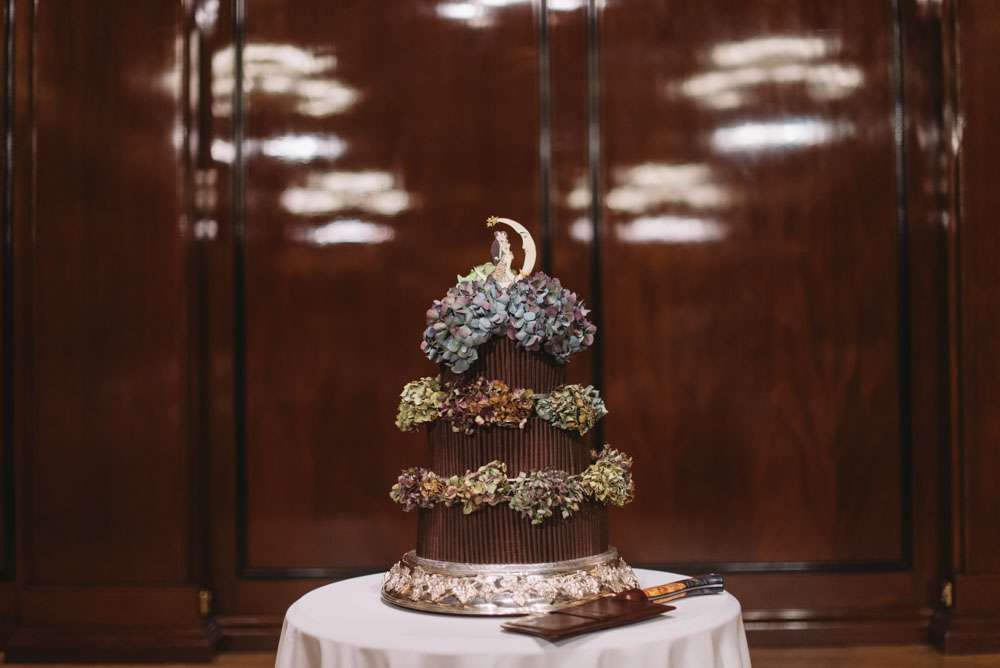 “The décor we had wasn’t typical wedding either as we we weren’t keen on traditional wedding themes. We made a lot of things ourselves like the gold pumpkins and the name cards. We also hand-painted black feathers gold to stick on our menu cards. The little details were everything! Jordan is butcher so he had a specialist in America, AK Custom Knives, make a butcher cleaver for us to cut the cake with! Jordan designed it with their help and also got our wedding date and new name engraved into it.”