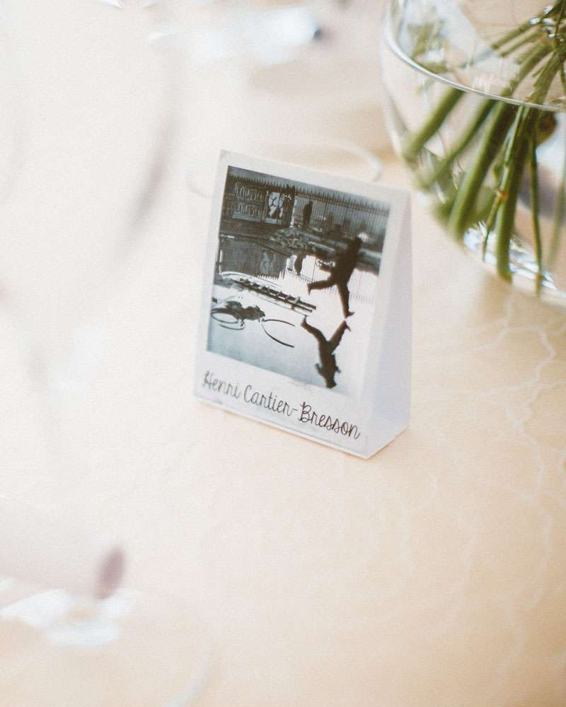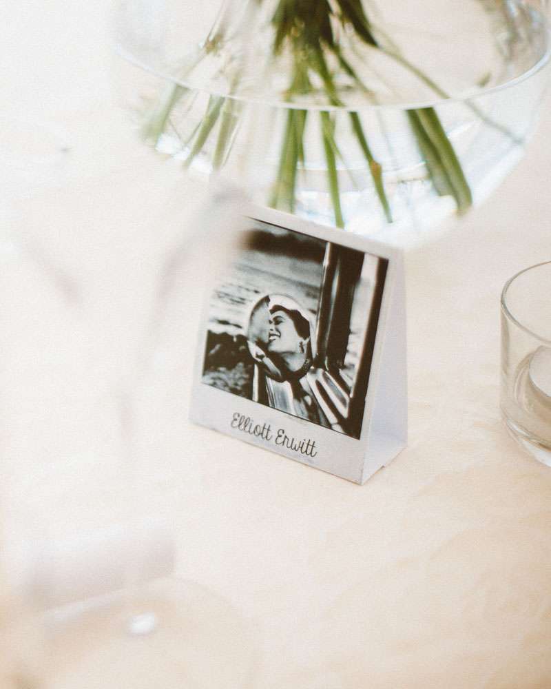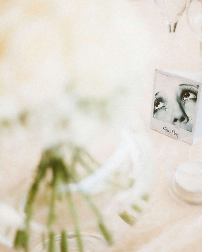 “We were inspired by black and white photography for our wedding”, said the bride. “I am a photographer and we share a passion for it so it made sense. I wore a black and white dress and our tables were named after some of our favourite photographers. Our invitations were the ‘film’ of 35mm rolls.”