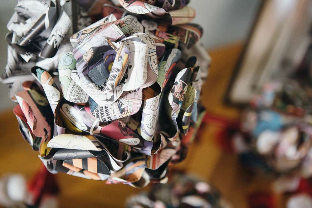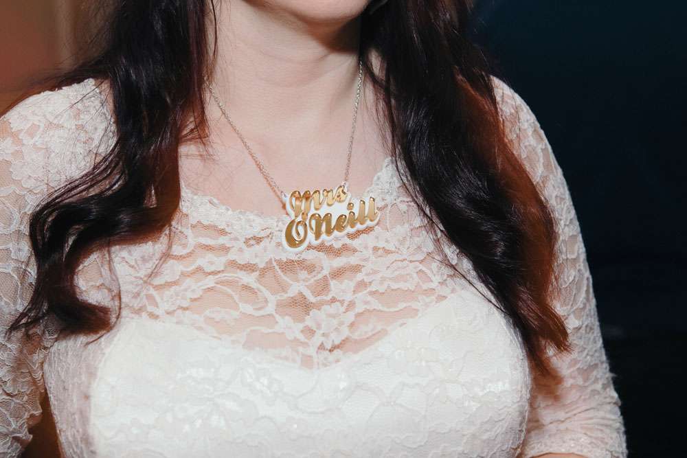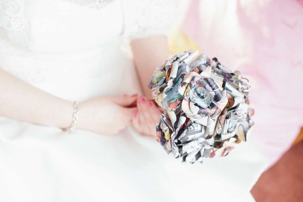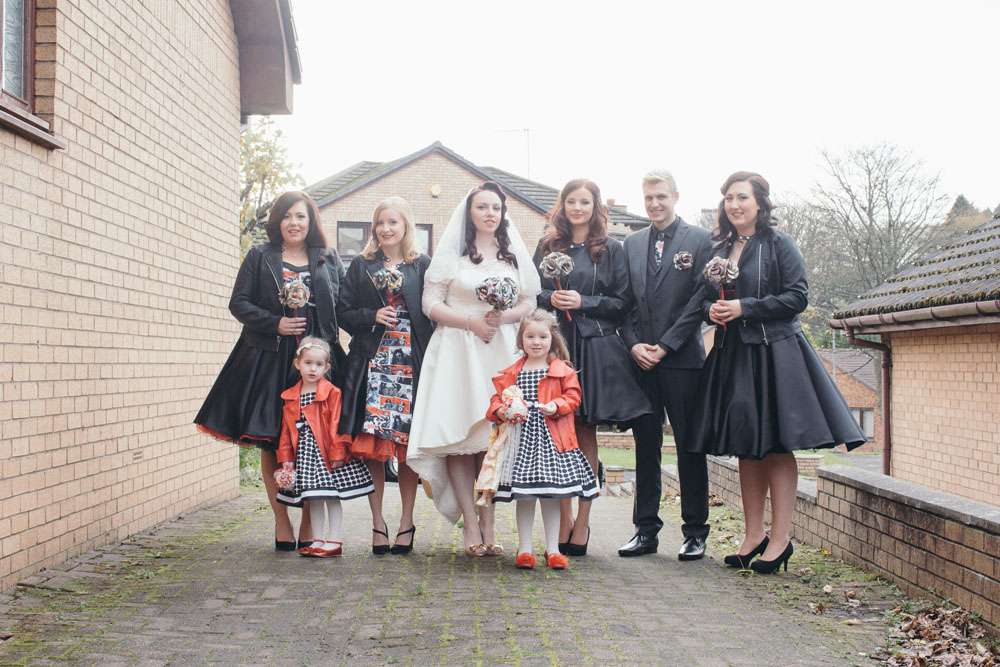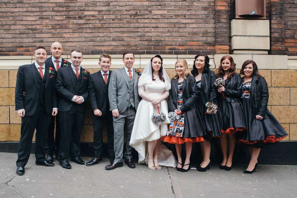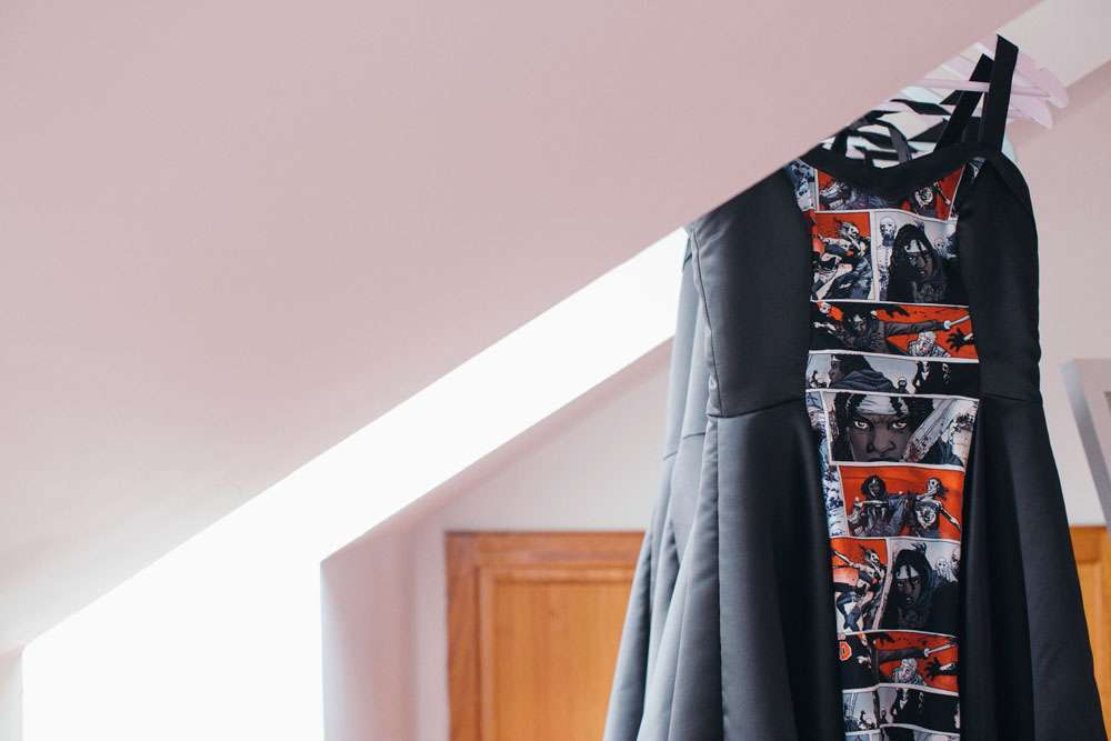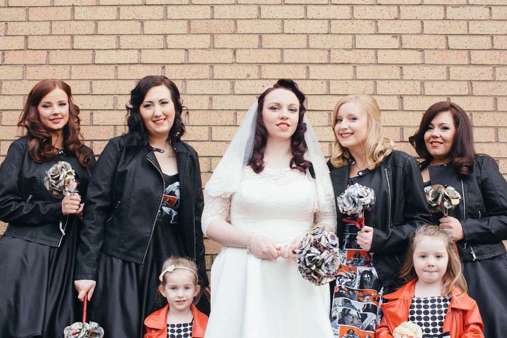 Other unique details included the bride’s paper flower bouquet made of comic books and the bridesmaid dresses which were from Miss Lottie Lou using a fabric with scenes from The Walking Dead on it. “My dress was actually a top and two skirts by Miss Lottie Lou. My main outfit was inspired by Kelly Osbourne’s high low dress at the 2015 Oscars. In the evening I changed into the shorter skirt and had a ‘Mrs O’Neill’ necklace and ‘Mandy & Ally’ earrings from Sugar & Vice and a leather jacket from New Look to which I added Foo Fighters patches!”