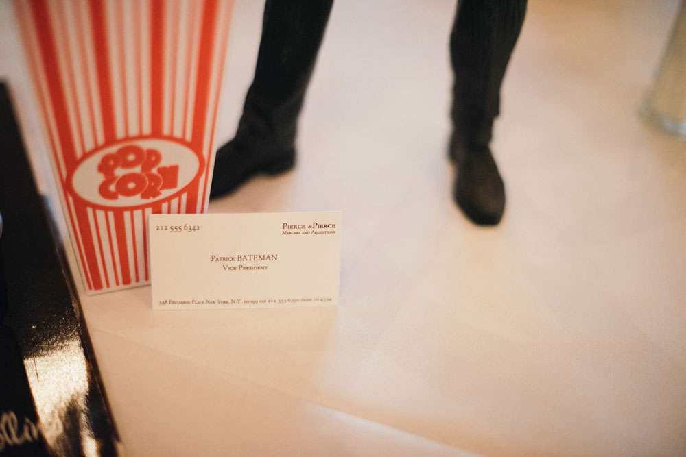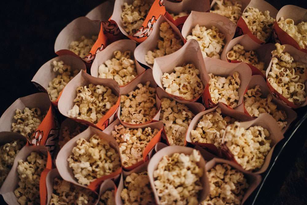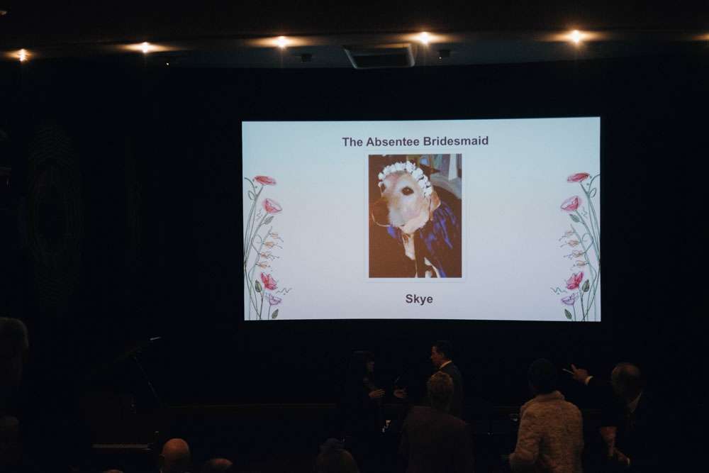 “Prior to my arrival the ushers handed out popcorn cones and we played a slideshow of the bridal party which included a picture of the absentee bridesmaid, my dog Skye. This was followed by a short clip from Muriel’s Wedding of Muriel walking down the aisle to ABBA. We then played another short clip from 10 Things I Hate About You of Heath Ledger singing ‘Can’t Take My Eyes Off You’.”