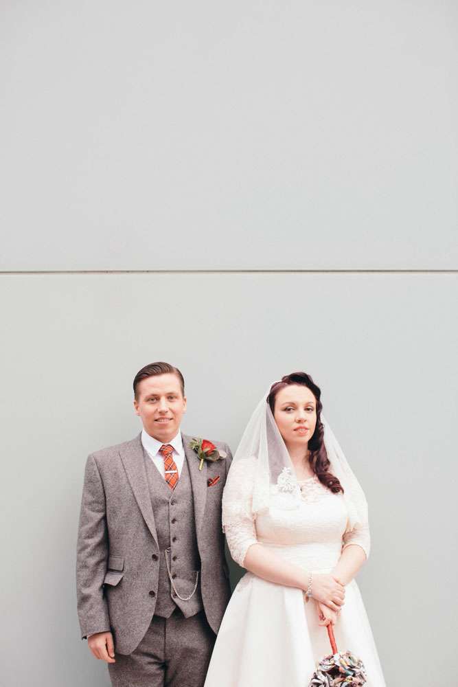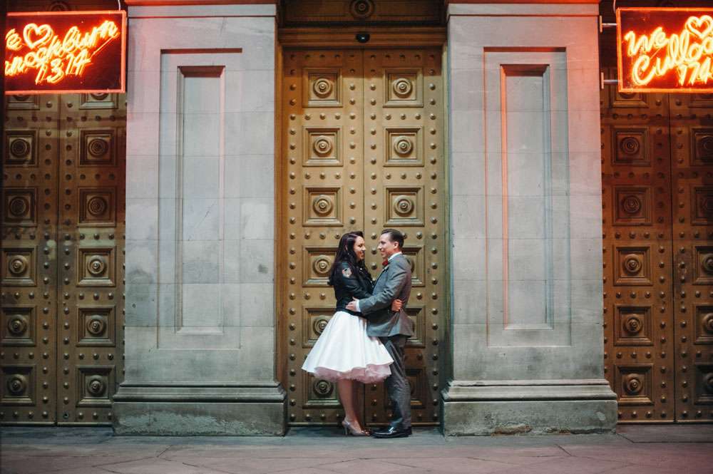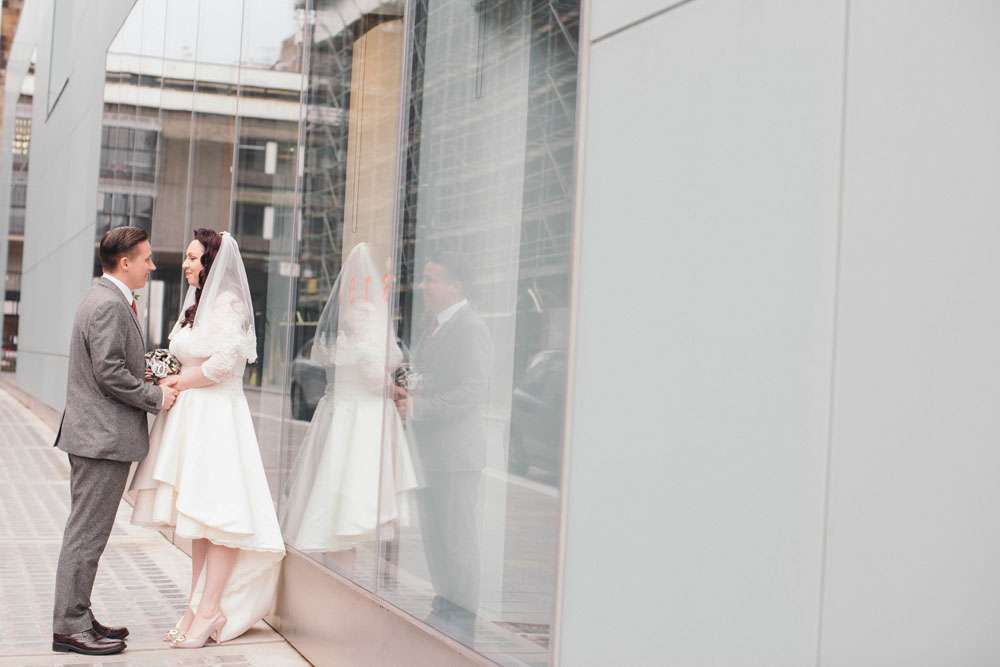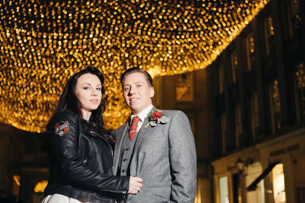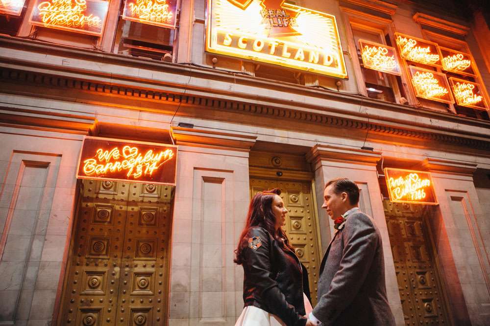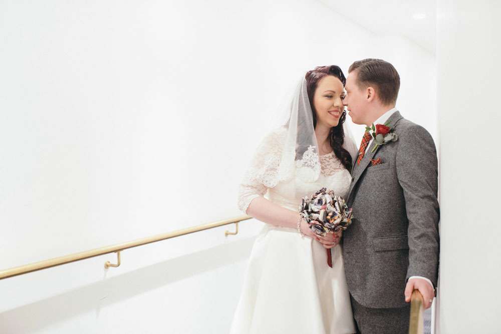 “I honestly don’t think we would have had a wedding like this if it wasn’t for Rock n Roll Bride”, began Mandy. “Before I found this blog I was thinking it would be in a chapel followed by a meal at a hotel. Whilst this is lovely for some people, it just didn’t feel right for us. We’re both huge movie buffs and go to the GFT every Christmas to watch It’s a Wonderful Life, so when we were looking around for the perfect venue I felt like I had nothing to lose by asking if we could use the cinema. To my surprise, they said they’d hosted a few weddings over the years and, thanks to the great Scottish law, we were legally married there!”