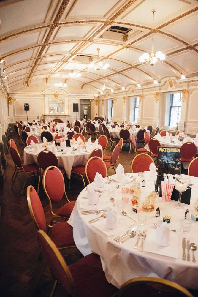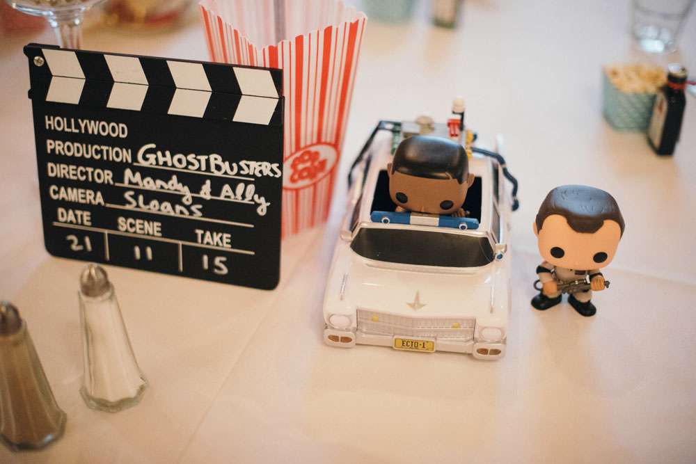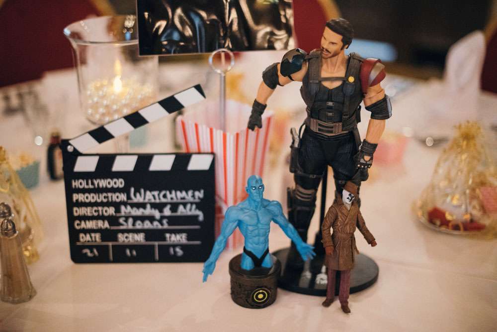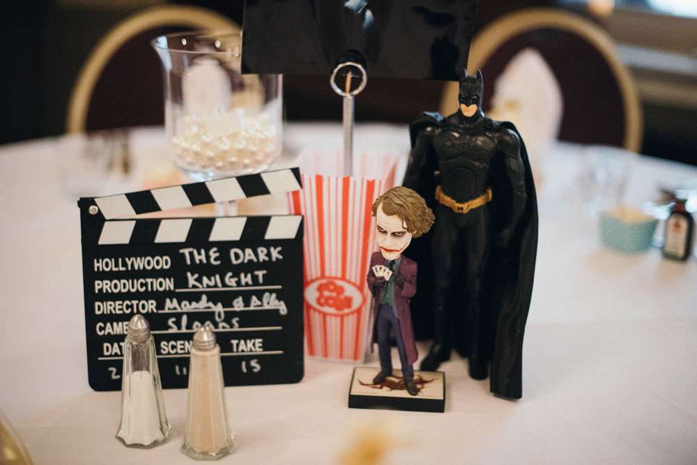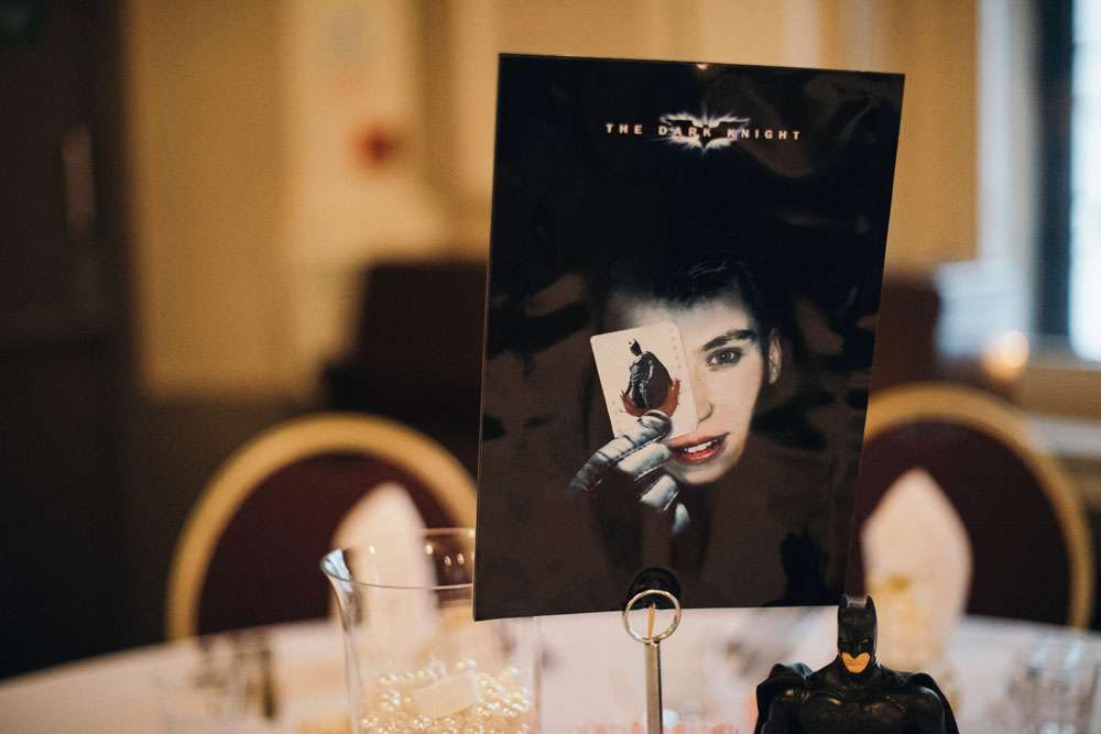 The reception was completely decorated by the couple, using all their own movie memorabilia from home. Their tables were named after some of their favourite films. “All the centrepieces were from our personal figurine collection apart from vases which were bought from Home Bargains. We made a videotape table plan and the movie table posters, using our faces in place of the movie stars, were made for us by a friend. The top table was It’s A Wonderful Life.”