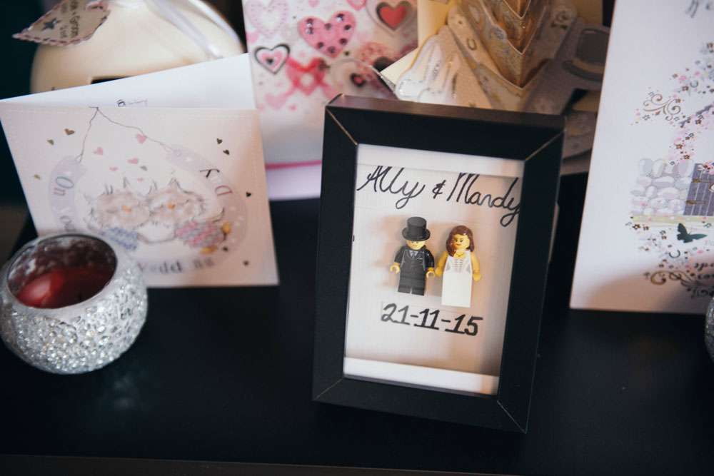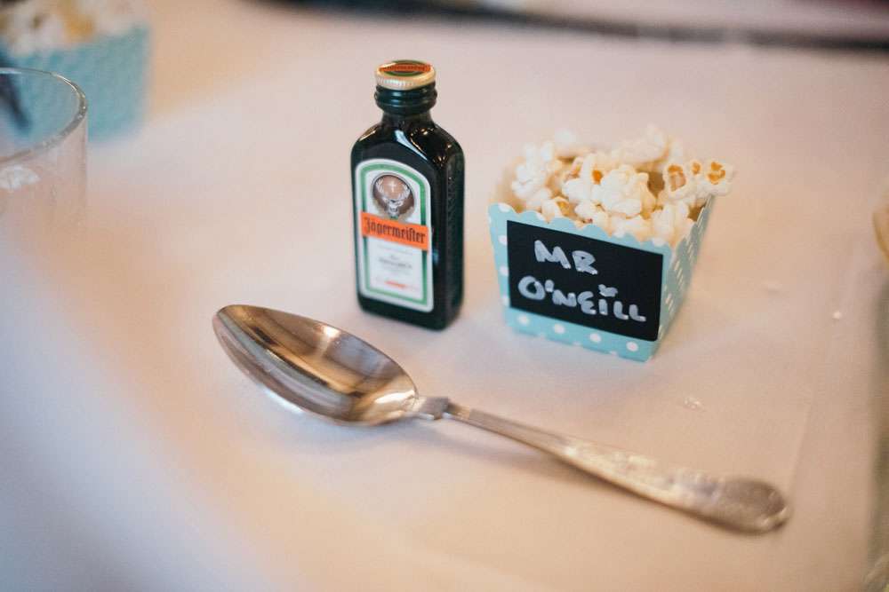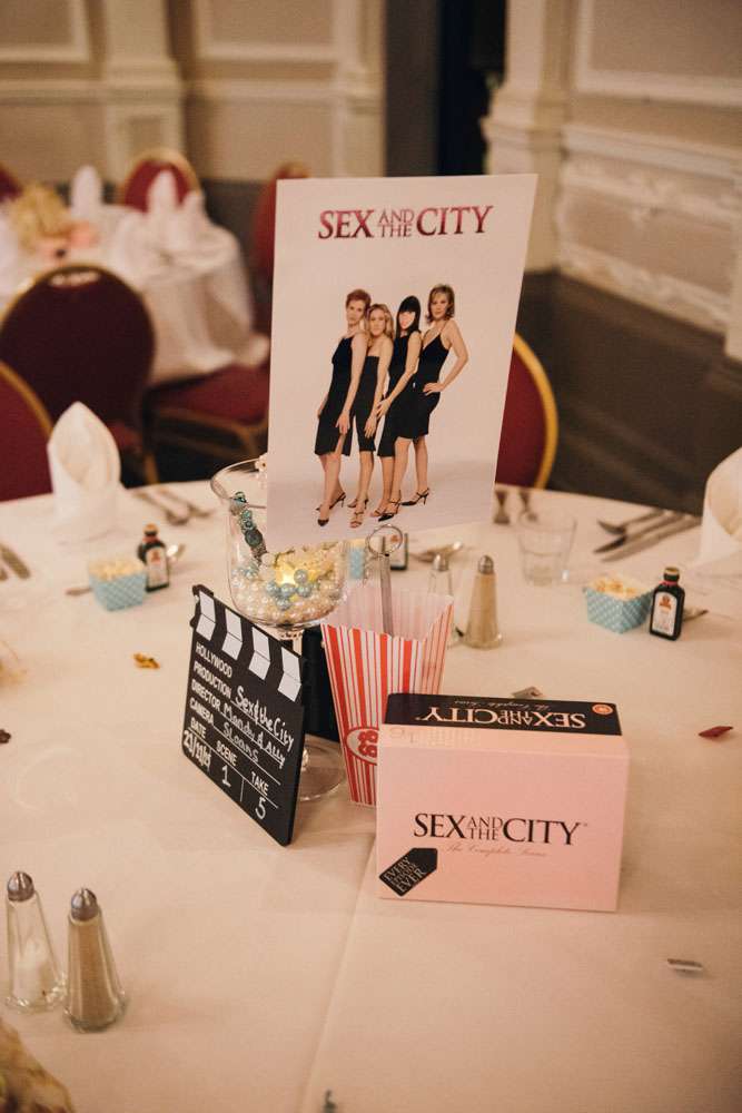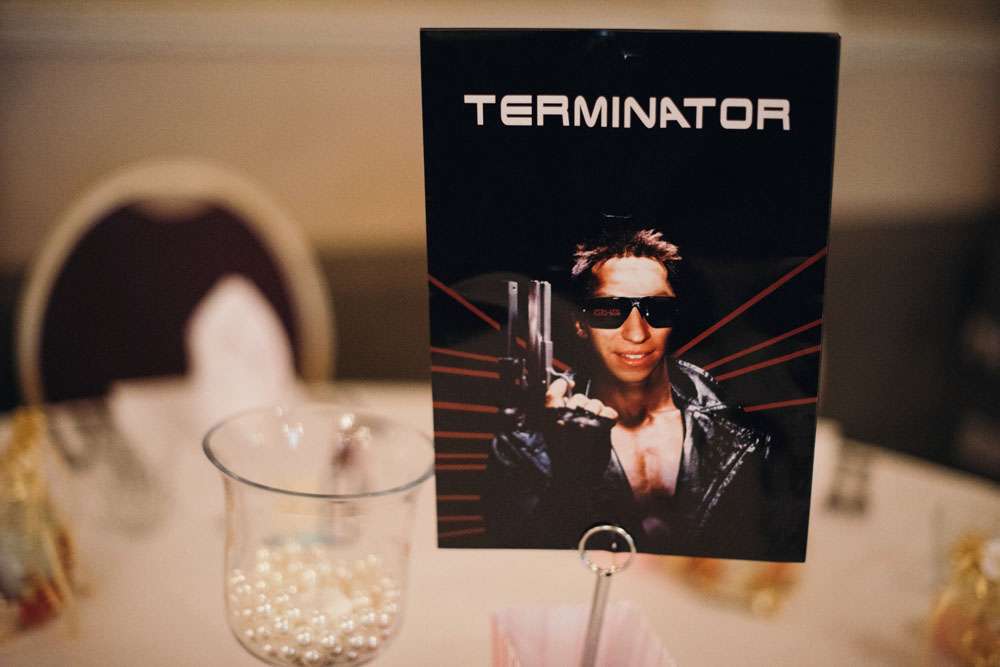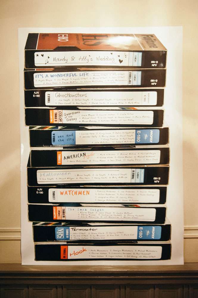 The reception was completely decorated by the couple, using all their own movie memorabilia from home. Their tables were named after some of their favourite films. “All the centrepieces were from our personal figurine collection apart from vases which were bought from Home Bargains. We made a videotape table plan and the movie table posters, using our faces in place of the movie stars, were made for us by a friend. The top table was It’s A Wonderful Life.”